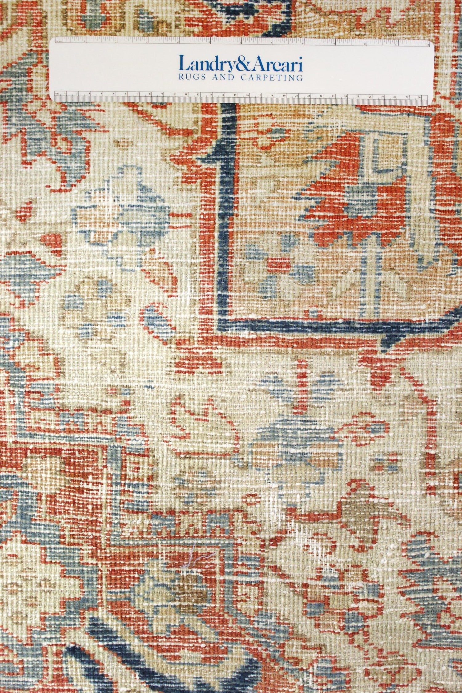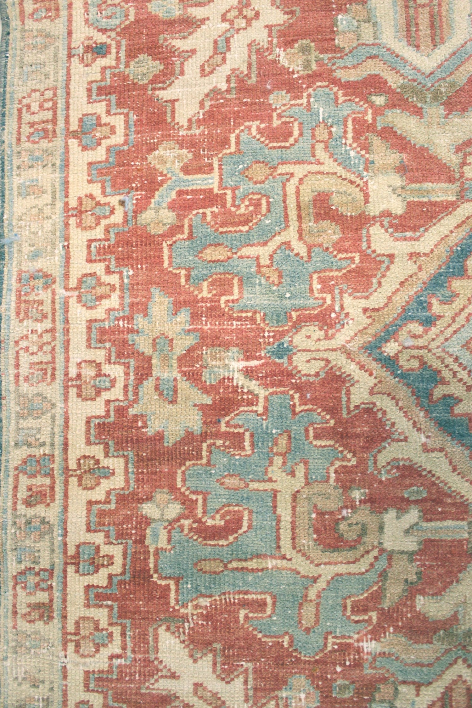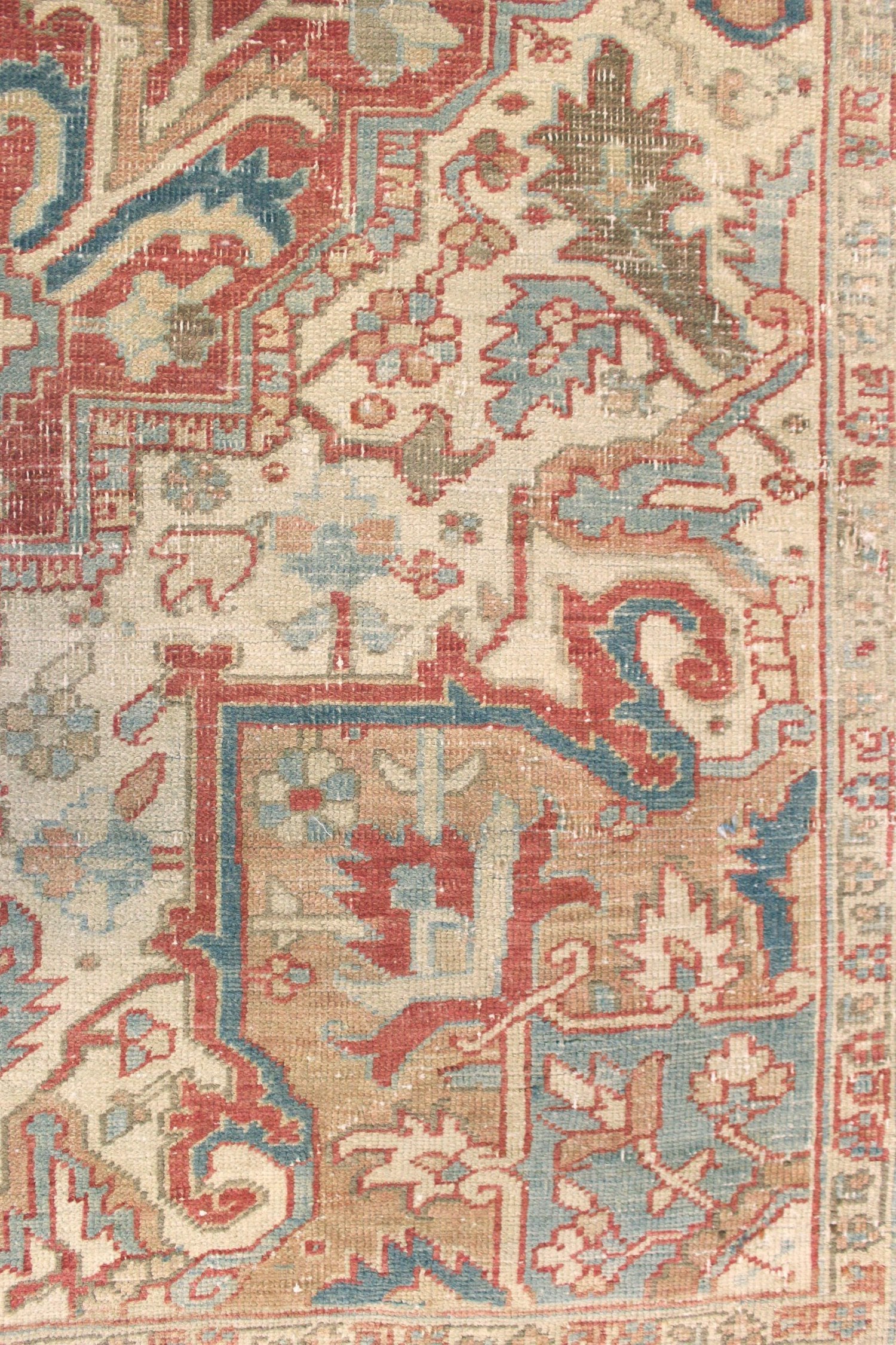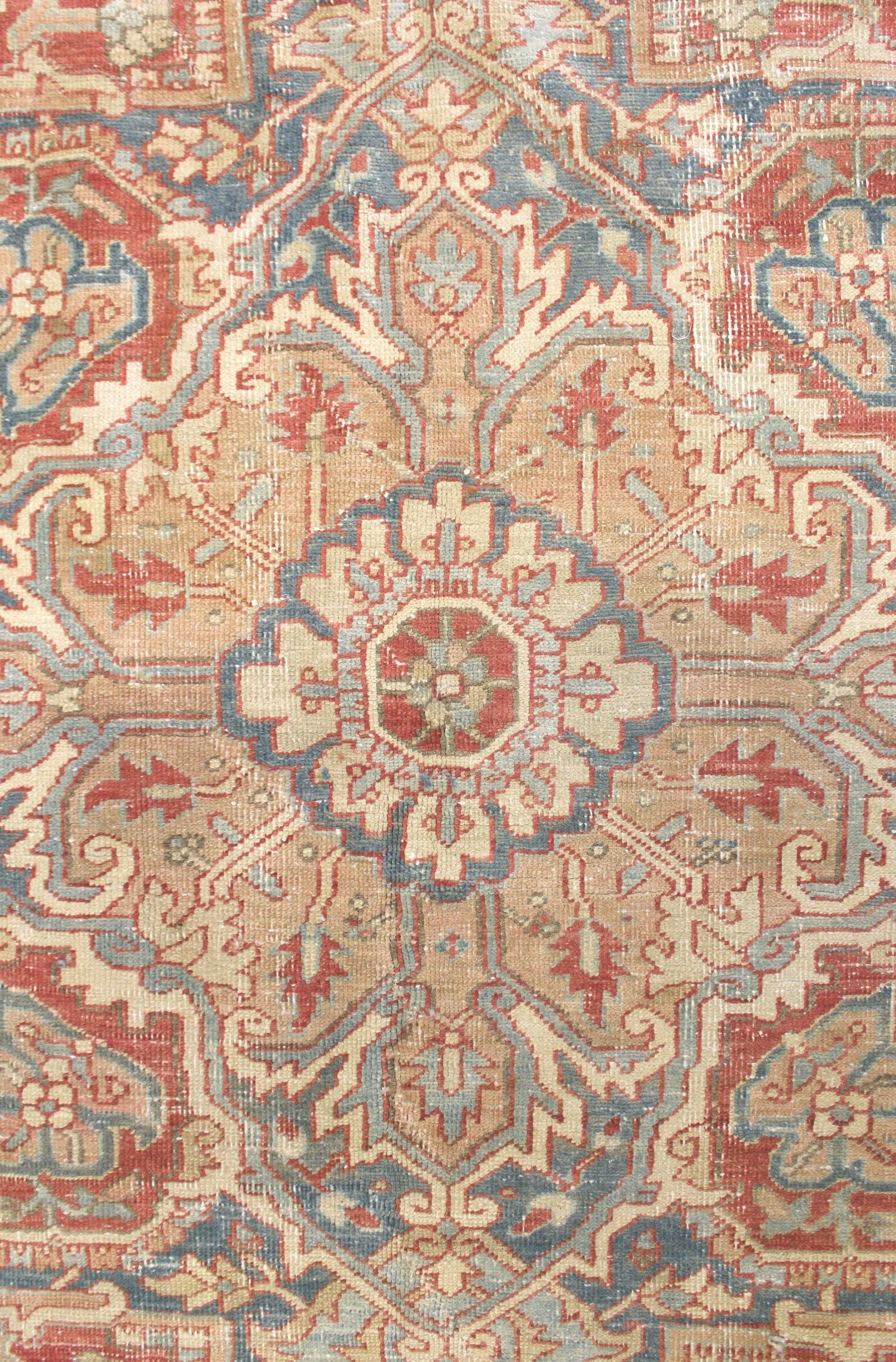 The craftsmanship reflected in this rug is of high quality, evident through its fine weave, creating an enduring, dense pile on the rug, a signature feature of the Heriz design.
