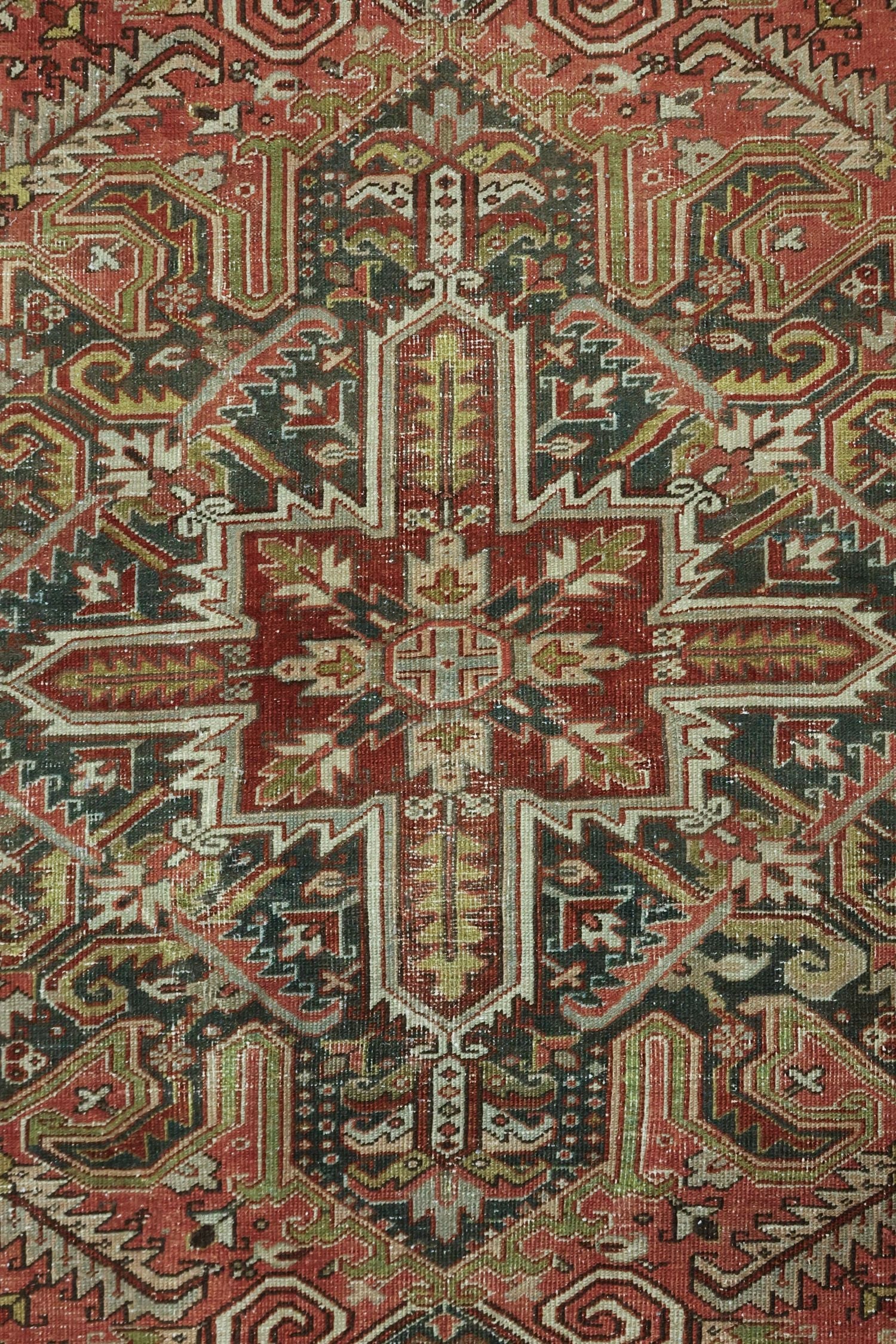 The rug under discussion is an antique piece of Persian origin, presented in the Heriz design, a distinctive style commonly associated with tribal craftsmanship. Its background exhibits a shade of coral, wherein the main color of the rug surfaces as red. The rug's vintage appeal is further complemented by its content - wool on cotton, lend it an added layer of authenticity. Unique in its craftsmanship and unraveled in its beauty, this rug represents an era of the 1920s, offering a glimpse back into its interesting history and culture.