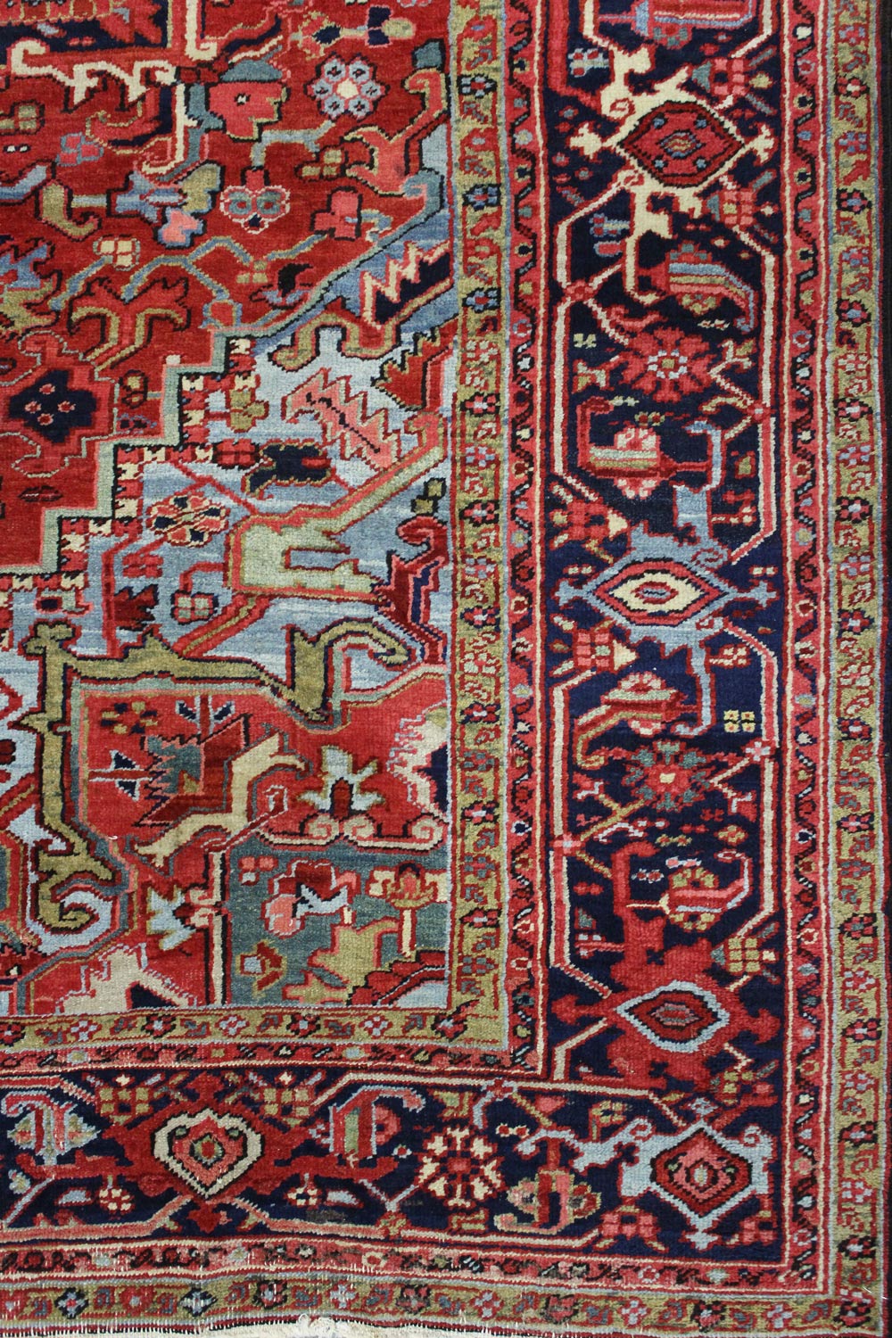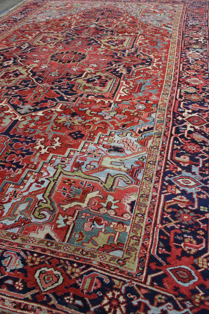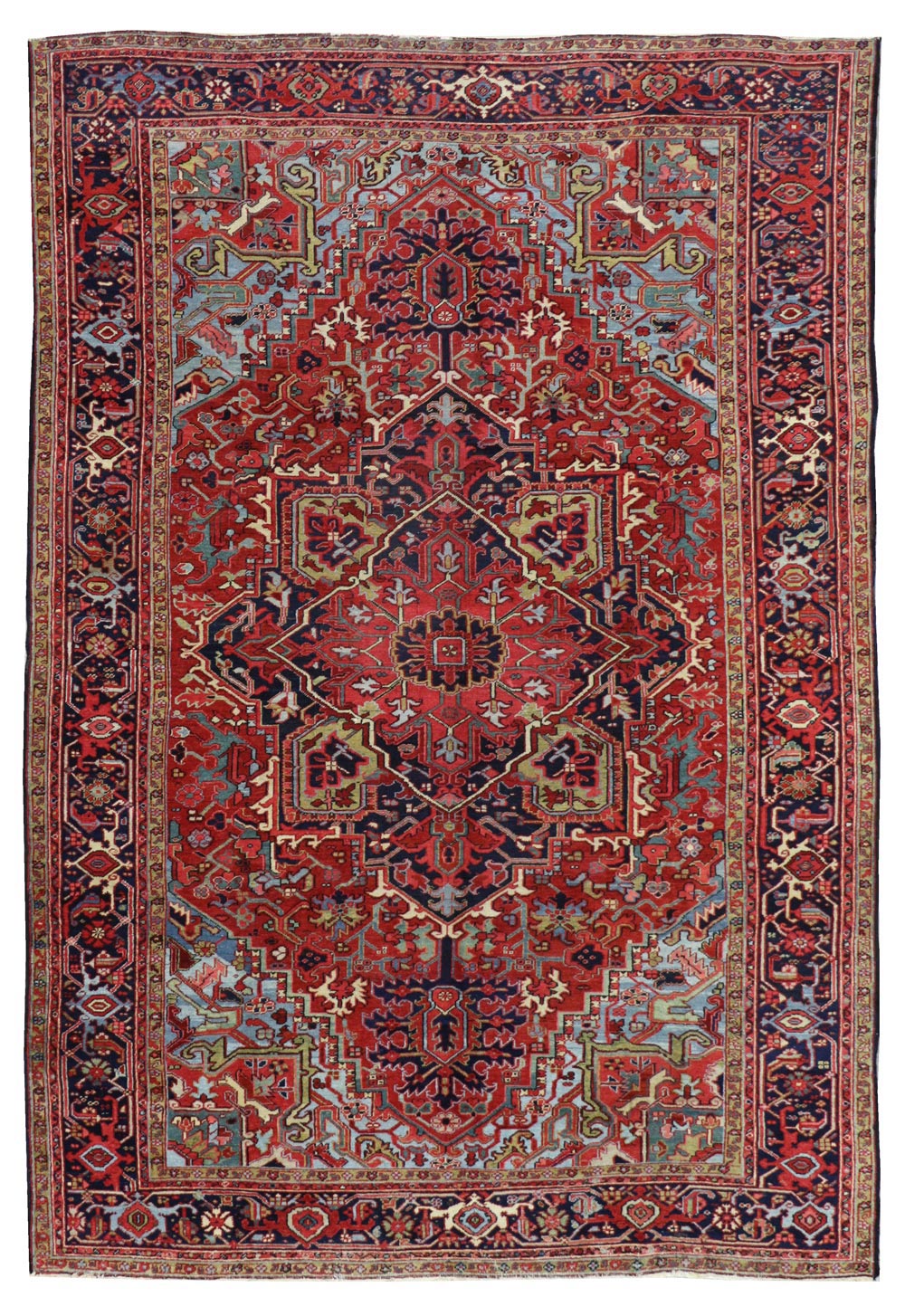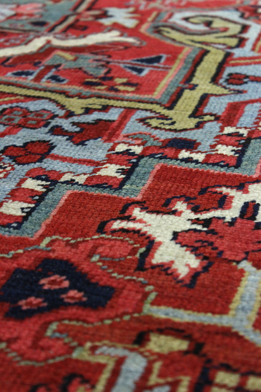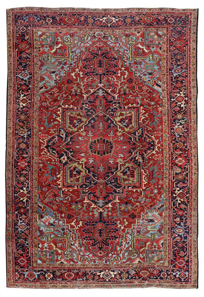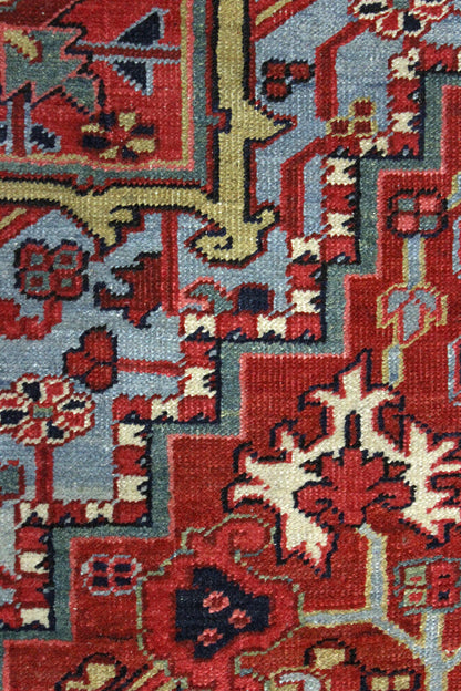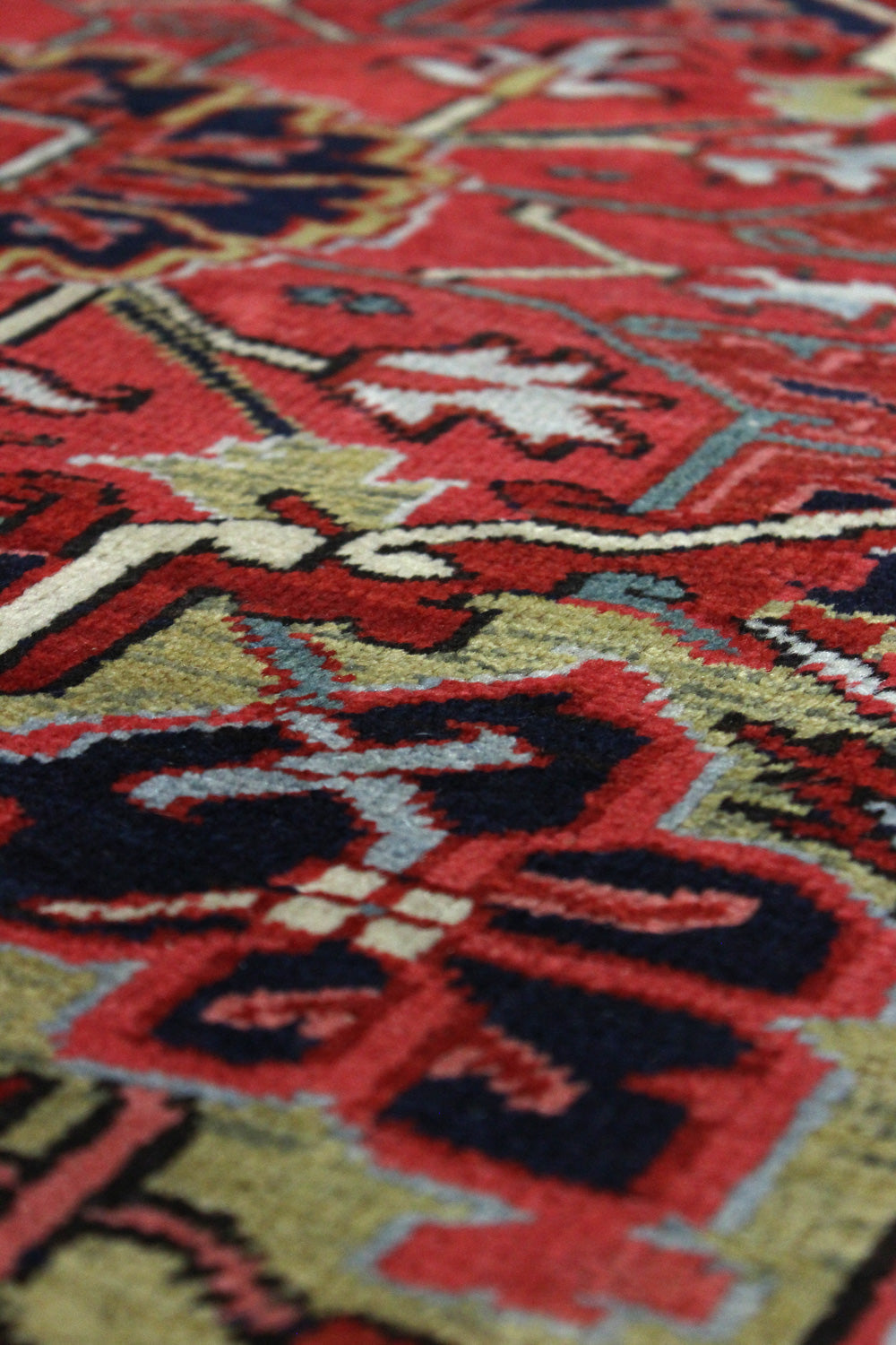Elevate your room’s style with our Antique Heriz Handwoven Tribal Rug (JF8607). The tribal Nomadic Persian & Turkish style, with its Heriz motif, is definitely a stunner that you’ll be proud to show off in your home. Its distinctive red, rust and blue palette will add charm, elegance, and that little bit of that ever-elusive je ne sais quoi. Plus, the wool pile on a cotton foundation used in this 8' 2" X 12' 0" rug accentuates its allure. But, this rug isn’t just worthy of gracing the pages of a design magazine. With its masterful Persian handwoven construction, this antique rug from around 1920 will be a prized possession for decades to come. Get your own show-stopping Antique Heriz Handwoven Tribal Rug today!