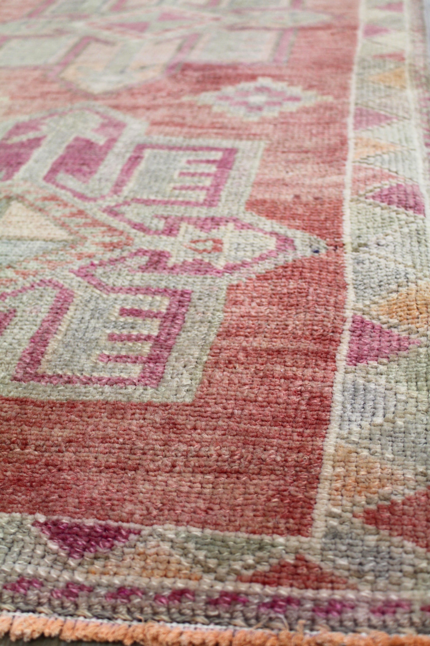 Looking to take your home’s interior design up a notch (or several)? Nothing does it better than a striking statement piece — such as our luxurious Vintage Herki Handwoven Tribal Rug (J63478). This 2' 9" X 10' 4" tribal Vintage Turkish Village rug has a Herki design in pink, shrimp and sage. Constructed of wool pile on a wool foundation, you know that this rug not only looks great but feels nice and will stand the tests of time and traffic. Quality and style are hallmarks of vintage (circa 1980) handwoven Turkish rugs — so you’ll be admiring this one for years to come! All you have to do is claim your Vintage Herki Handwoven Tribal Rug today.