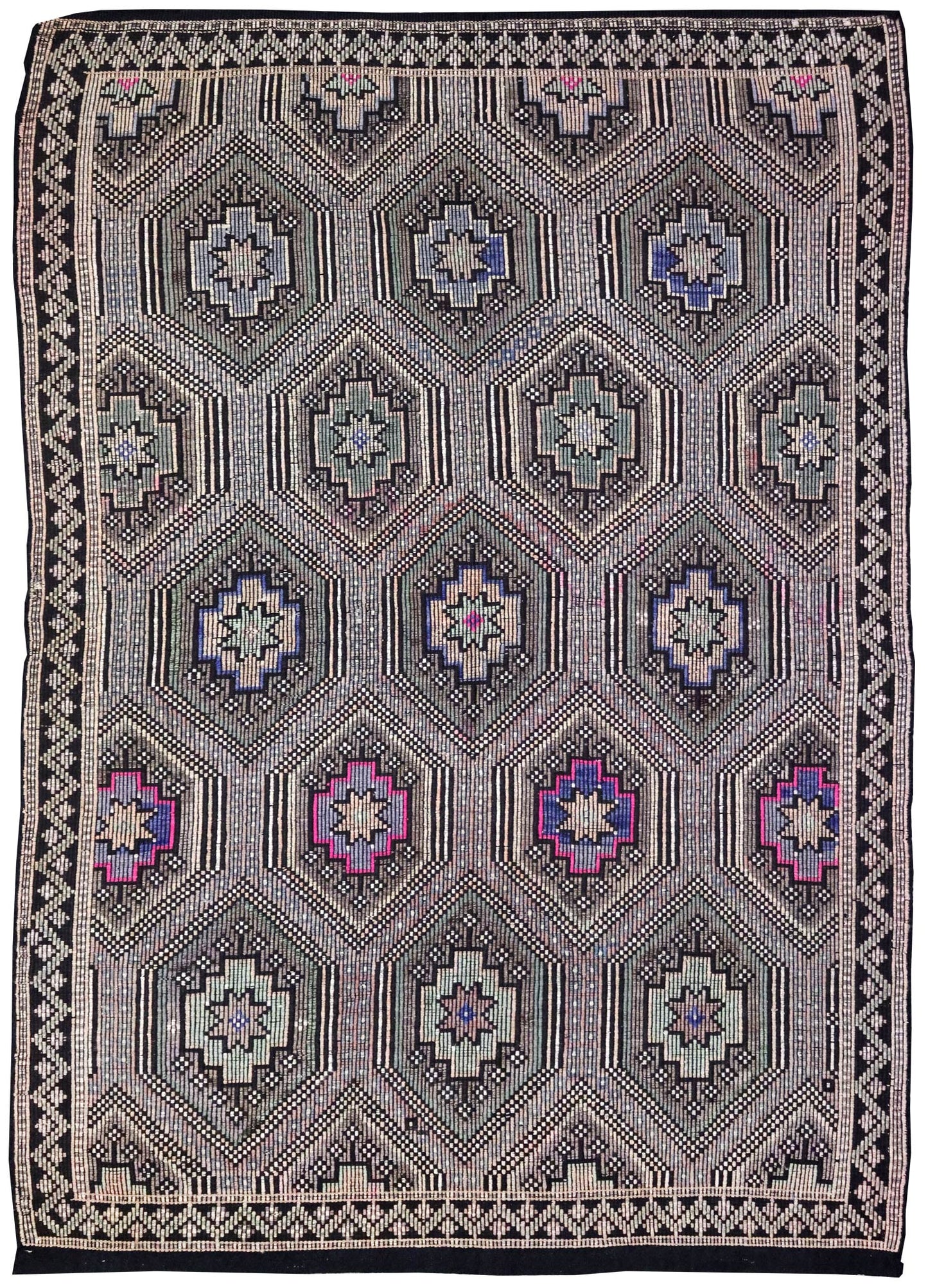 Show off your exquisite taste with our beautiful Vintage Jijim Handwoven Tribal Rug (J64714). It’s a prime example of a tribal Kilim done right and will add a unique, polished look to your space. Crafted mainly in grey and complemented with charcoal and sage, the Jijim design really pops. The wool flatweave surface is resilient yet comfortable and the wool foundation provides a sturdy base. This 6' 10" X 9' 9" handwoven rug is of vintage construction and Turkish origin. All in all, you’re going to love this piece and it’s going to be the perfect addition to your home. Make it happen today — with your own Vintage Jijim Handwoven Tribal Rug.