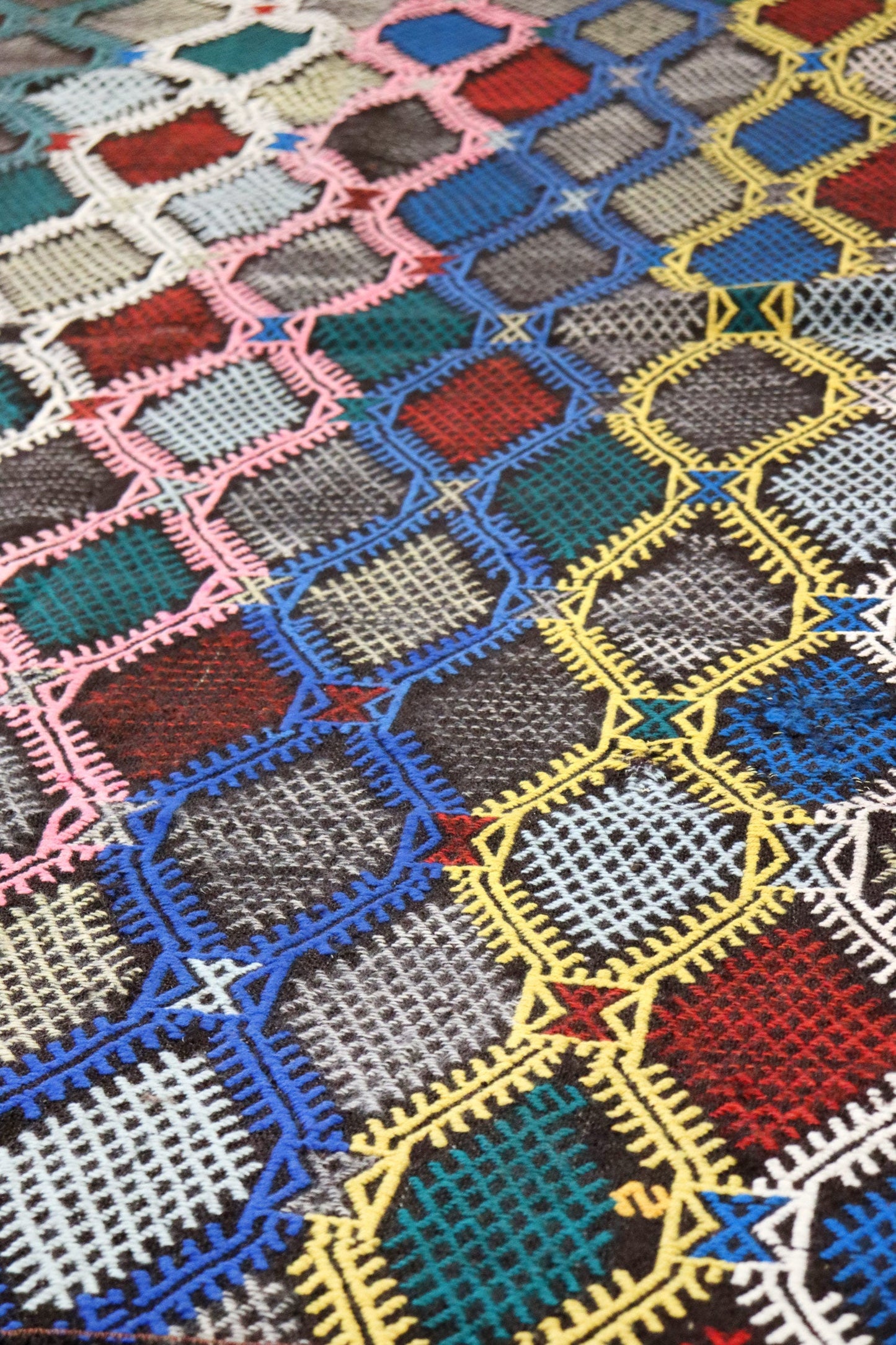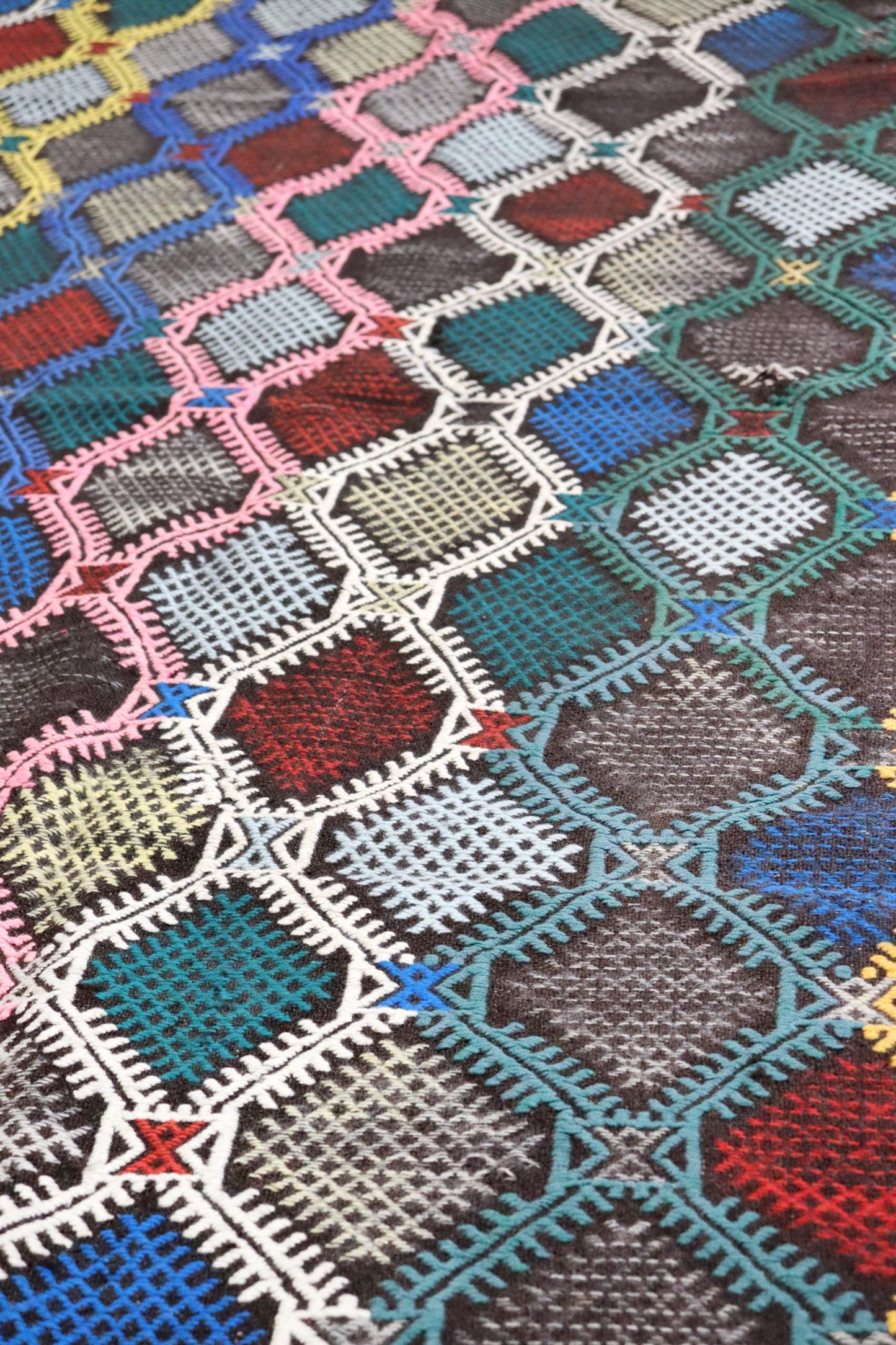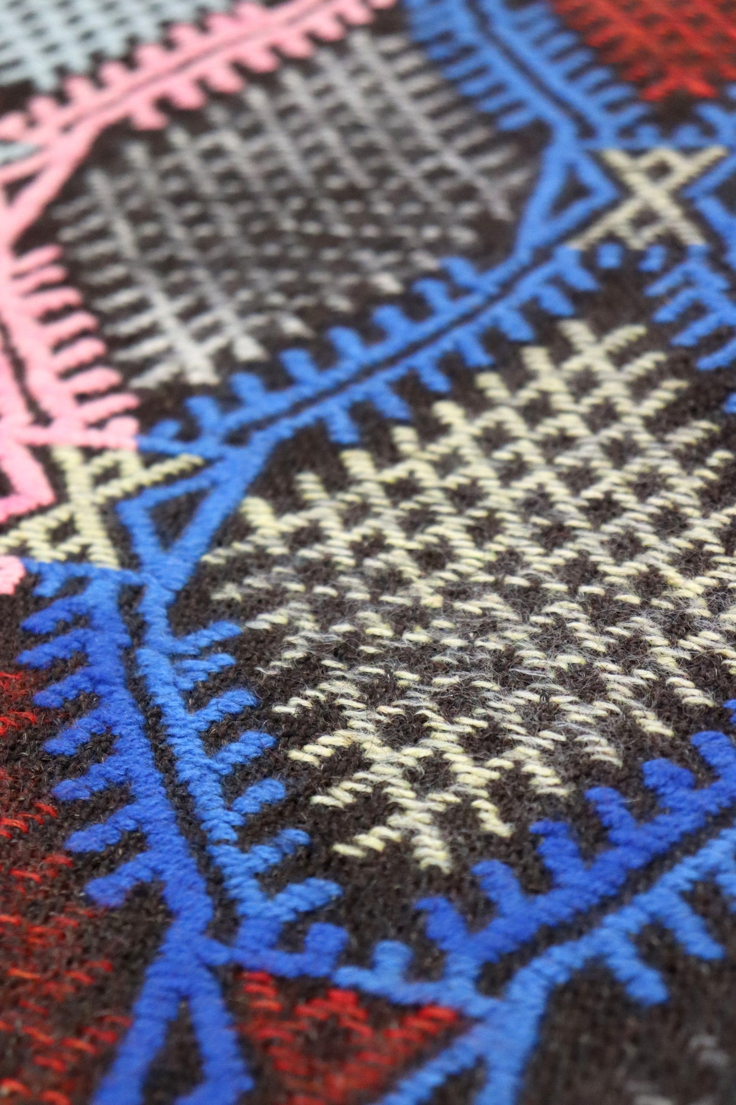 Show off your exquisite taste with our beautiful Vintage Jijim Handwoven Tribal Rug (J64715). It’s a prime example of a tribal Kilim done right and will add a unique, polished look to your space. Crafted mainly in grey and complemented with charcoal and royal blue, the Jijim design really pops. The wool flatweave surface is resilient yet comfortable and the wool foundation provides a sturdy base. This 4' 9" X 7' 9" handwoven rug is of vintage construction and Turkish origin. All in all, you’re going to love this piece and it’s going to be the perfect addition to your home. Make it happen today — with your own Vintage Jijim Handwoven Tribal Rug.