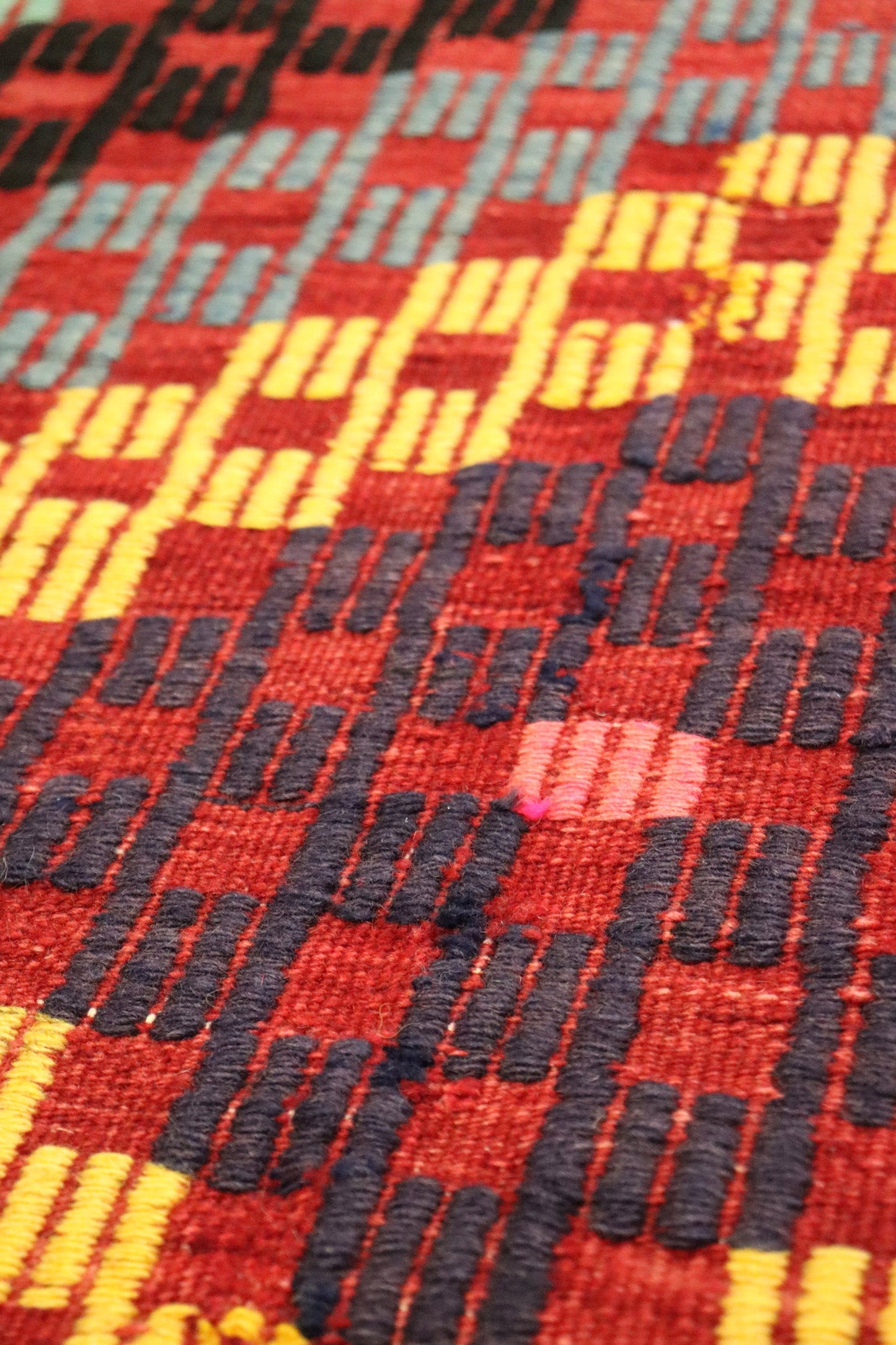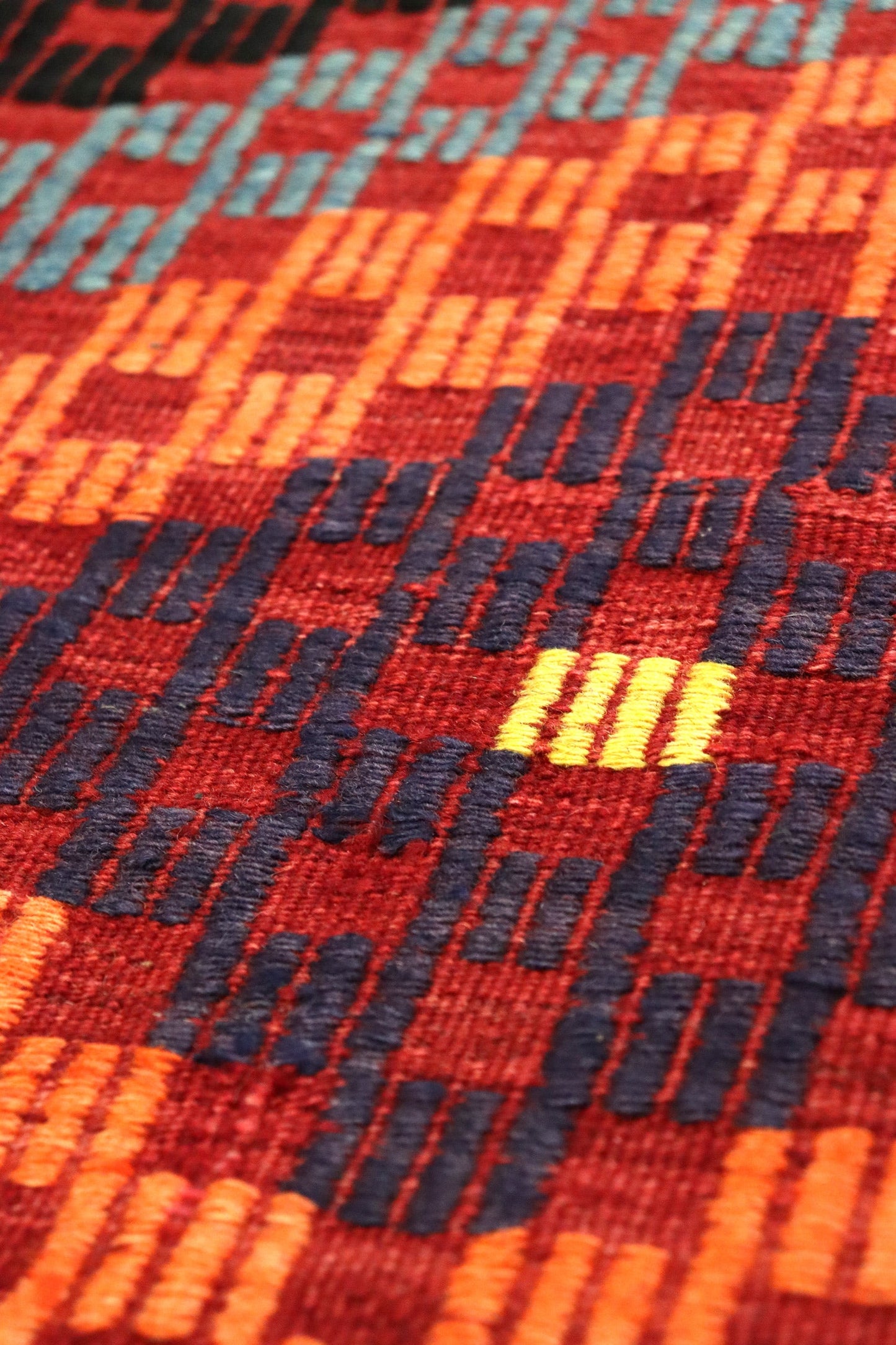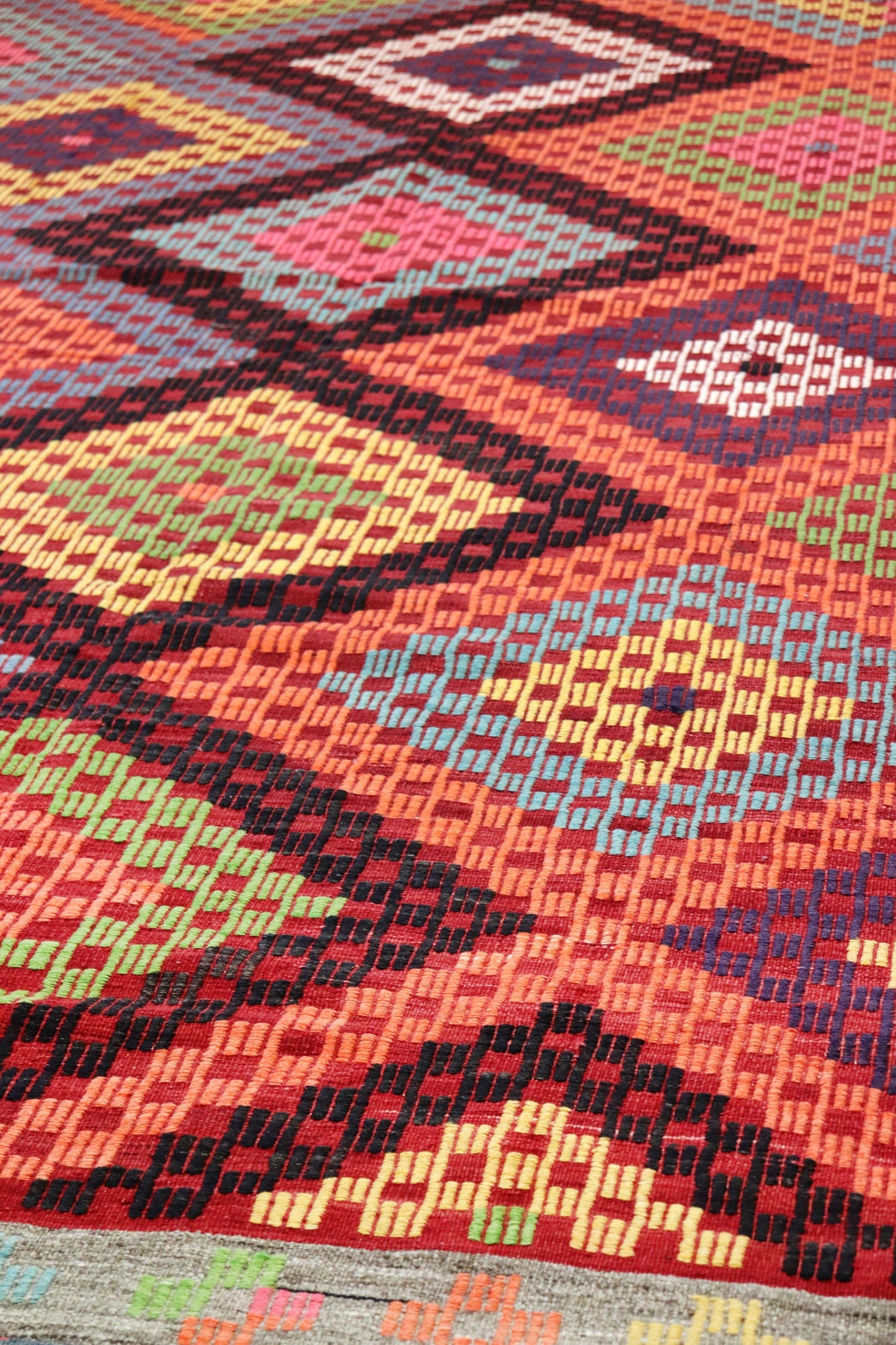 Show off your exquisite taste with our beautiful Vintage Jijim Handwoven Tribal Rug (J64718). It’s a prime example of a tribal Kilim done right and will add a unique, polished look to your space. Crafted mainly in orange and complemented with tangerine and raspberry, the Jijim design really pops. The wool flatweave surface is resilient yet comfortable and the wool foundation provides a sturdy base. This 6' 8" X 11' 5" handwoven rug is of vintage construction and Turkish origin. All in all, you’re going to love this piece and it’s going to be the perfect addition to your home. Make it happen today — with your own Vintage Jijim Handwoven Tribal Rug.