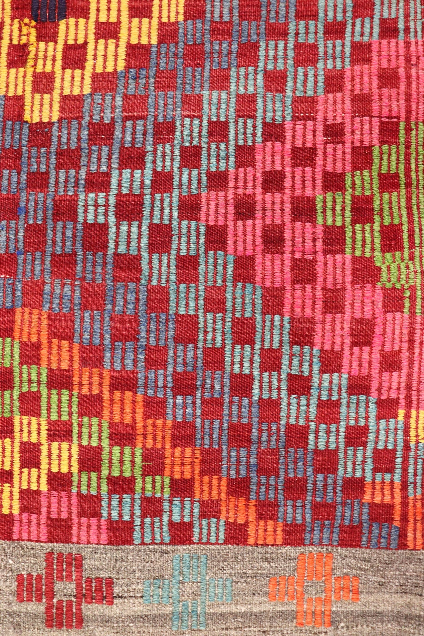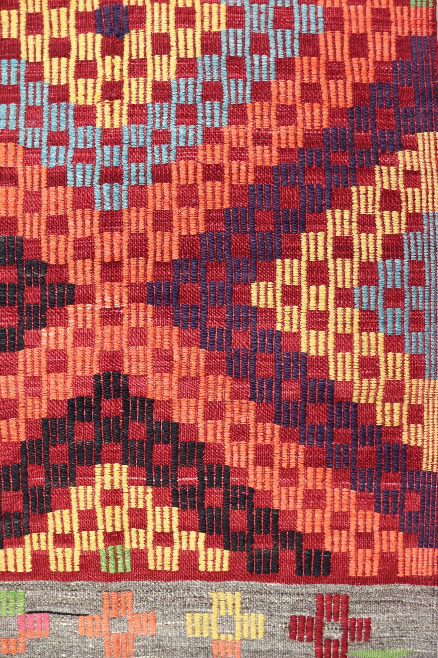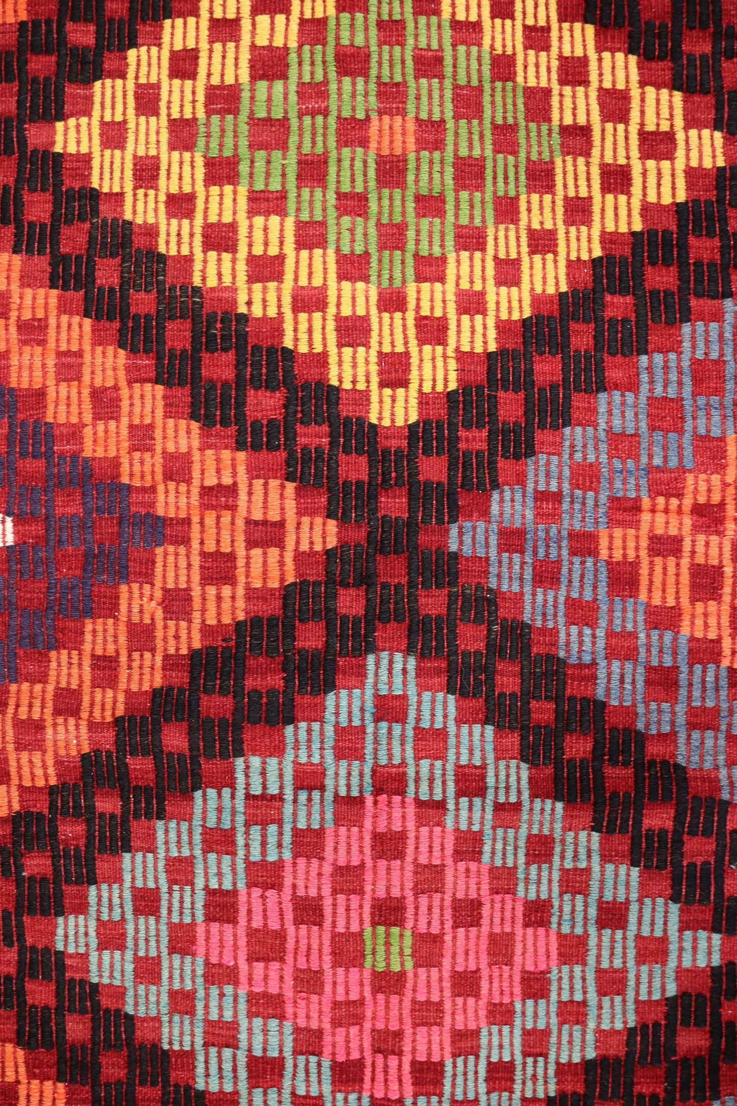 Show off your exquisite taste with our beautiful Vintage Jijim Handwoven Tribal Rug (J64718). It’s a prime example of a tribal Kilim done right and will add a unique, polished look to your space. Crafted mainly in orange and complemented with tangerine and raspberry, the Jijim design really pops. The wool flatweave surface is resilient yet comfortable and the wool foundation provides a sturdy base. This 6' 8" X 11' 5" handwoven rug is of vintage construction and Turkish origin. All in all, you’re going to love this piece and it’s going to be the perfect addition to your home. Make it happen today — with your own Vintage Jijim Handwoven Tribal Rug.
