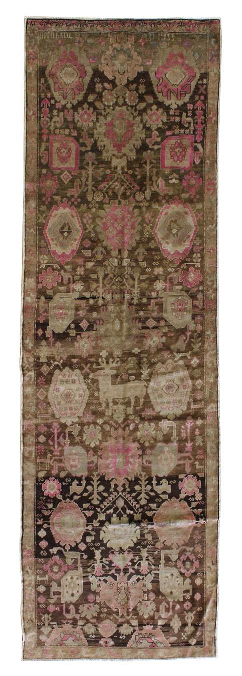 The antique rug in question originates from the Caucasian region and is of the Karabagh design style, dating back to circa 1920. This piece is characterized by its tribal aesthetic and features a chocolate brown background and a pink border. The primary material composition of this rug is wool on a cotton foundation.