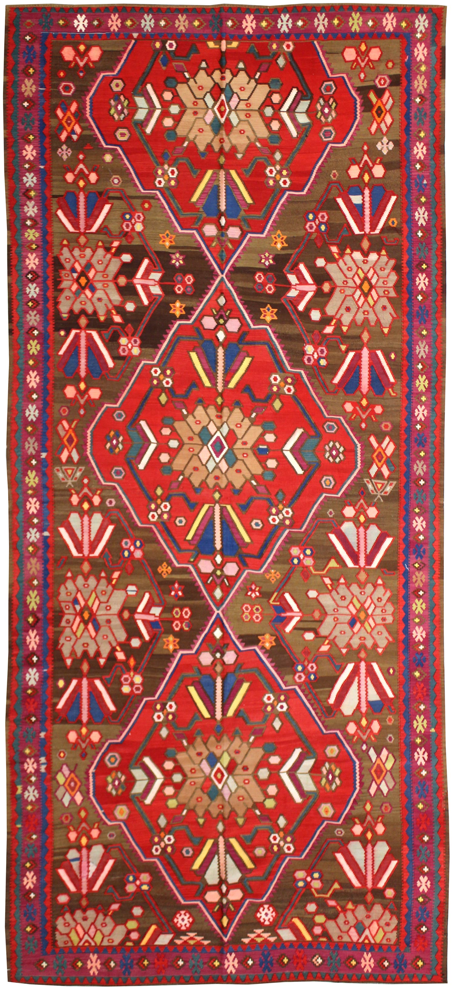 Looking to take your home’s interior design up a notch (or several)? Nothing does it better than a striking statement piece — such as our luxurious Antique Karabagh Kilim Handwoven Tribal Rug (J63335). This 6' 11" X 15' 2" tribal Kilim rug has a Karabagh Kilim design in brown, mocha and red. Constructed of wool flatweave on a wool foundation, you know that this rug not only looks great but feels nice and will stand the tests of time and traffic. Quality and style are hallmarks of antique handwoven Caucasian rugs — so you’ll be admiring this one for years to come! All you have to do is claim your Antique Karabagh Kilim Handwoven Tribal Rug today.