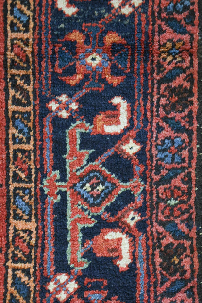 This antique rug originates from Persia, specifically the Karaja region, and is identified by its distinct tribal style. The rug features a rust-colored background complemented by a navy border, with red serving as the dominant color throughout the design. Crafted from wool on a cotton foundation, this handwoven piece dates back to circa 1920.