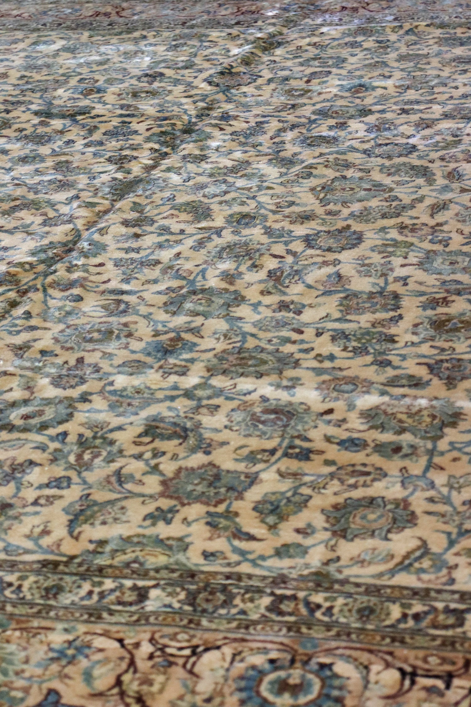 This Persian rug hails from the city of Kashan, a region renowned for its textile artistry. Originating circa 1940, this rug exemplifies the traditional Kashan style known for its intricate and decorative patterns. The primary color of the rug is beige, both in the central field and as the main color theme, providing a subtle and elegant backdrop. The border adds a striking contrast with its teal hue, enhancing the overall aesthetic appeal. The rug is crafted with wool on a cotton foundation, a combination that speaks to its durability and quality.