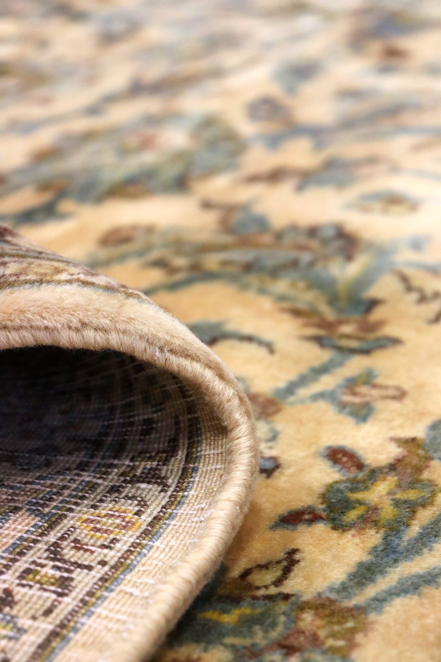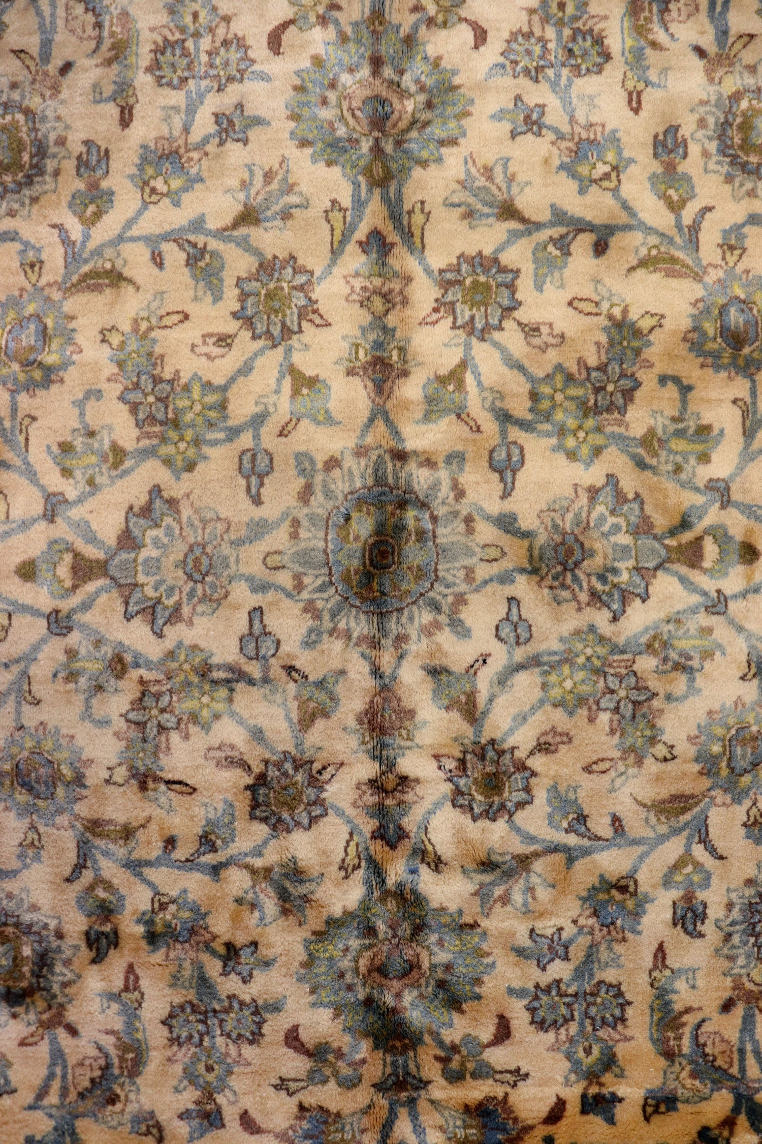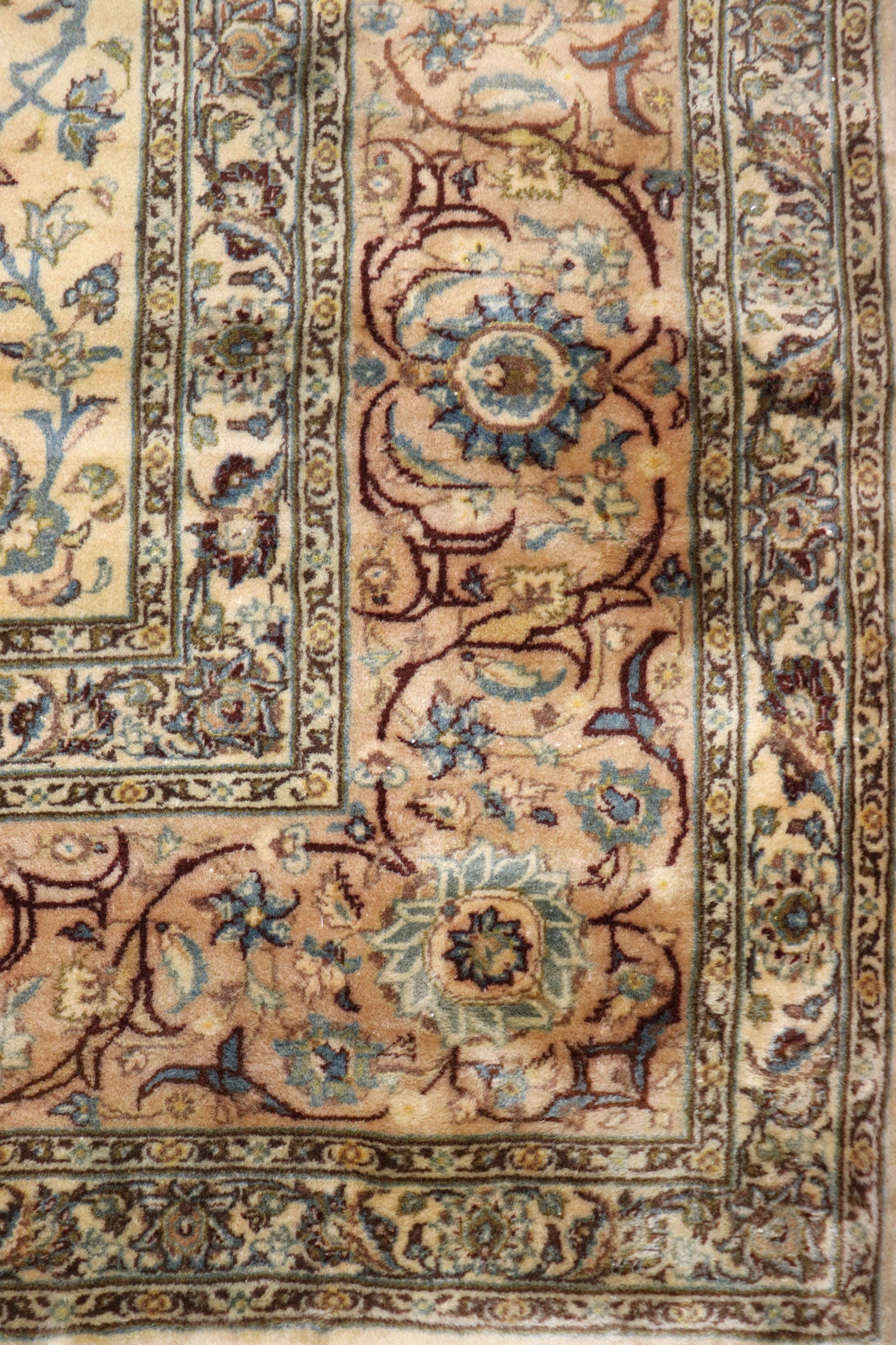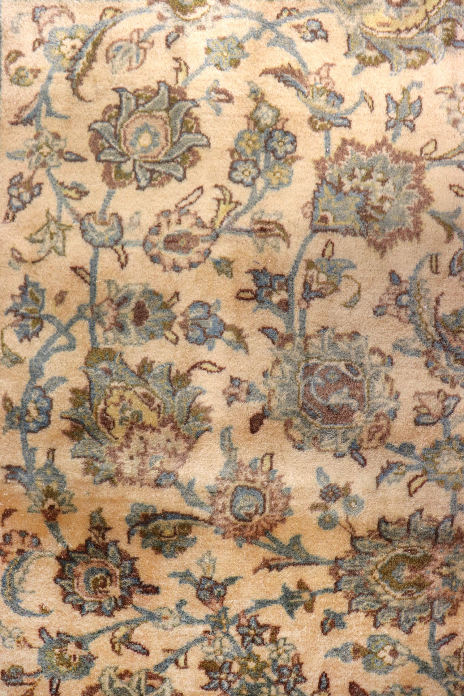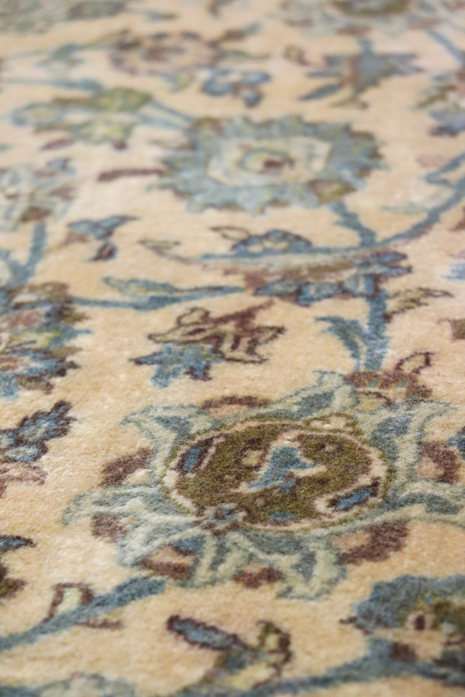 Kashan has a storied history of rug making that dates back centuries, recognized for its fine materials and intricate designs. This particular rug features a complex and dense pattern of interwoven floral and vine motifs, with a repetitive and interconnected design that is iconic to Persian rugs. The floral designs within the central field exhibit shades of blue, green, and brown, set against the creamy beige background, adding depth and visual interest to the piece.