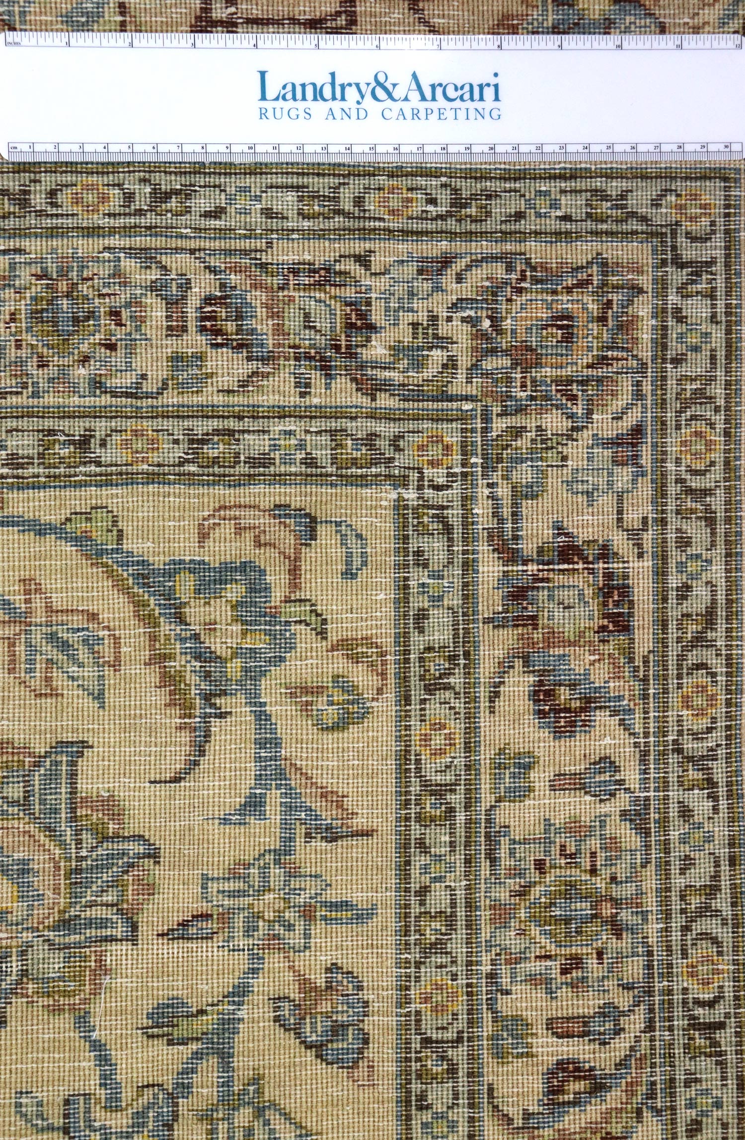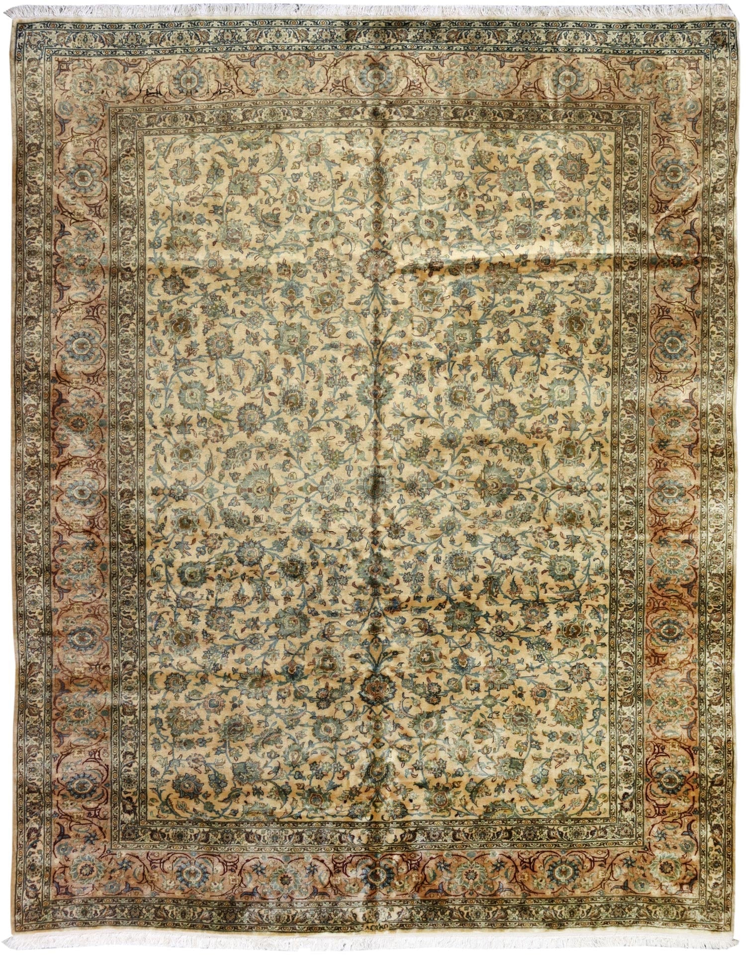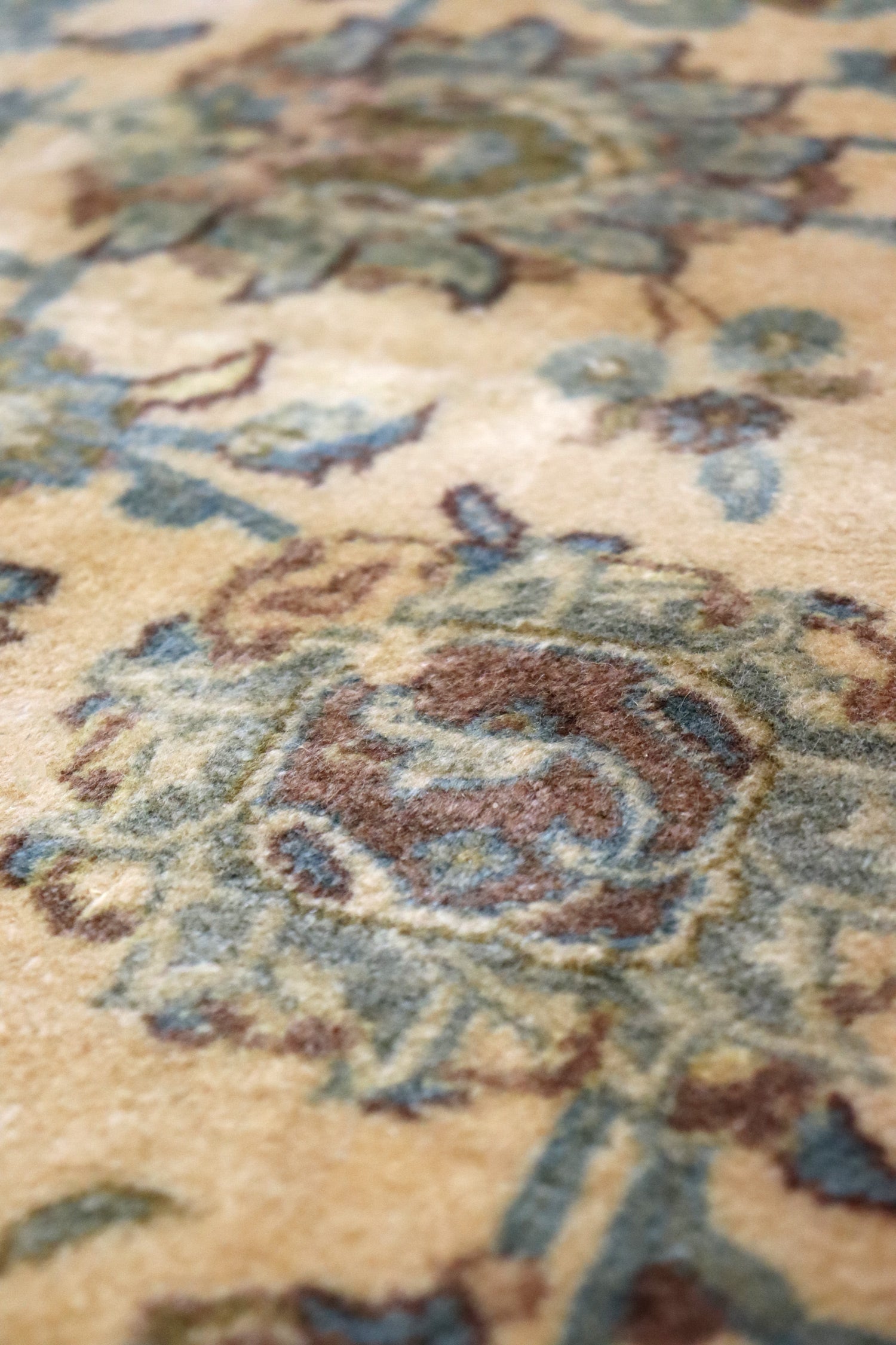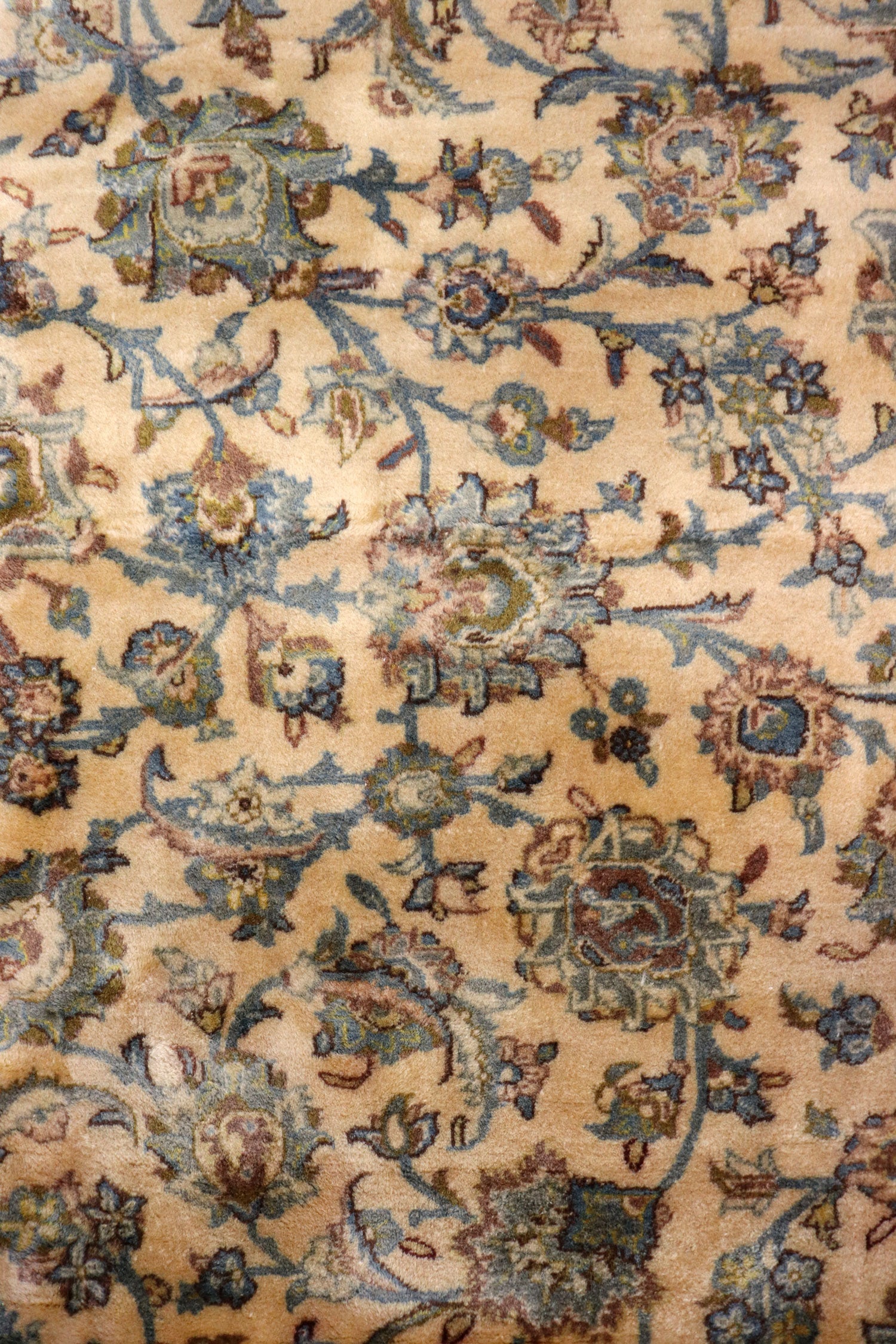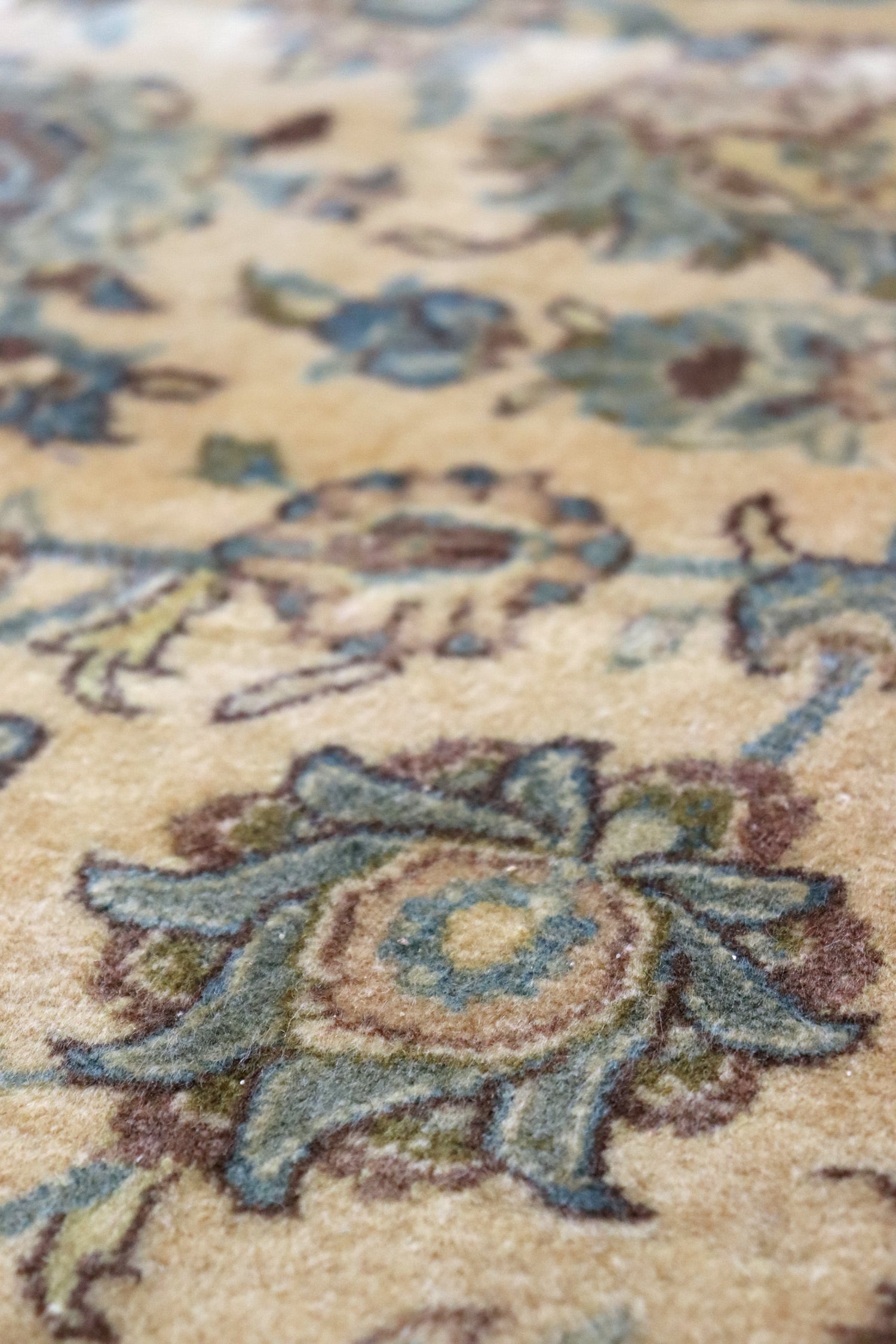 Kashan has a storied history of rug making that dates back centuries, recognized for its fine materials and intricate designs. This particular rug features a complex and dense pattern of interwoven floral and vine motifs, with a repetitive and interconnected design that is iconic to Persian rugs. The floral designs within the central field exhibit shades of blue, green, and brown, set against the creamy beige background, adding depth and visual interest to the piece.