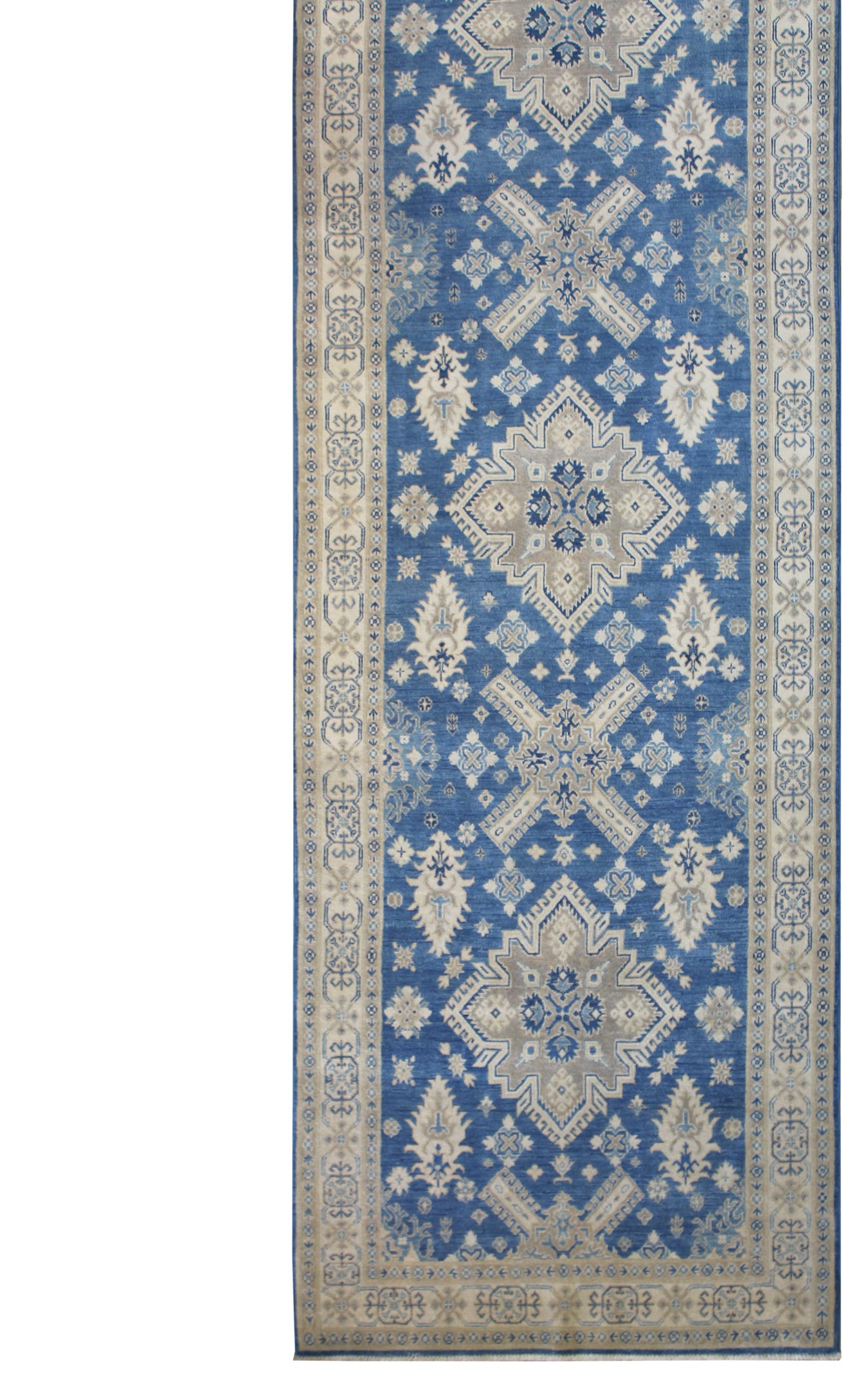Opt for opulence and establish your signature style with the striking Kazak Handwoven Tribal Rug (J53915). As a 4' 11" X 26' 8" rug that's tribal and caucasian in style, you know that this piece can instantly tie the look of your space together. The rug's kazak design will effortlessly complement and elevate your home's interior. Better still, the blue and ivory will flatter any décor. This new handwoven Pakistani rug is constructed of wool pile and a cottonfoundation, so it’ll not only look outstanding and perfect in your home — it’ll last for generations. Bring home your Kazak Handwoven Tribal Rug today!