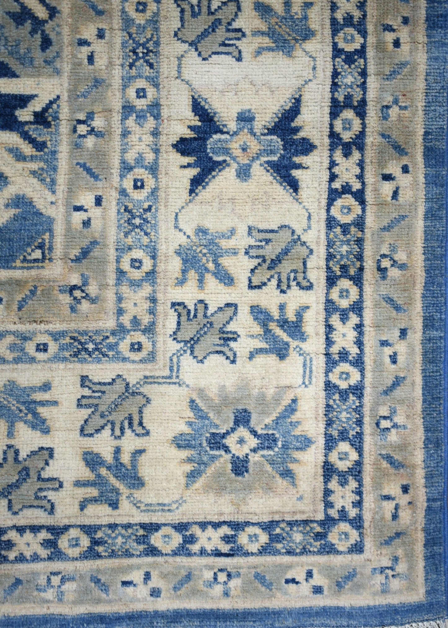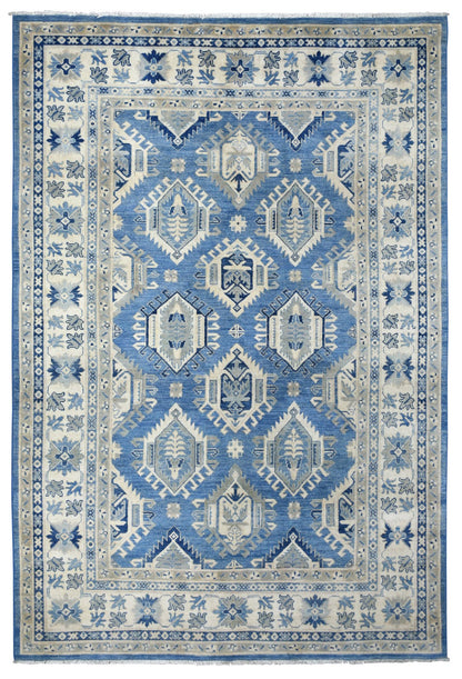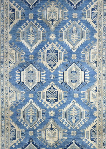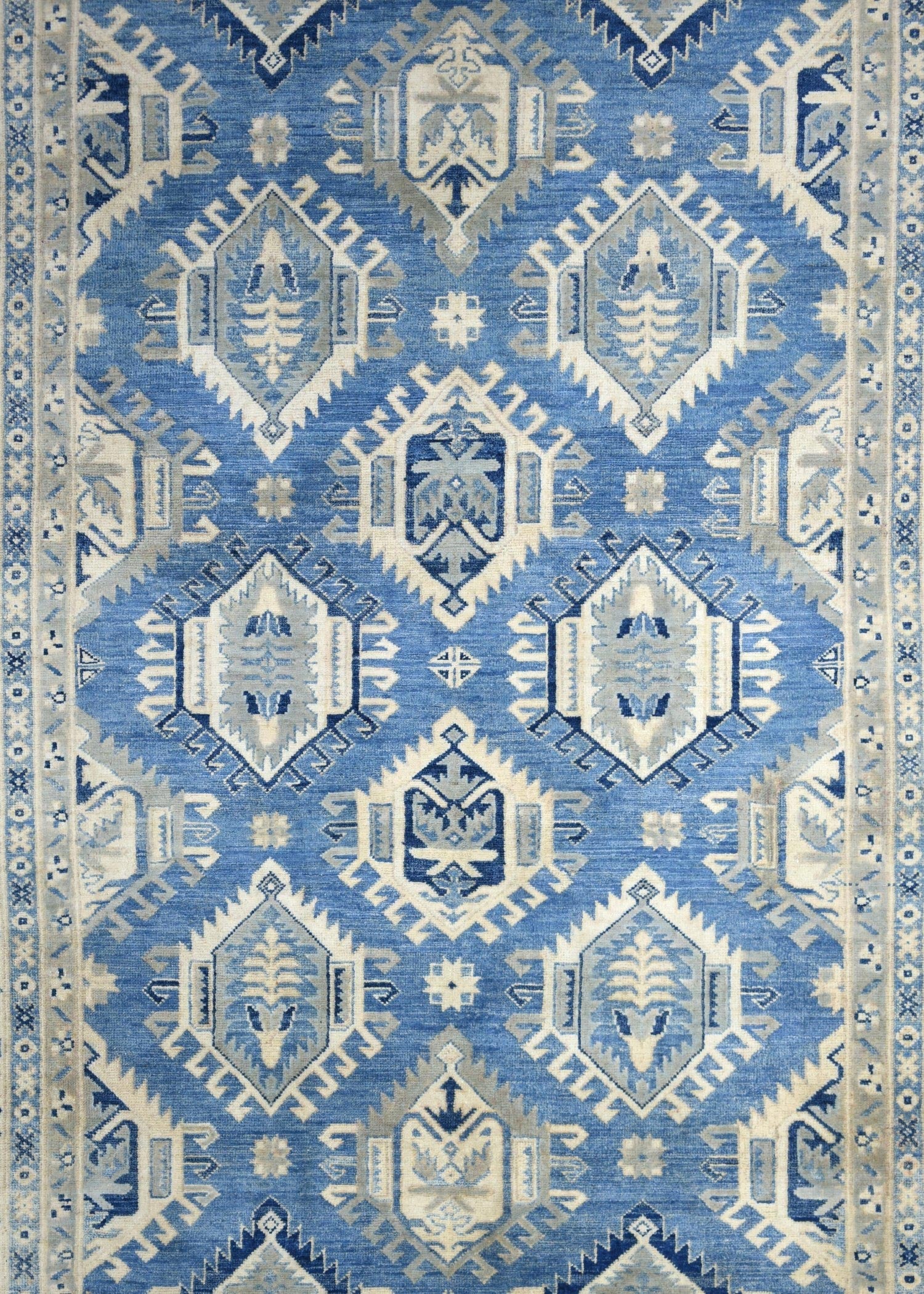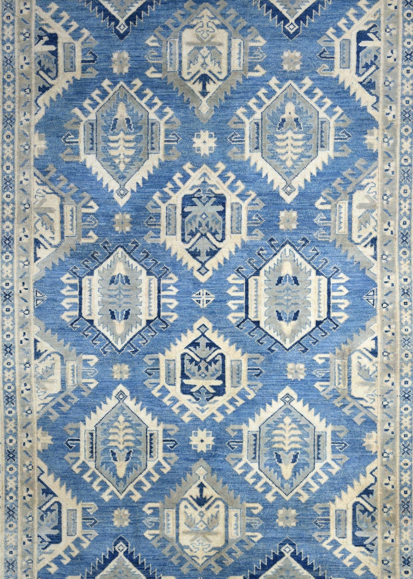 Show off your exquisite taste with our beautiful Kazak Handwoven Tribal Rug (J64163). It’s a prime example of a tribal Caucasian done right and will add a unique, polished look to your space. Crafted mainly in blue and complemented with sky blue and ivory, the Kazak design really pops. The wool pile surface is resilient yet comfortable and the cotton foundation provides a sturdy base. This 5' 10" X 8' 8" handwoven rug is of new construction and Afghani origin. All in all, you’re going to love this piece and it’s going to be the perfect addition to your home. Make it happen today — with your own Kazak Handwoven Tribal Rug.