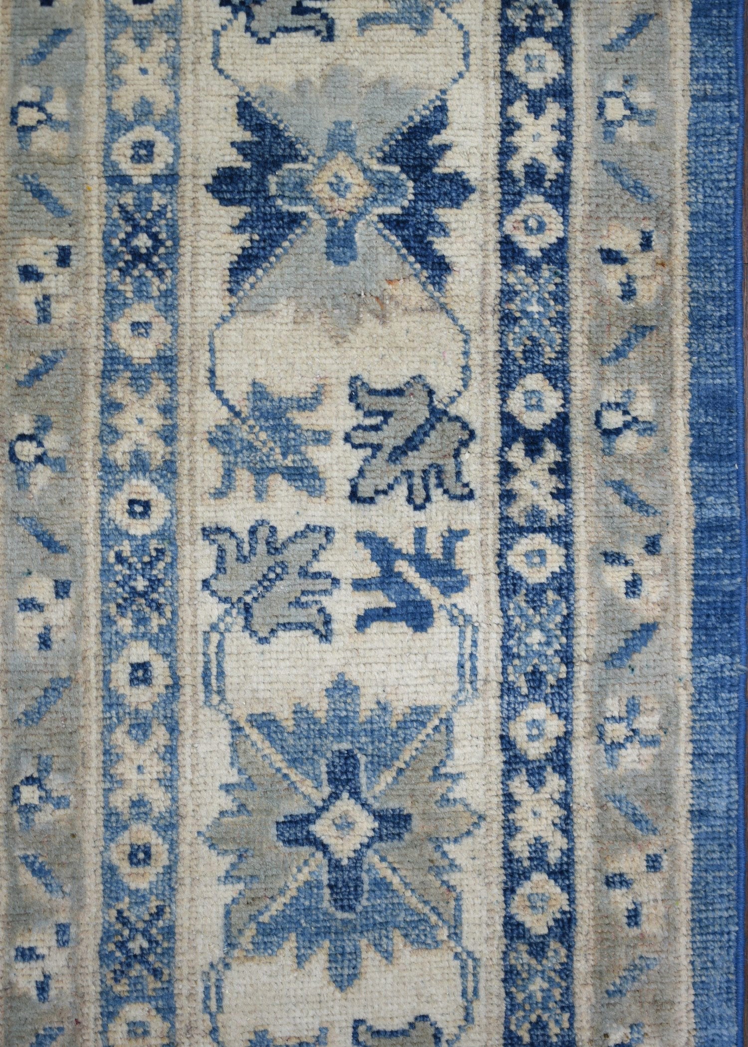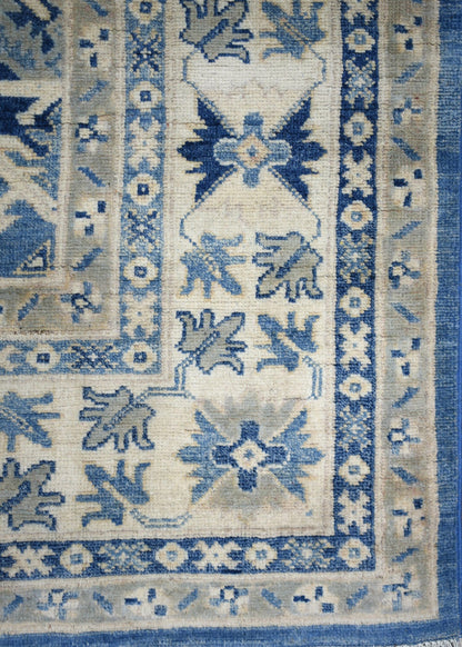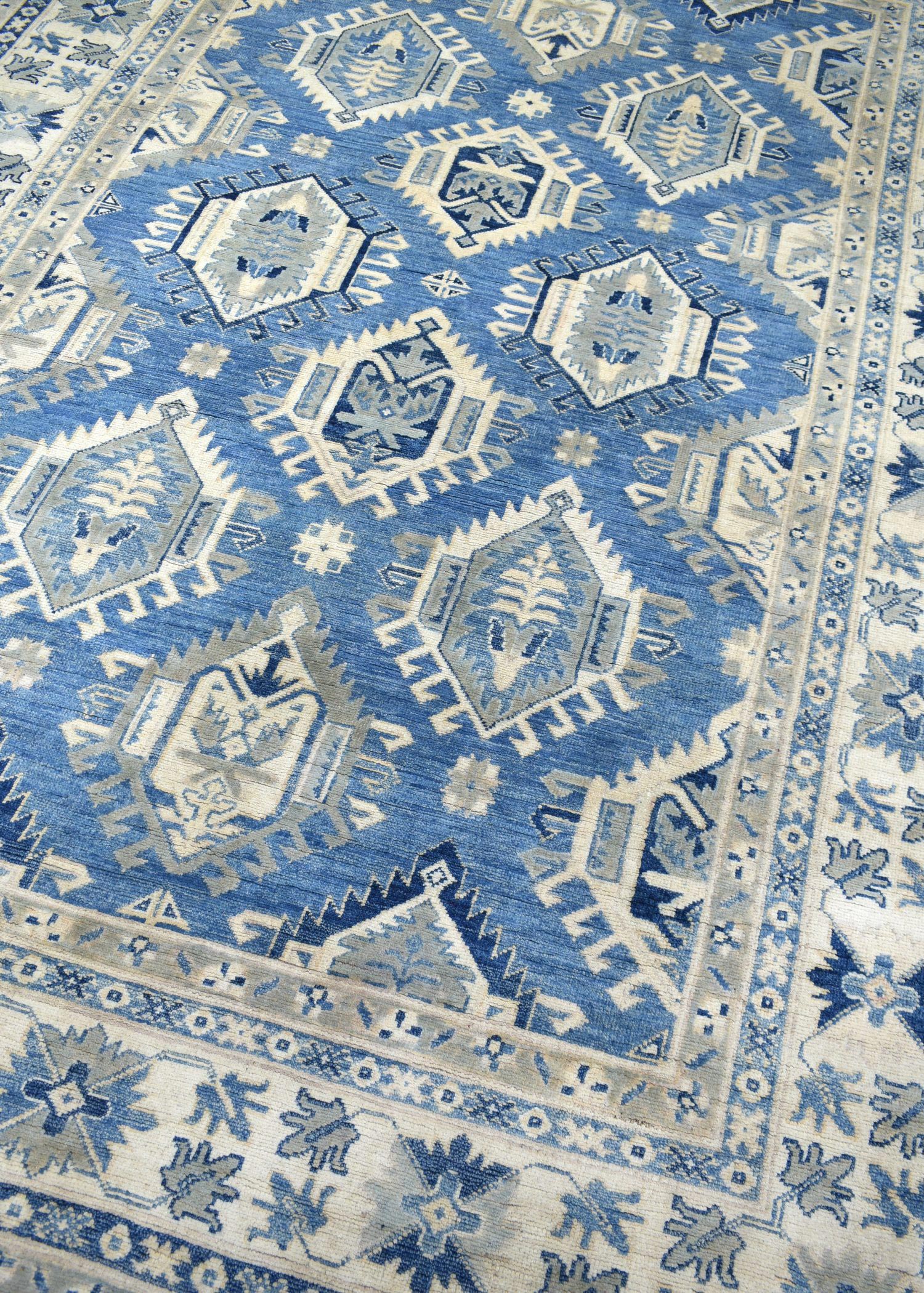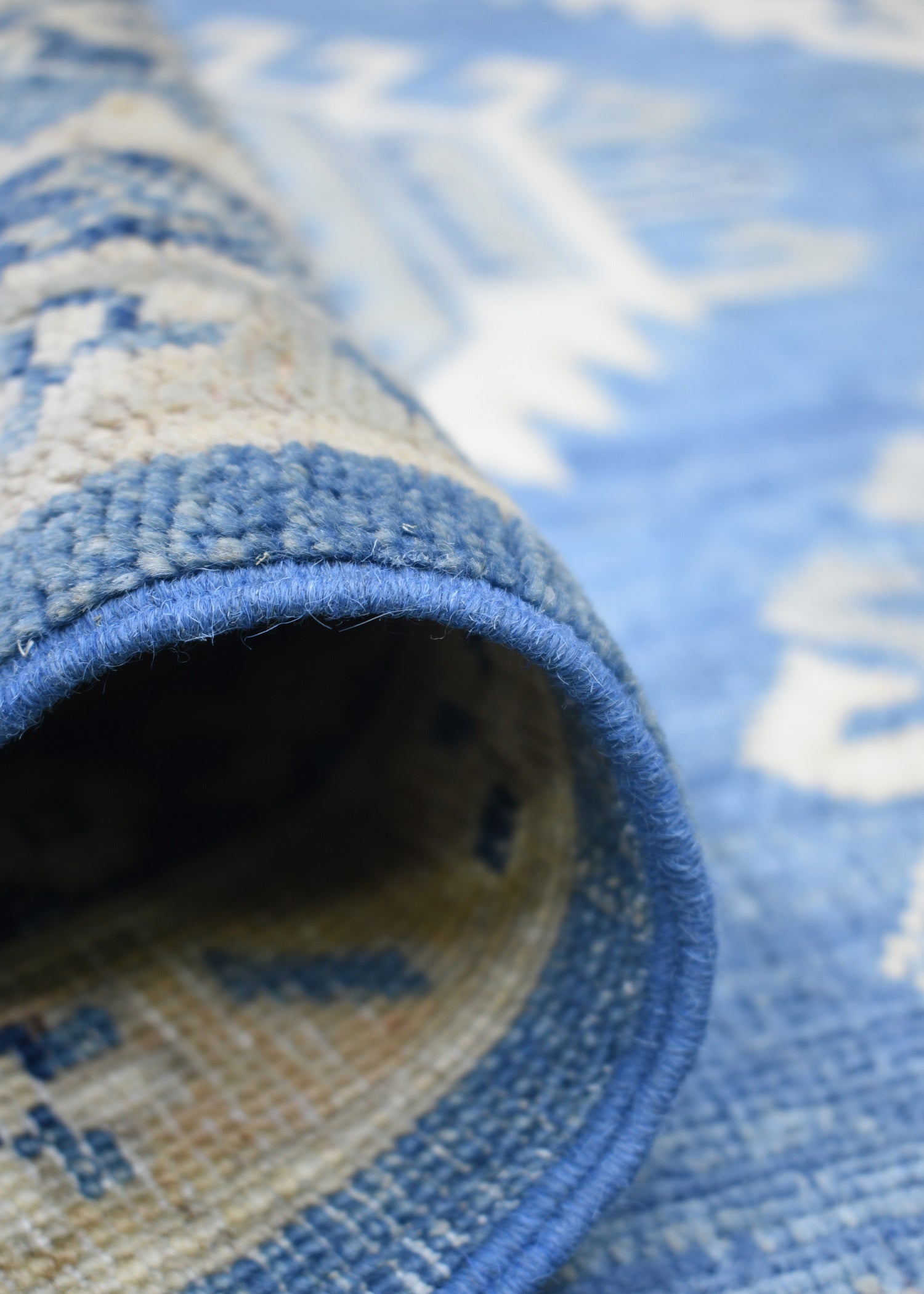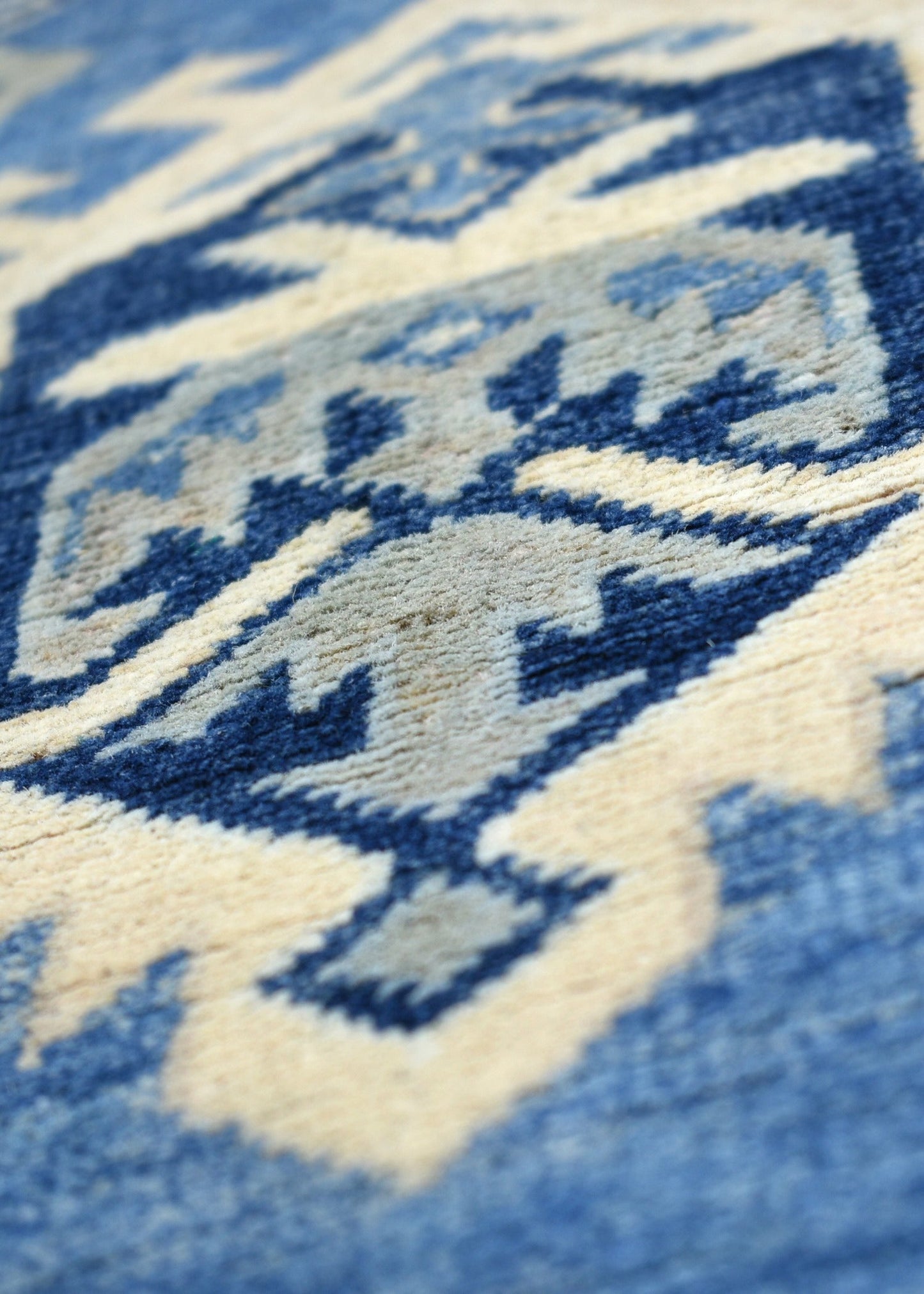 Show off your exquisite taste with our beautiful Kazak Handwoven Tribal Rug (J64163). It’s a prime example of a tribal Caucasian done right and will add a unique, polished look to your space. Crafted mainly in blue and complemented with sky blue and ivory, the Kazak design really pops. The wool pile surface is resilient yet comfortable and the cotton foundation provides a sturdy base. This 5' 10" X 8' 8" handwoven rug is of new construction and Afghani origin. All in all, you’re going to love this piece and it’s going to be the perfect addition to your home. Make it happen today — with your own Kazak Handwoven Tribal Rug.