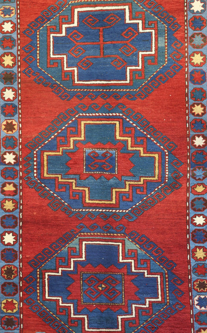 This rug is defined by a strong and visually striking design. The main color is a rich red, which forms the backdrop for its intricate geometric patterns. These patterns include three distinct medallions that run down the center, each showcasing bold linear designs in blue, yellow, and white. These colors are used to accentuate the medallions' geometric shapes, providing a vivid contrast and emphasizing the rug's aesthetic appeal.