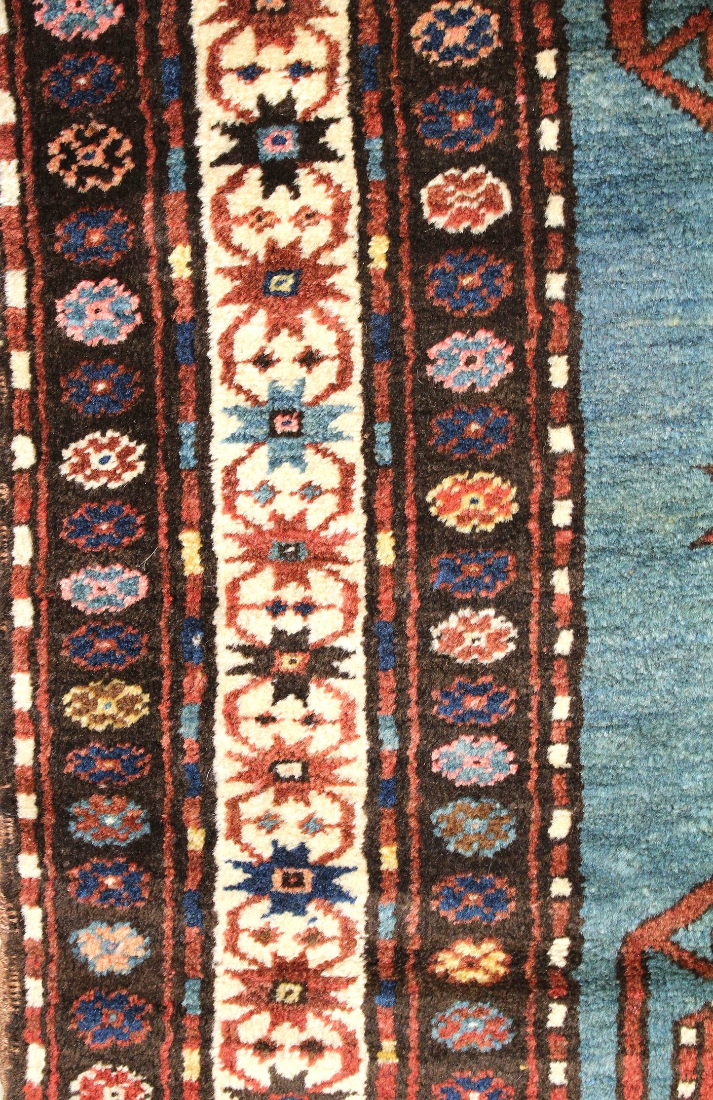 The multi-layered border enhances the rug’s structural integrity and aesthetic appeal. The primary border, rust-colored, frames the piece effectively, while an innermost thin dark strip adds a subtle yet defining touch.