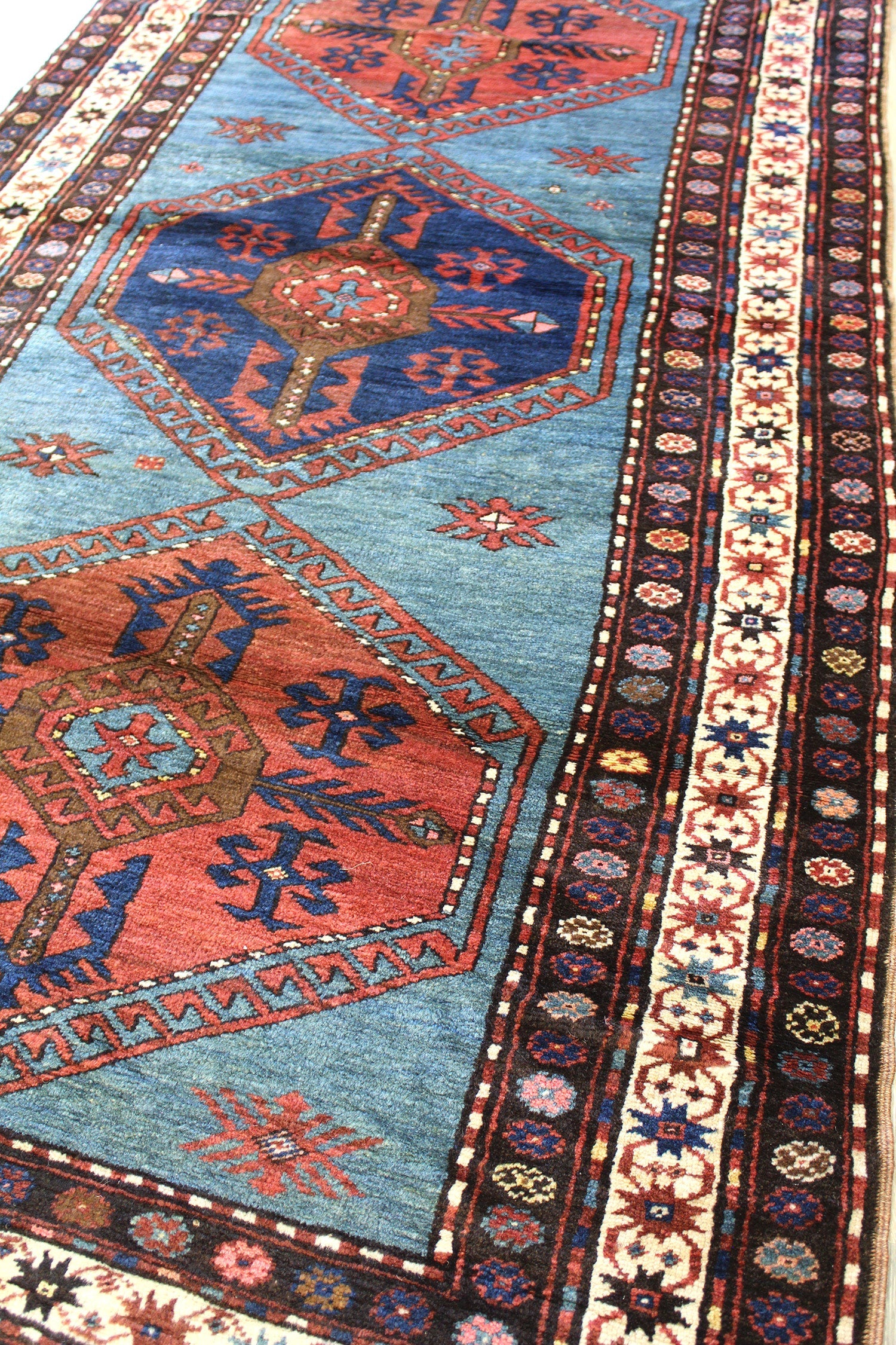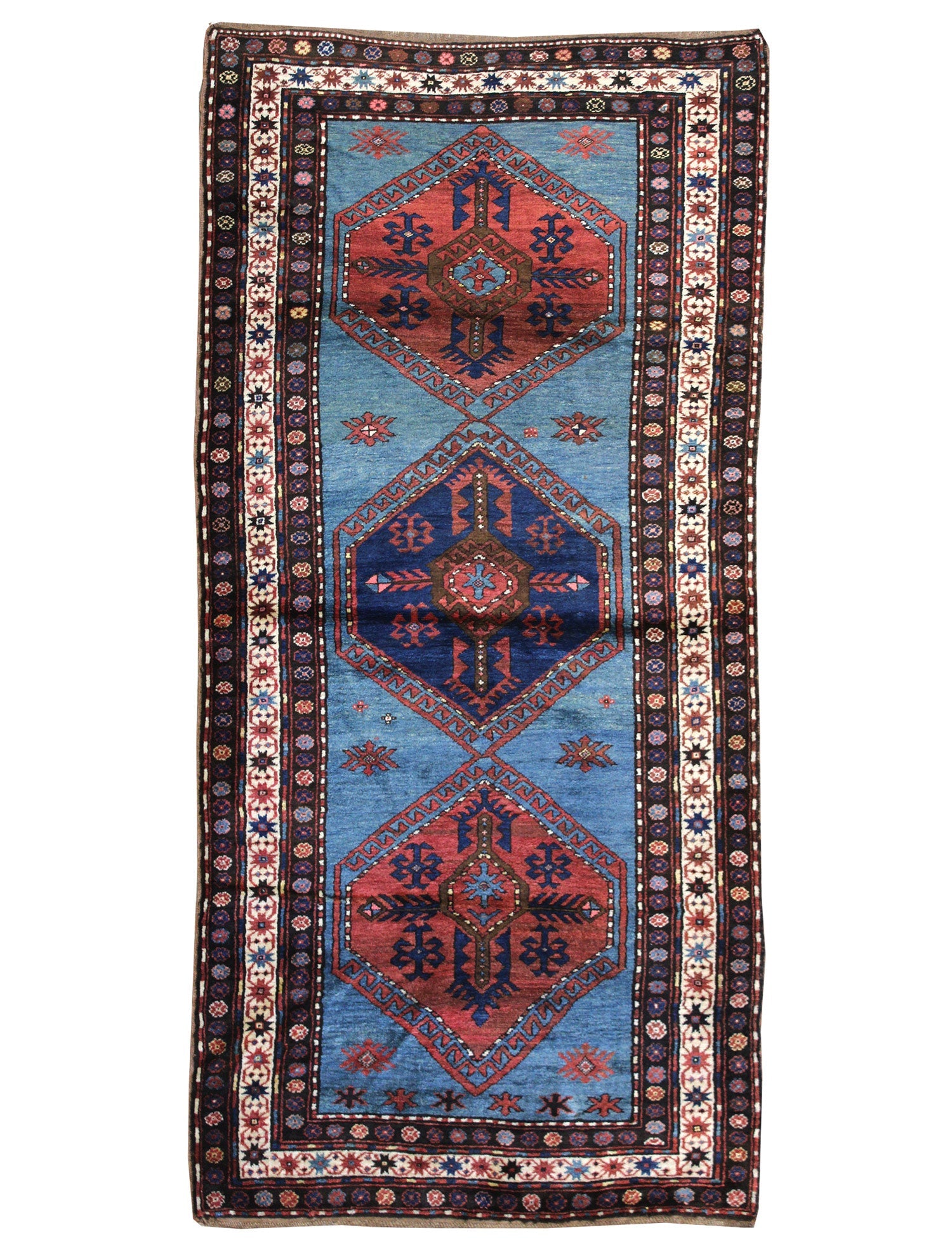 The background, a lighter blue, contrasts with the deeper colors of the medallions and the supplementary red and brown geometric and floral motifs. This interplay of colors and patterns creates a visually compelling piece that reflects the expertise and traditions of its creators.