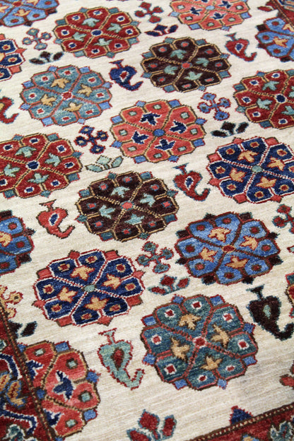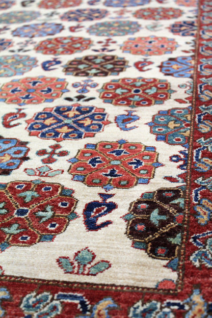 Introducing our exquisite Afghan rug, featuring the timeless Khotan Garden design. This traditional style rug showcases a stunning combination of an ivory background and a vibrant red border. Crafted in Afghanistan, this rug exhibits the finest craftsmanship and attention to detail.