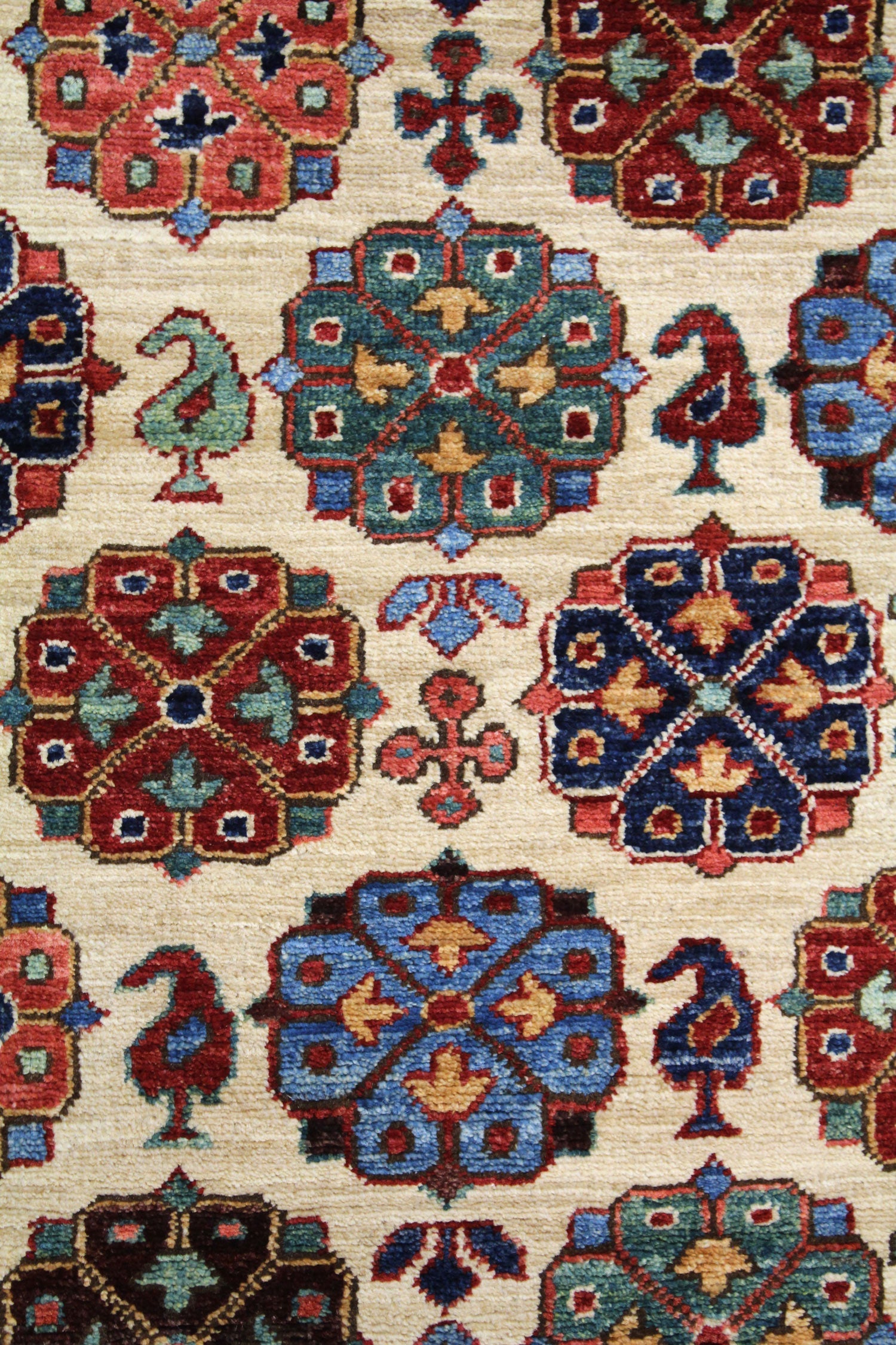 Made of high-quality materials, this rug boasts a wool pile on a cotton warp and weft, providing a comfortable and durable foundation. The wool used in this rug is sourced from sheep in the Ghazni Province of Southeast Afghanistan, known for its longer staple and superior quality. This raw Ghazni wool is then hand-carted and spun into carpet yarn, ready for the weaving process.