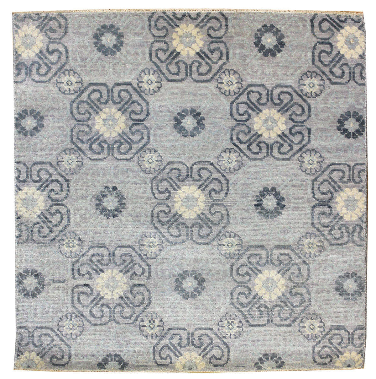 Introducing the "Soft Melody" collection, a stunning rug of Indian origin. This handwoven masterpiece embraces the traditional Khotan design, showcasing the rich craftsmanship and innovation that India is renowned for. The rug features a silver background with a light blue border, creating a sophisticated and timeless aesthetic.