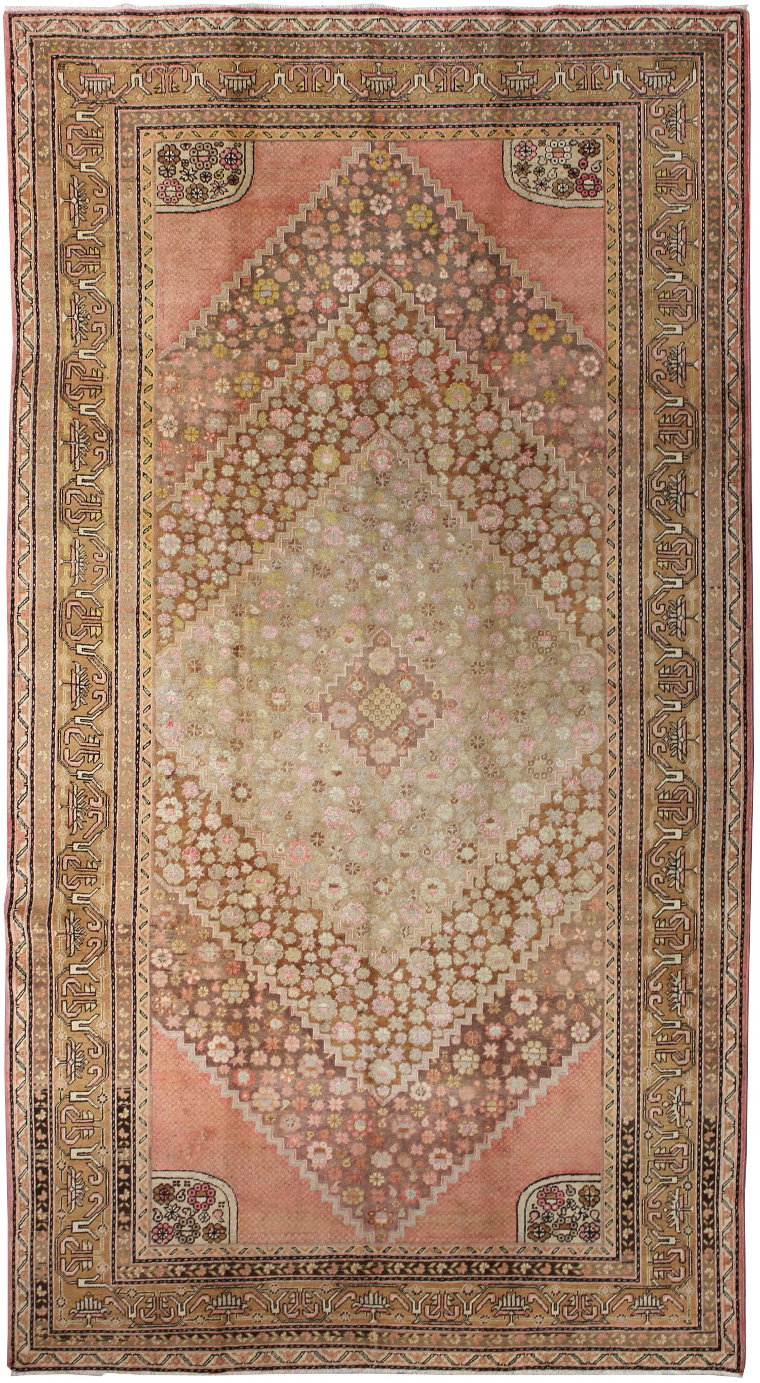 Looking to take your home’s interior design up a notch (or several)? Nothing does it better than a striking statement piece — such as our luxurious Vintage Khotan Handwoven Traditional Rug (J62832). This 6' 6" X 12' 10" traditional Khotan rug has a Khotan design in pink, copper and salmon. Constructed of wool pile on a cotton foundation, you know that this rug not only looks great but feels nice and will stand the tests of time and traffic. Quality and style are hallmarks of vintage (circa 1915) handwoven Central Asian rugs — so you’ll be admiring this one for years to come! All you have to do is claim your Vintage Khotan Handwoven Traditional Rug today.