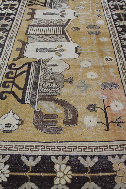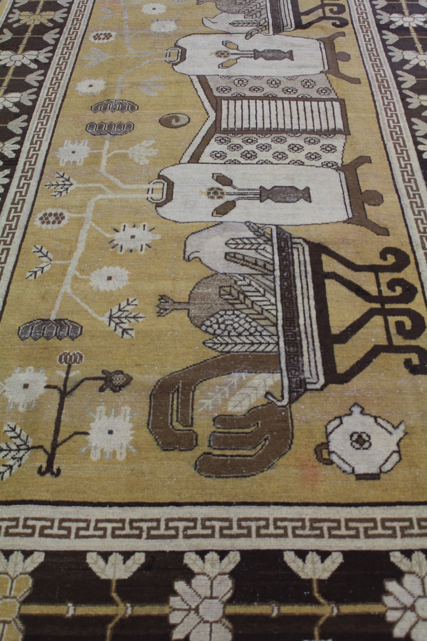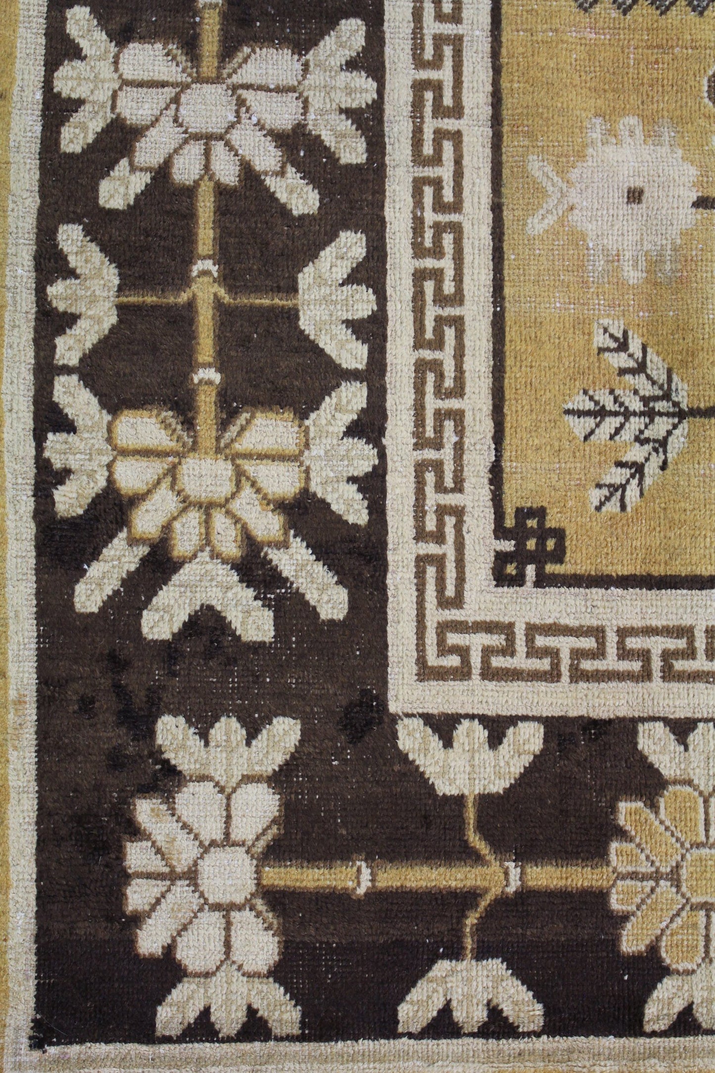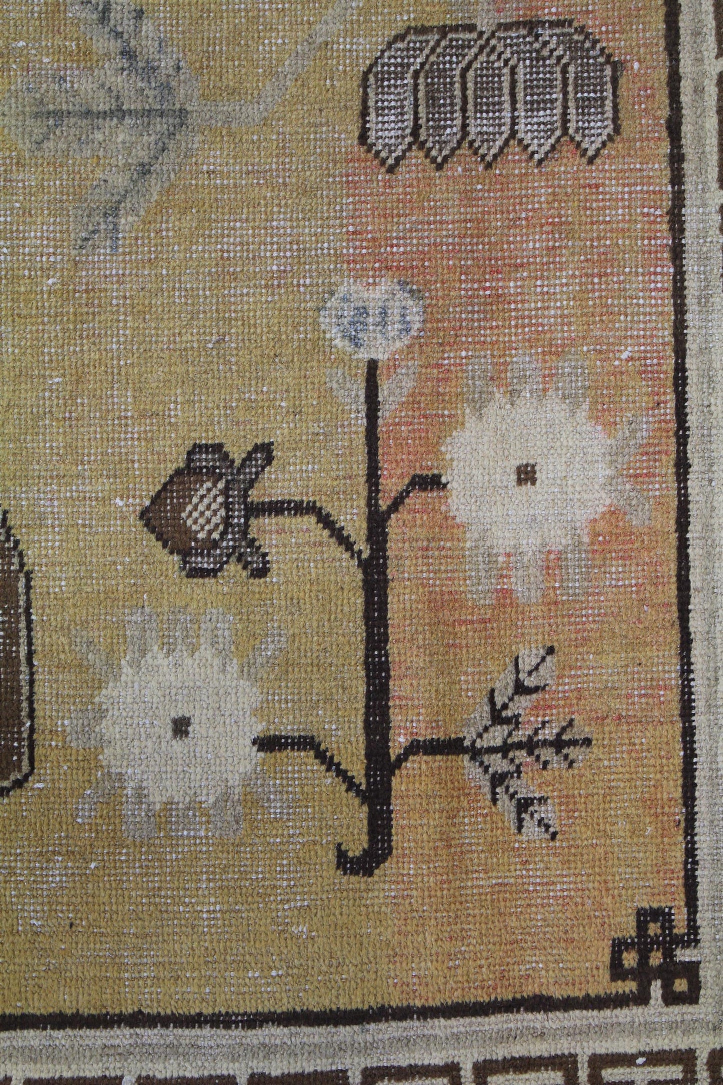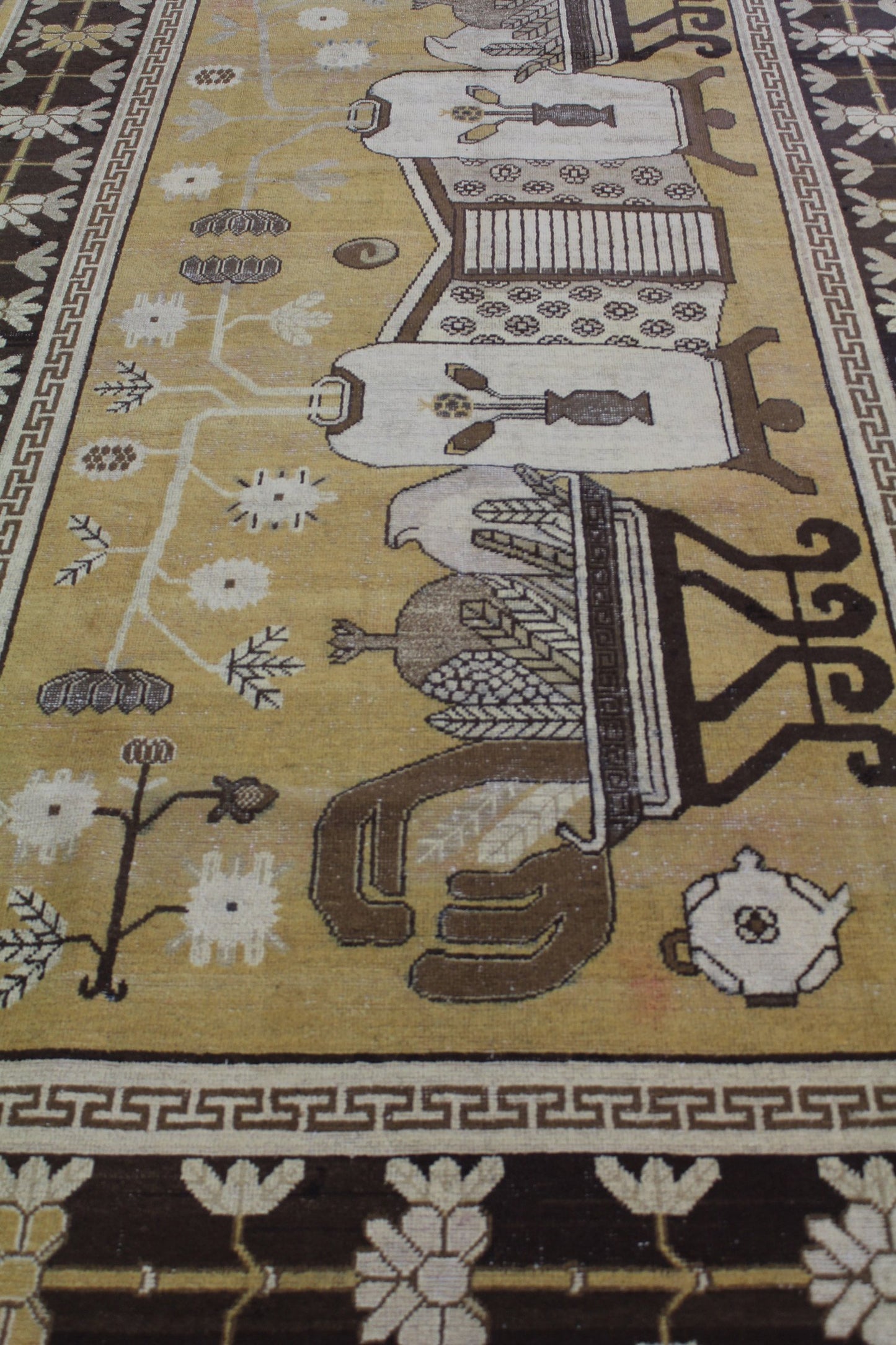 Looking to take your home’s interior design up a notch (or several)? Nothing does it better than a striking statement piece — such as our luxurious Vintage Khotan Handwoven Traditional Rug (J62839). This 5' 4" X 10' 9" traditional Khotan rug has a Khotan design in yellow, gold and brown. Constructed of wool pile on a cotton foundation, you know that this rug not only looks great but feels nice and will stand the tests of time and traffic. Quality and style are hallmarks of vintage (circa 1920) handwoven Central Asian rugs — so you’ll be admiring this one for years to come! All you have to do is claim your Vintage Khotan Handwoven Traditional Rug today.
