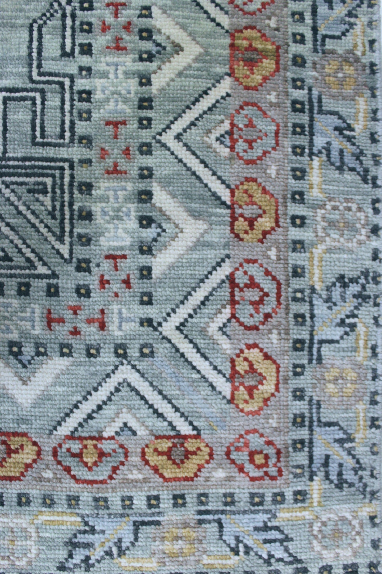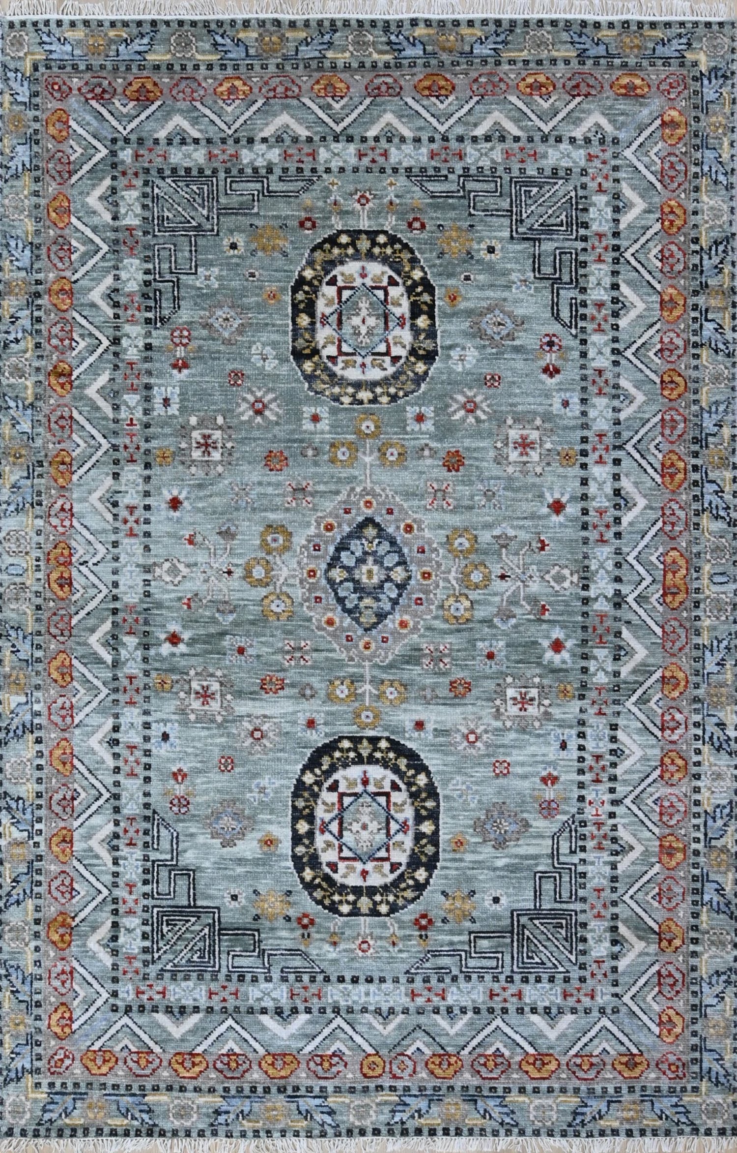 Introducing the "Soft Melody" collection, this rug originates from India and showcases the traditional Khotan design. The background of the rug is a soothing sage color, while the border is a deep charcoal shade. The main color that catches the eye is a beautiful teal hue.