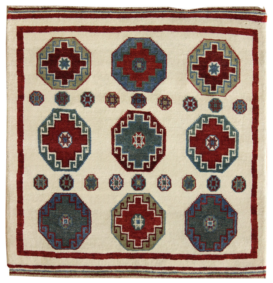 Get ready to fall in love with our Konya Handwoven Tribal Rug (34355)! This tribal Caucasian piece is ivory with red accents. The Konya design and 4' 0" X 4' 1" size make this new handwoven Indian rug a gorgeous addition to any space. Its wool pile surface on a cotton foundation means this rug is incredibly durable — you’ll be able to cherish it for years to come. Get your Konya Handwoven Tribal Rug today!