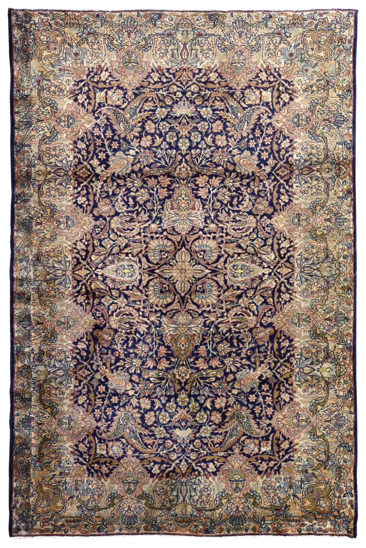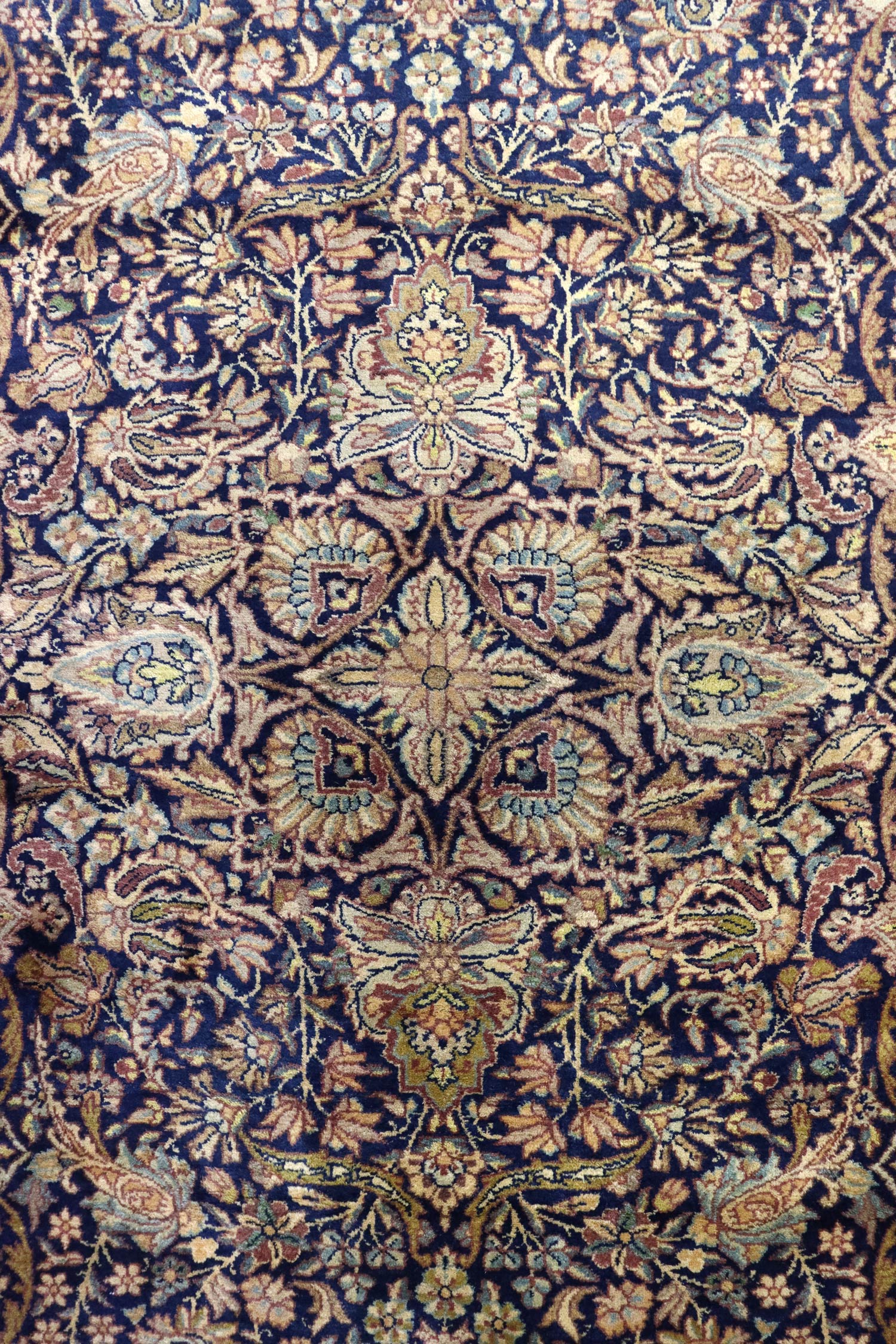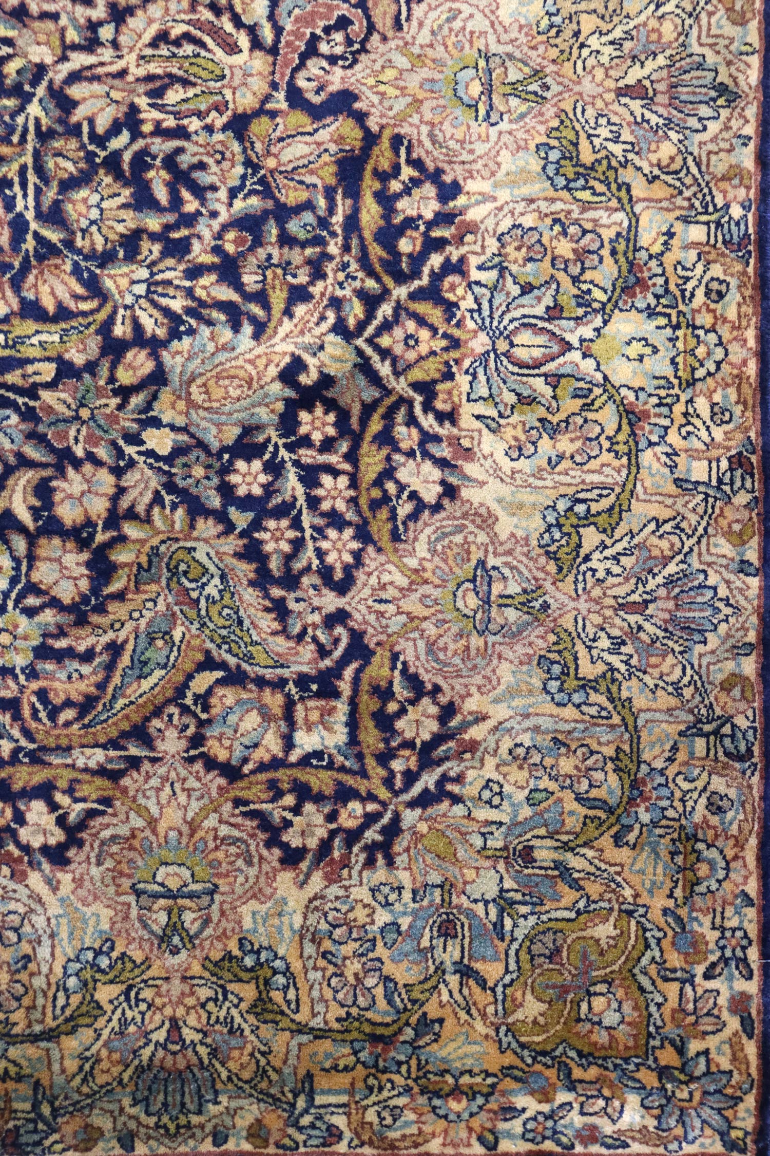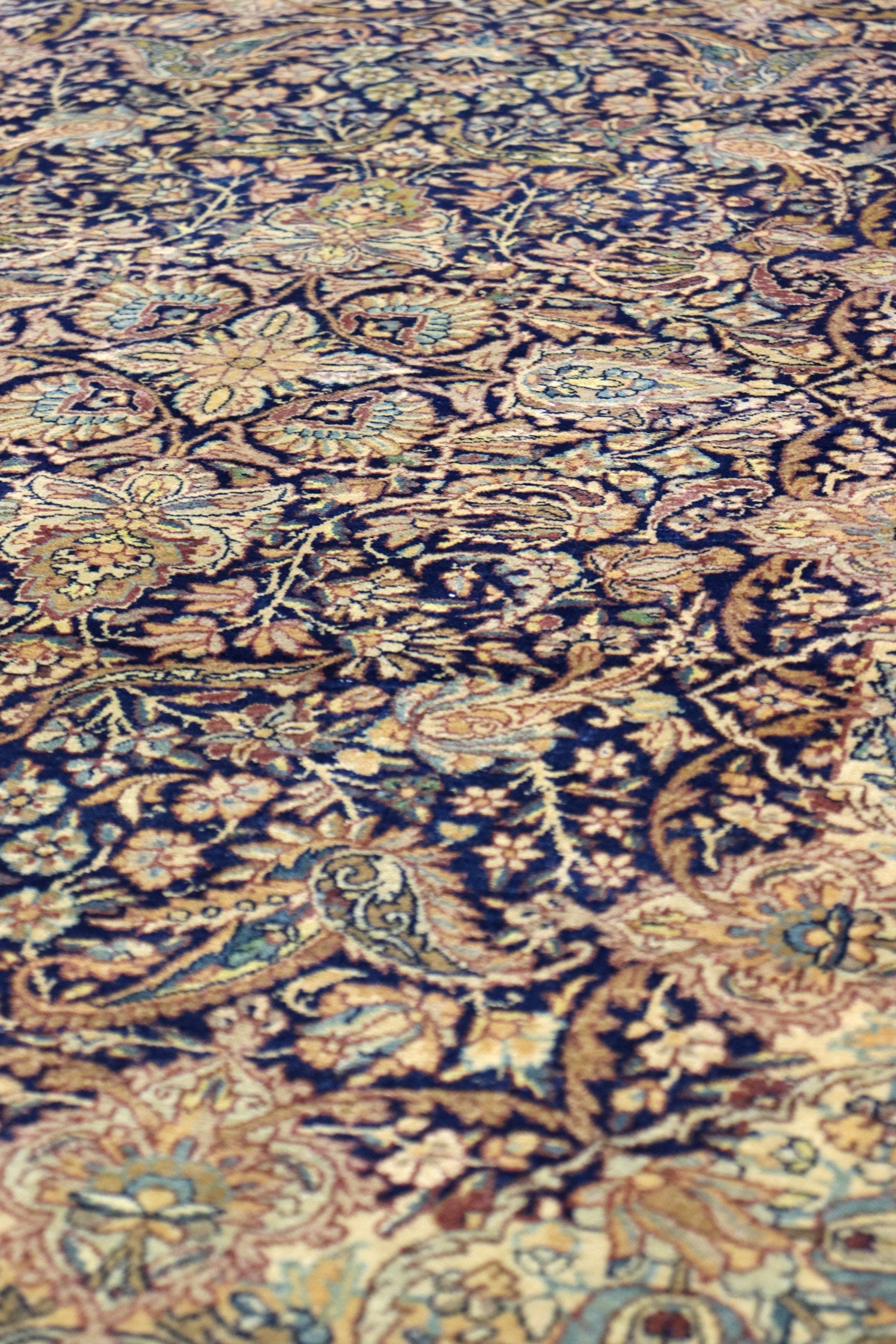 This antique Persian rug is an example of a traditional Lavar Kerman design, originating from the Kerman region in Iran and dating back to circa 1920. The rug features a navy background with gold borders, with blue being the primary color. It is constructed from wool on a cotton foundation, a typical material combination for Kerman rugs of this period.