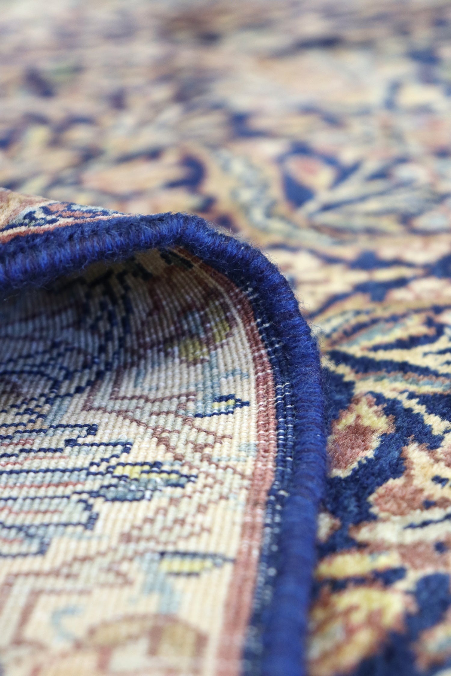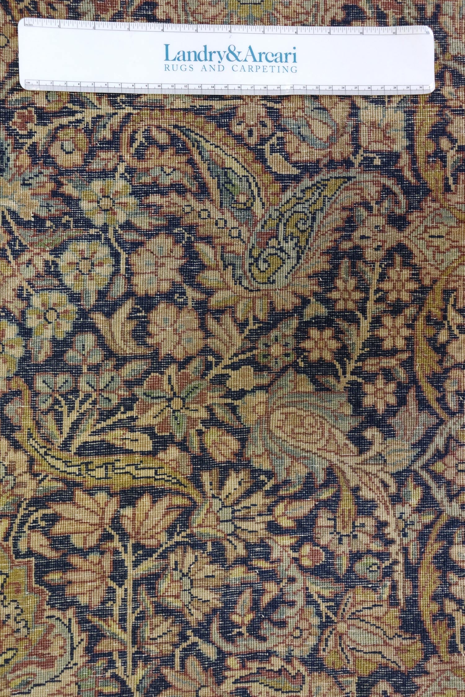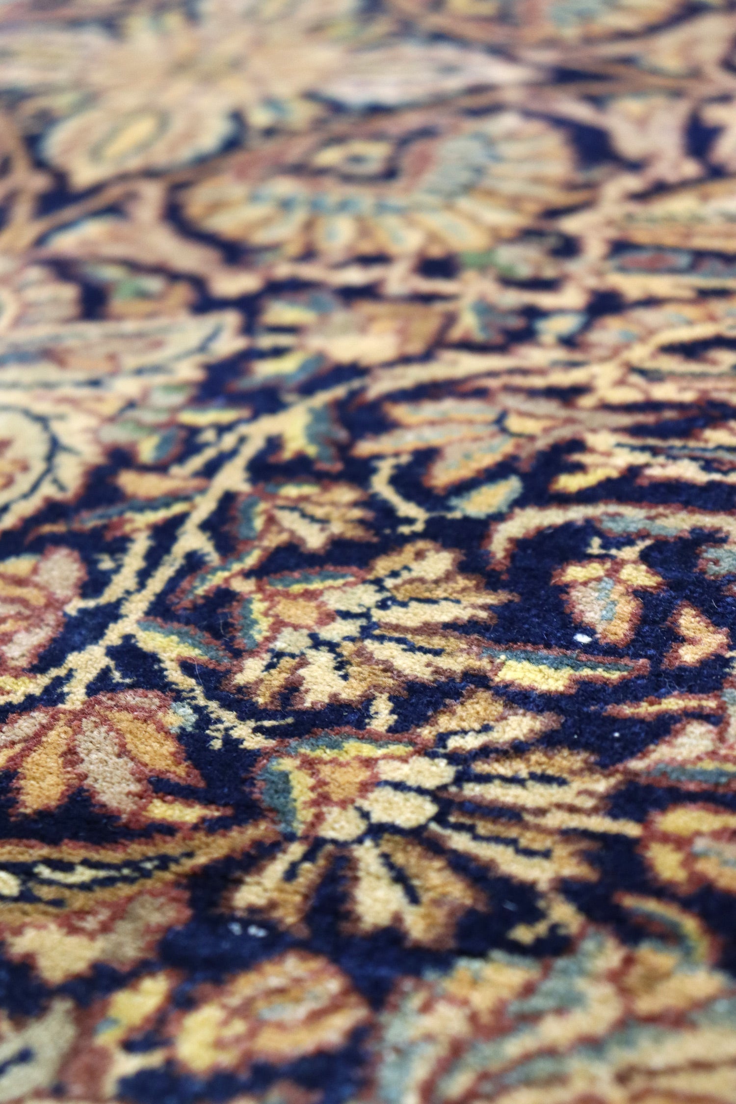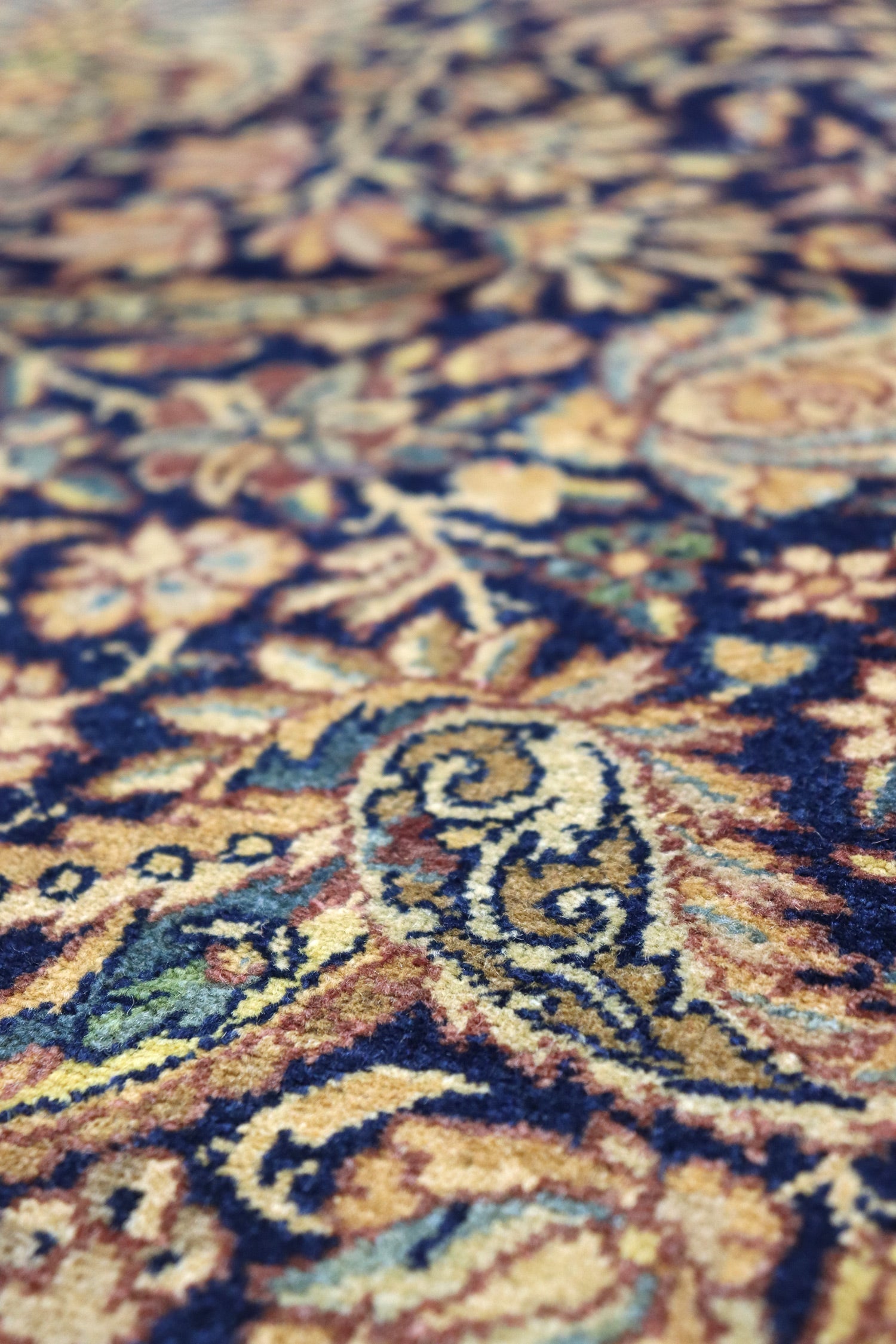 This antique Persian rug is an example of a traditional Lavar Kerman design, originating from the Kerman region in Iran and dating back to circa 1920. The rug features a navy background with gold borders, with blue being the primary color. It is constructed from wool on a cotton foundation, a typical material combination for Kerman rugs of this period.