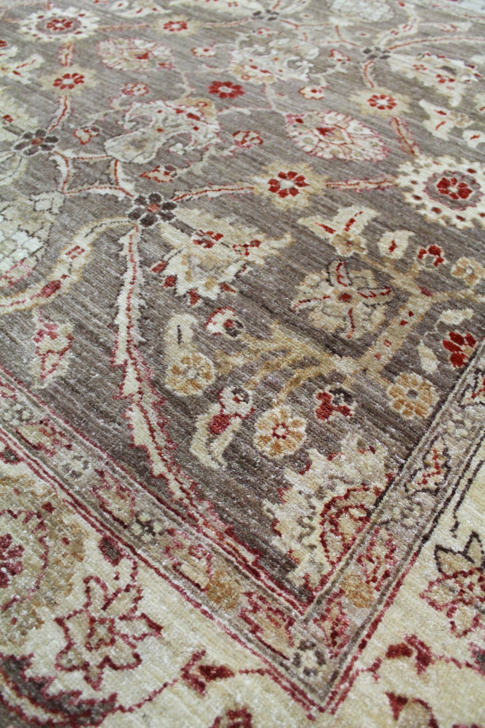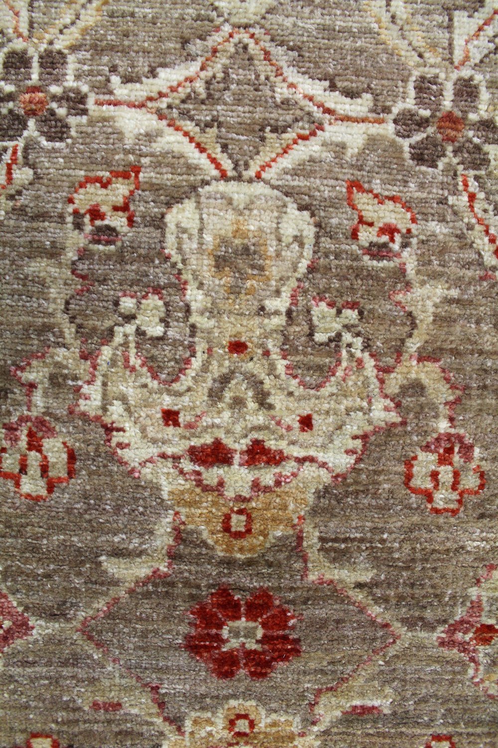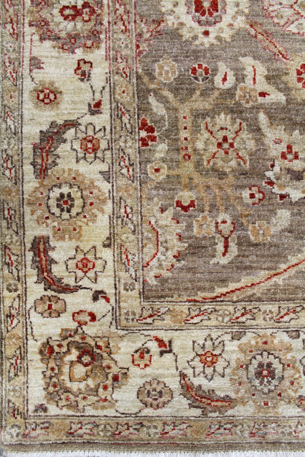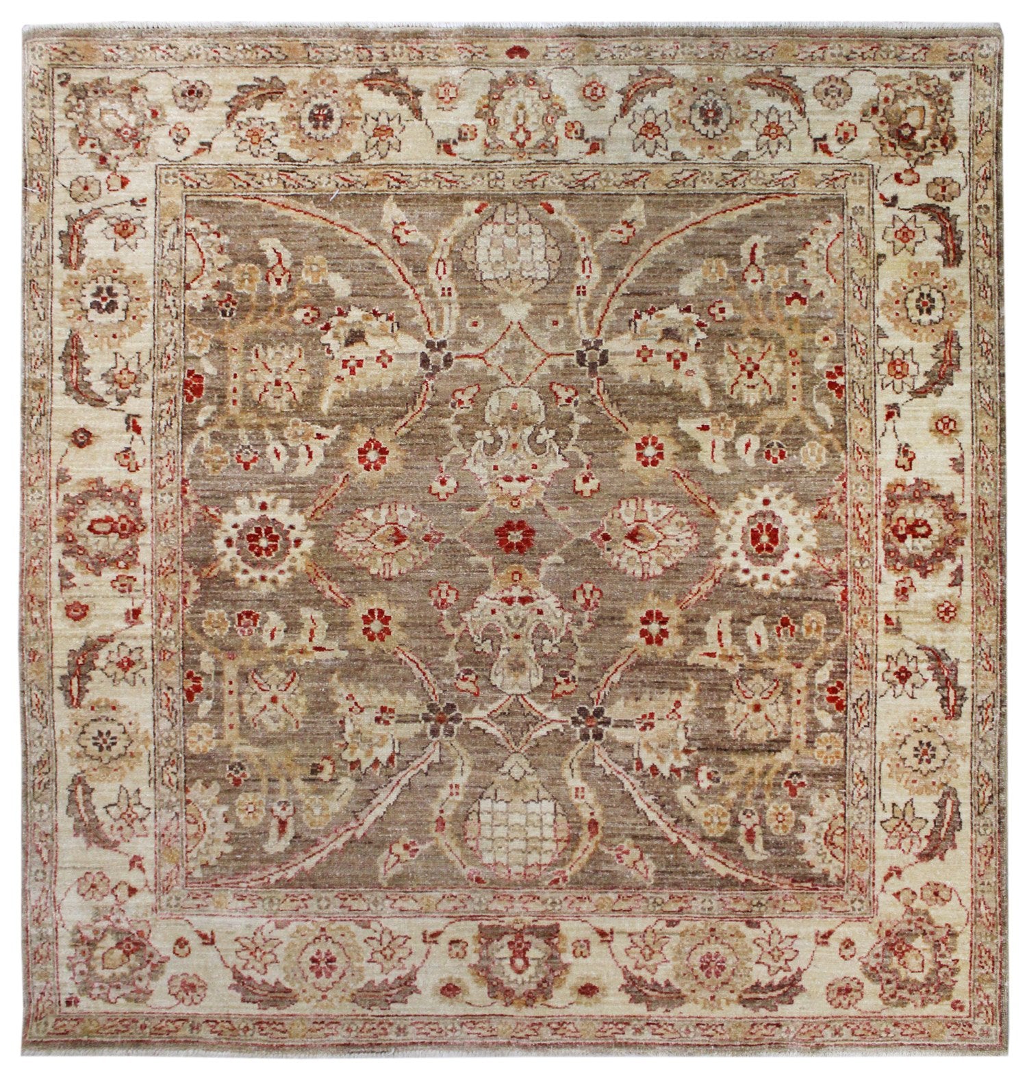 Get ready to fall in love with our Mahal Handwoven Traditional Rug (64779)! This traditional Large Scale Floral piece is brown on taupe with red accents. The Mahal design and 4' 10" X 5' 0" size make this new handwoven Pakistani rug a gorgeous addition to any space. Its wool pile surface on a cotton foundation means this rug is incredibly durable — you’ll be able to cherish it for years to come. Get your Mahal Handwoven Traditional Rug today!