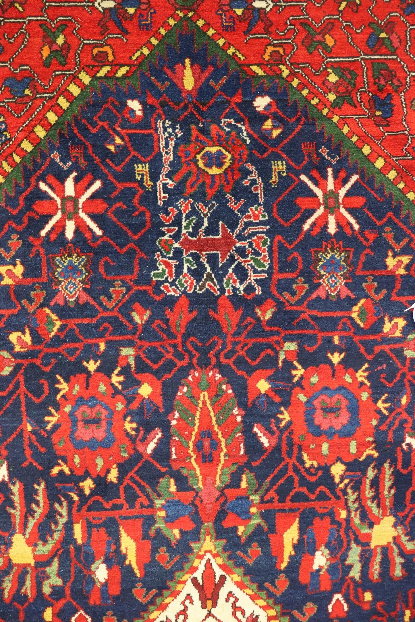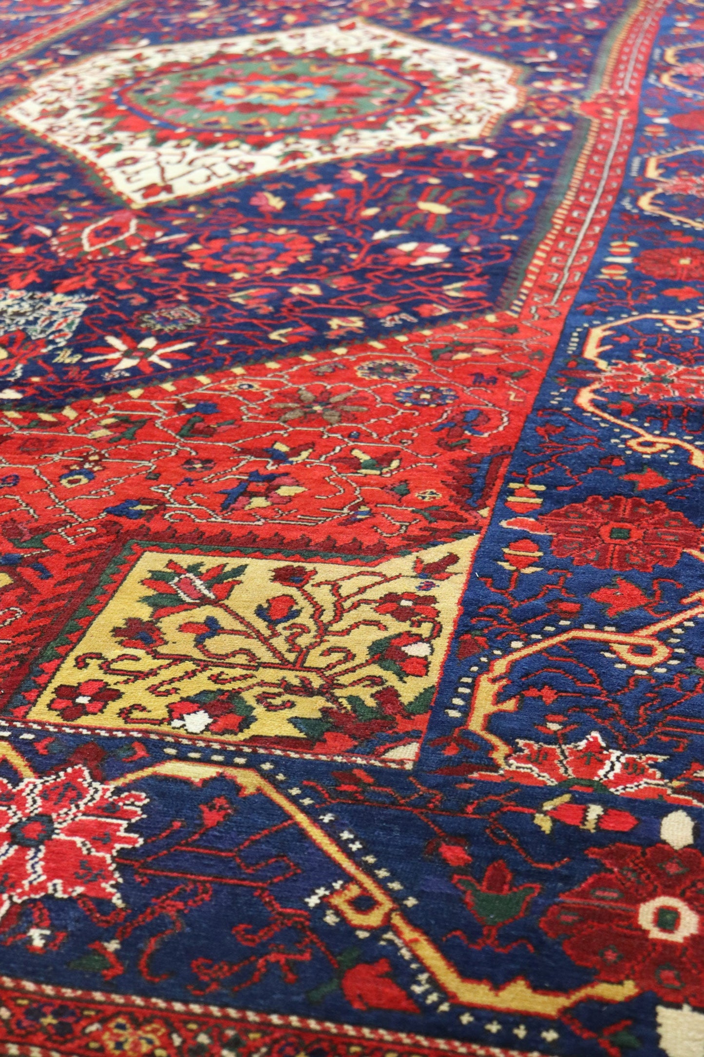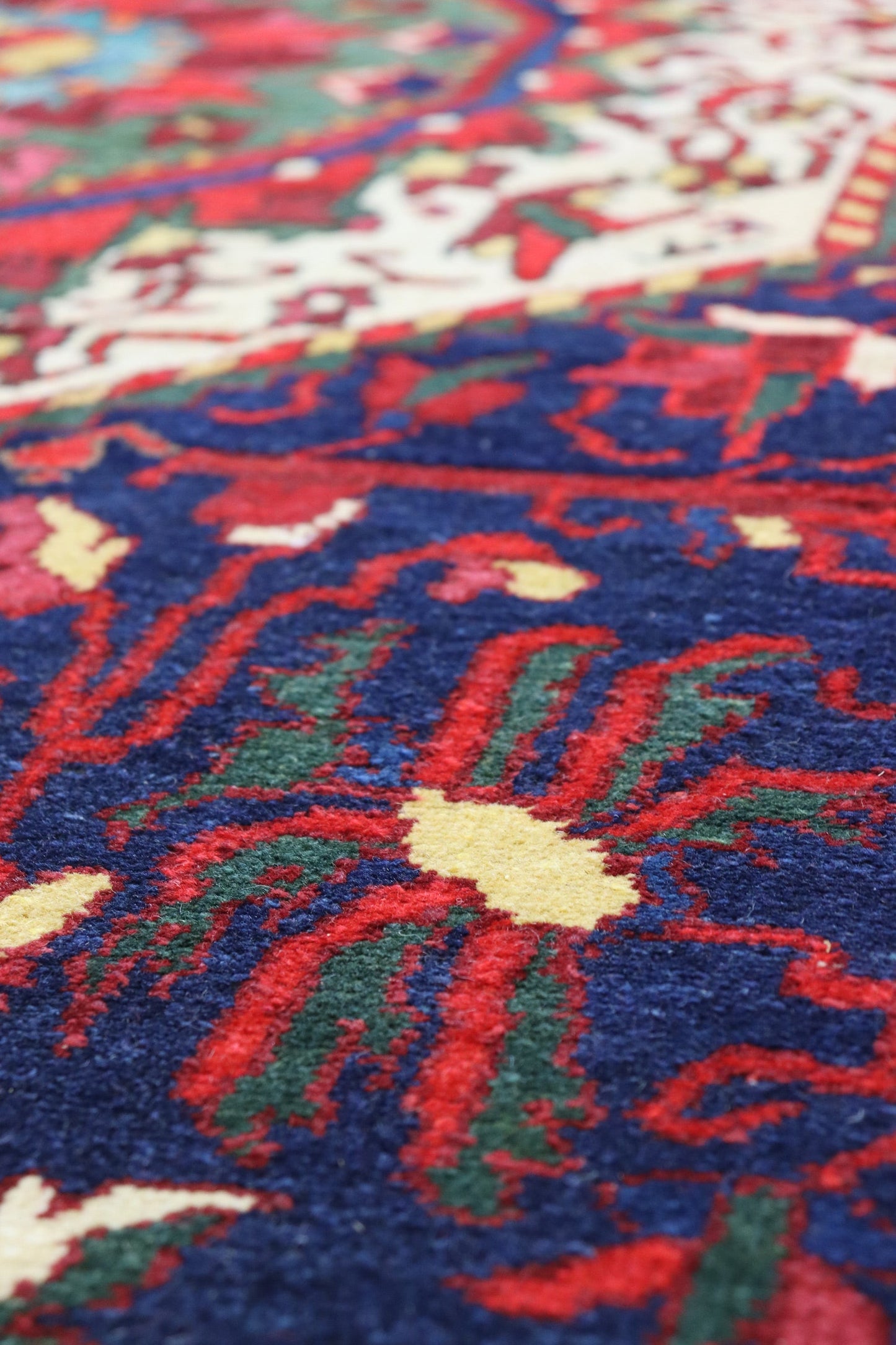 The rug is woven in wool on a cotton foundation, a common practice for Persian weavings of the era. The use of wool on cotton contributes to both the durability and the detailed appearance of the design. The background of the rug is a navy blue, creating a rich canvas for the intricate patterns and motifs that it houses. The main field incorporates an abundance of blue shades, complemented by a central red border which provides a striking contrast.