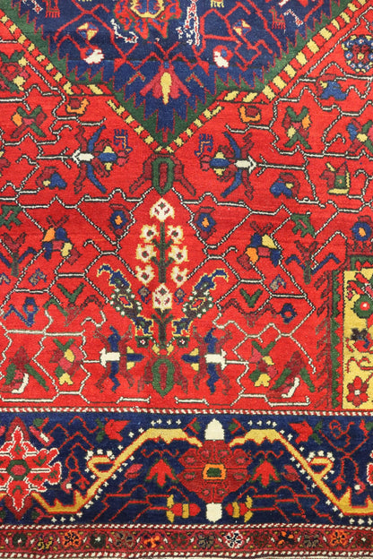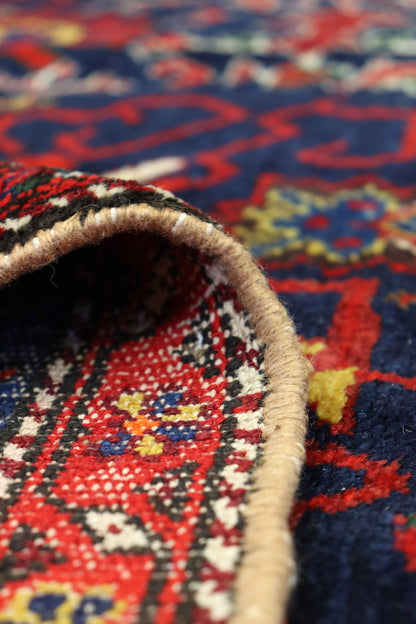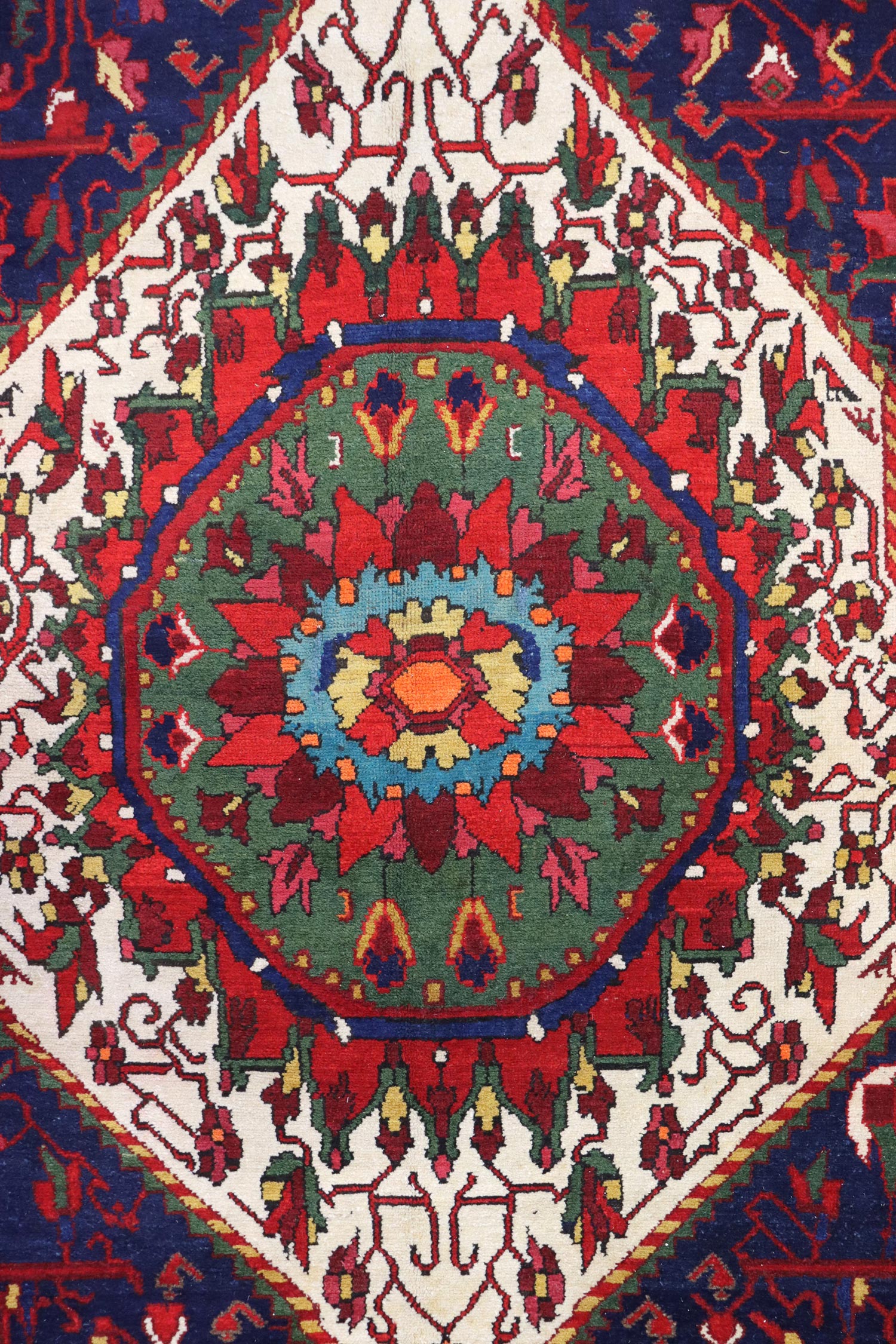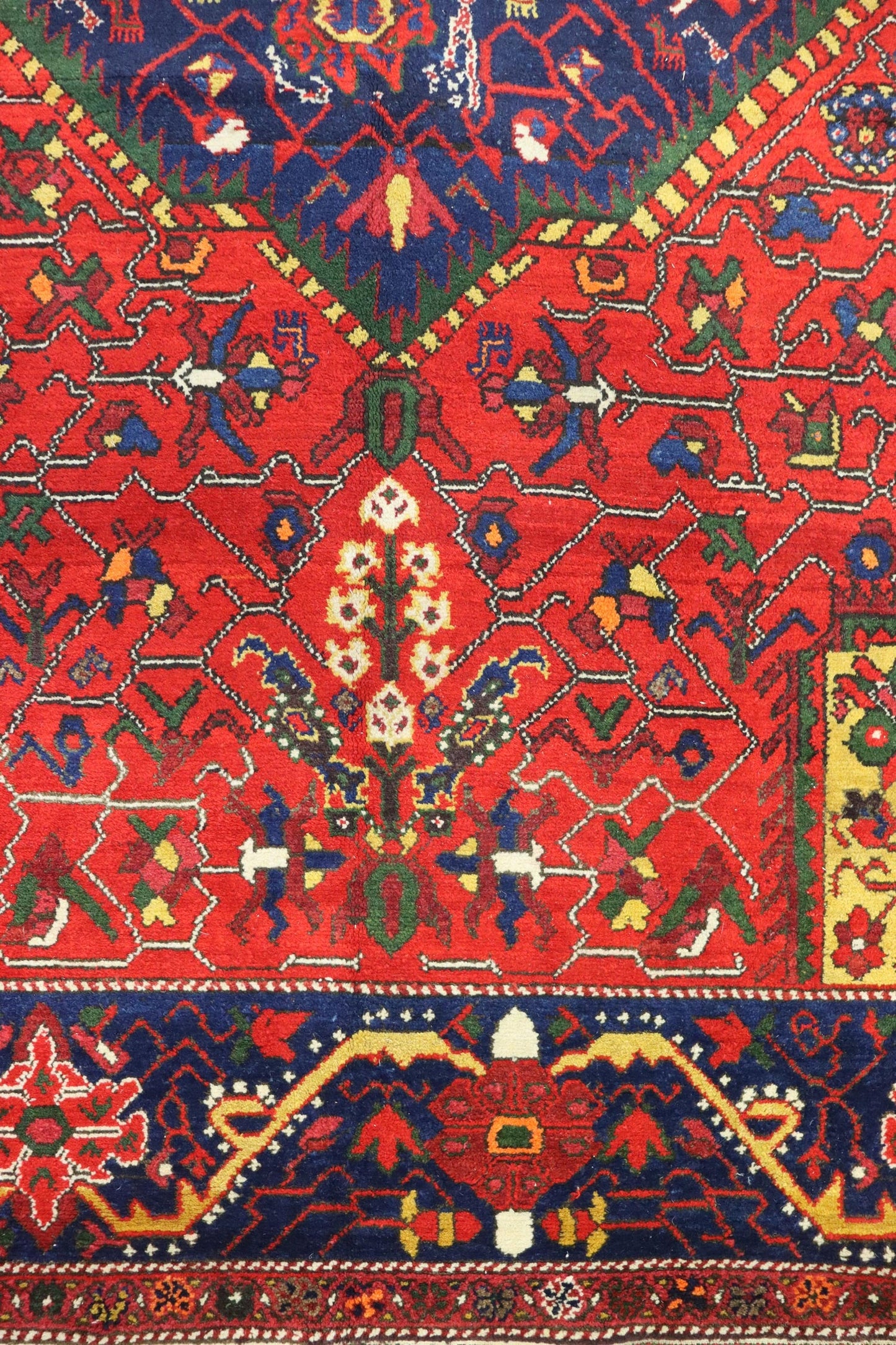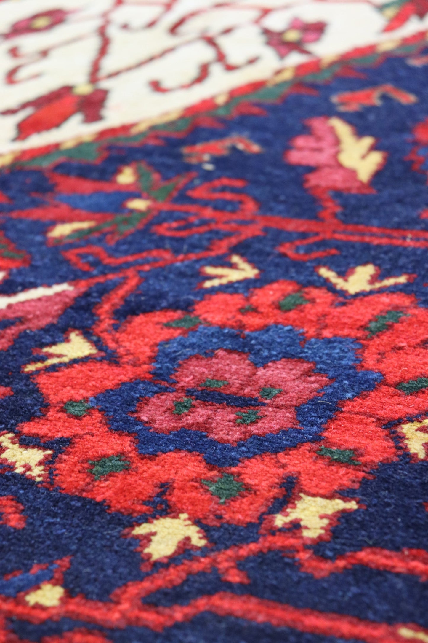 The rug is woven in wool on a cotton foundation, a common practice for Persian weavings of the era. The use of wool on cotton contributes to both the durability and the detailed appearance of the design. The background of the rug is a navy blue, creating a rich canvas for the intricate patterns and motifs that it houses. The main field incorporates an abundance of blue shades, complemented by a central red border which provides a striking contrast.