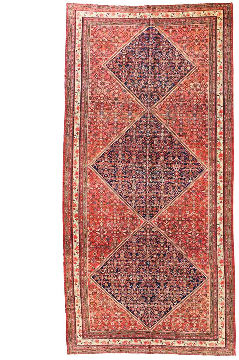 Malayer rugs are noted for their versatile color palettes, and this rug is no exception. It showcases a predominant red background with dark blue diamond-shaped medallions arranged in a vertical sequence, creating a strong contrast and focal point. Additionally, cream, pink, green, and lighter blues are subtly interspersed throughout the intricate design, enhancing the rug's overall visual appeal.