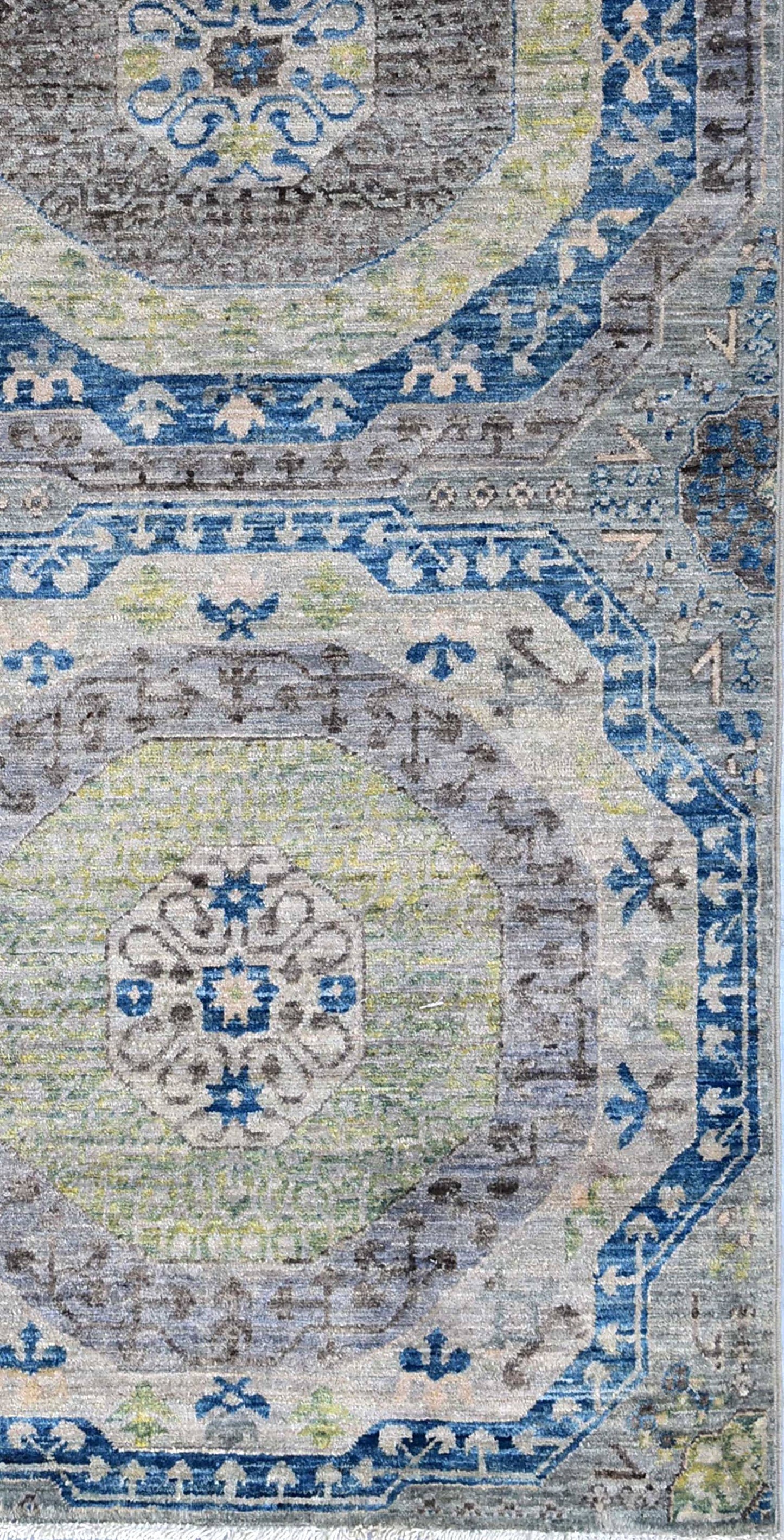 Introducing the stunning Afghani rug with a touch of elegance. Originating from Afghanistan, this rug features the exquisite Mamluk design, showcasing a transitional style that seamlessly combines traditional and modern elements. Its silver background beautifully contrasts with the emerald green border, creating a visually captivating piece.
