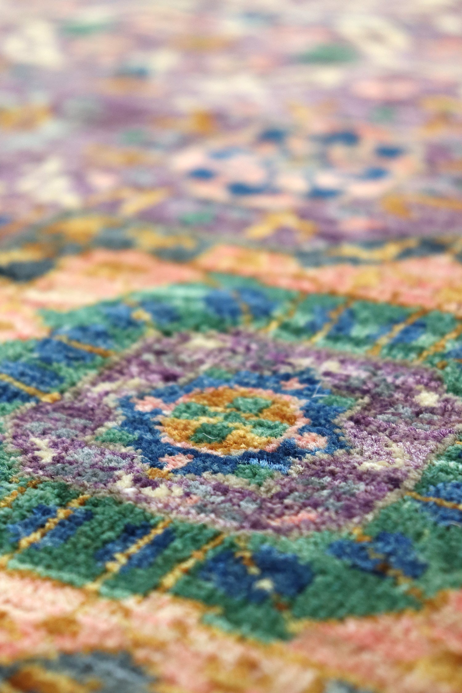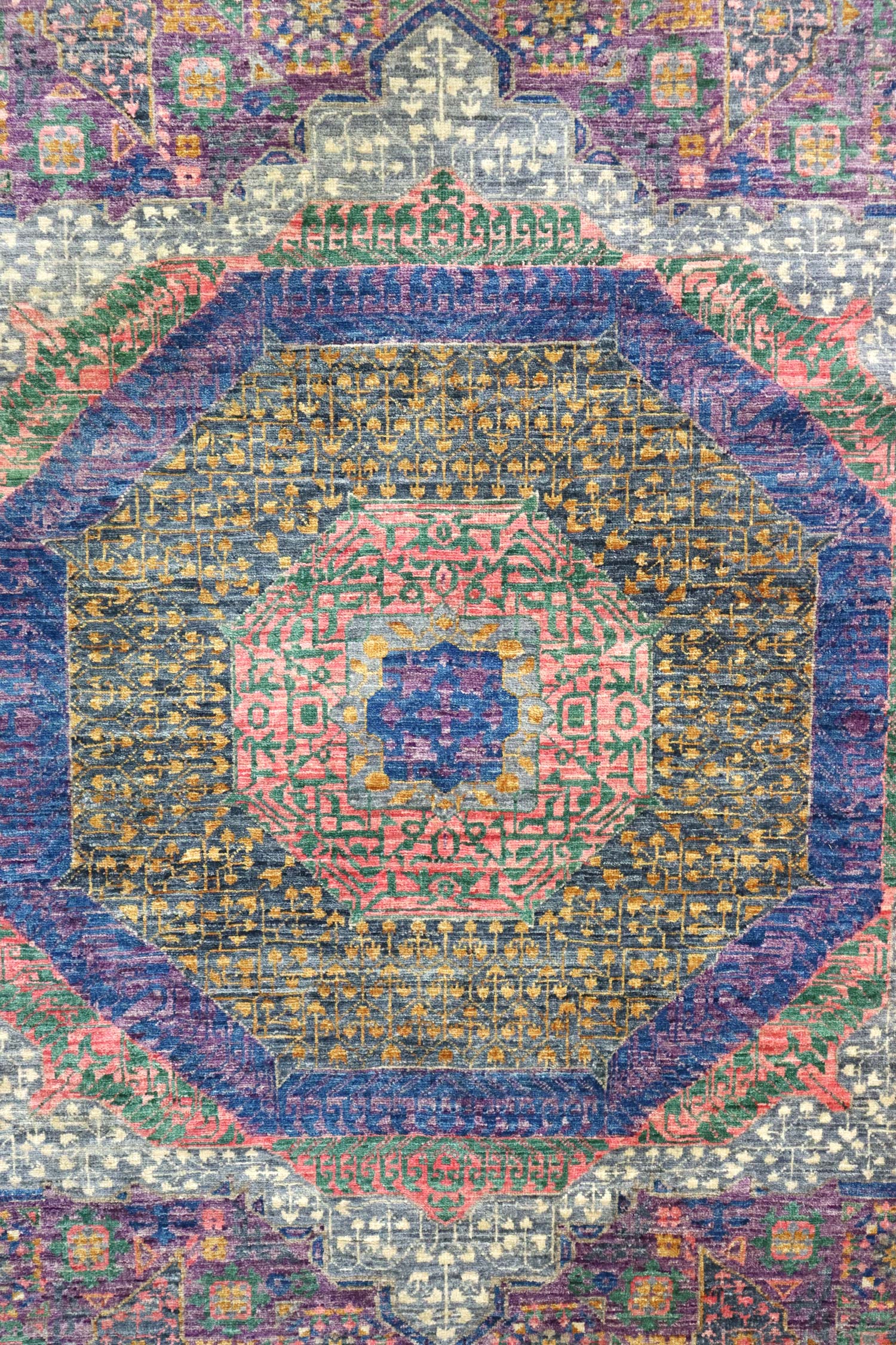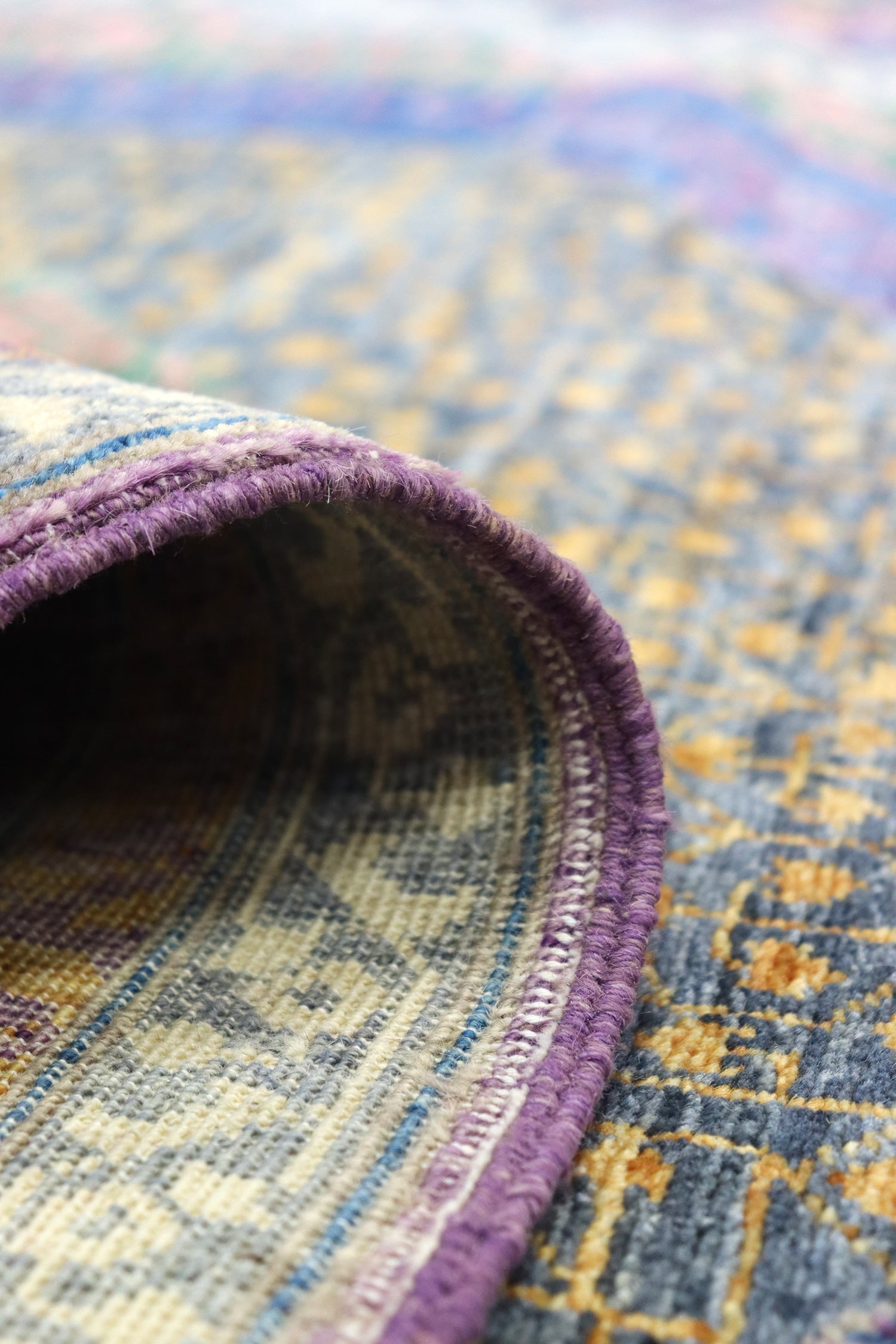 Measuring at 8'11" X 12'1", this rug is a substantial and impactful piece that can transform any space. With a remarkable knots per square inch count of 162, we calculated that this rug boasts an impressive total of 2,502,426 individually hand-tied knots.