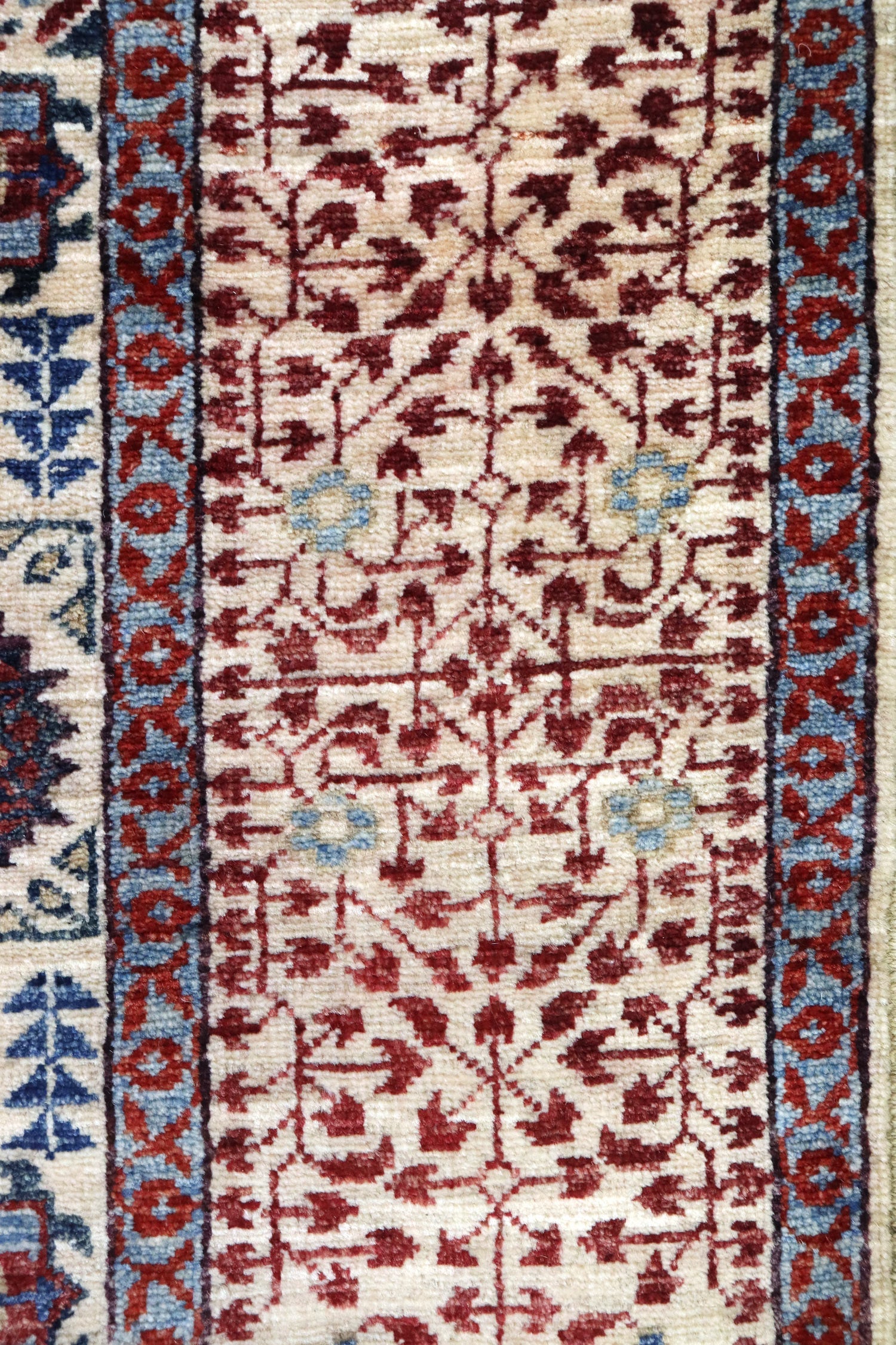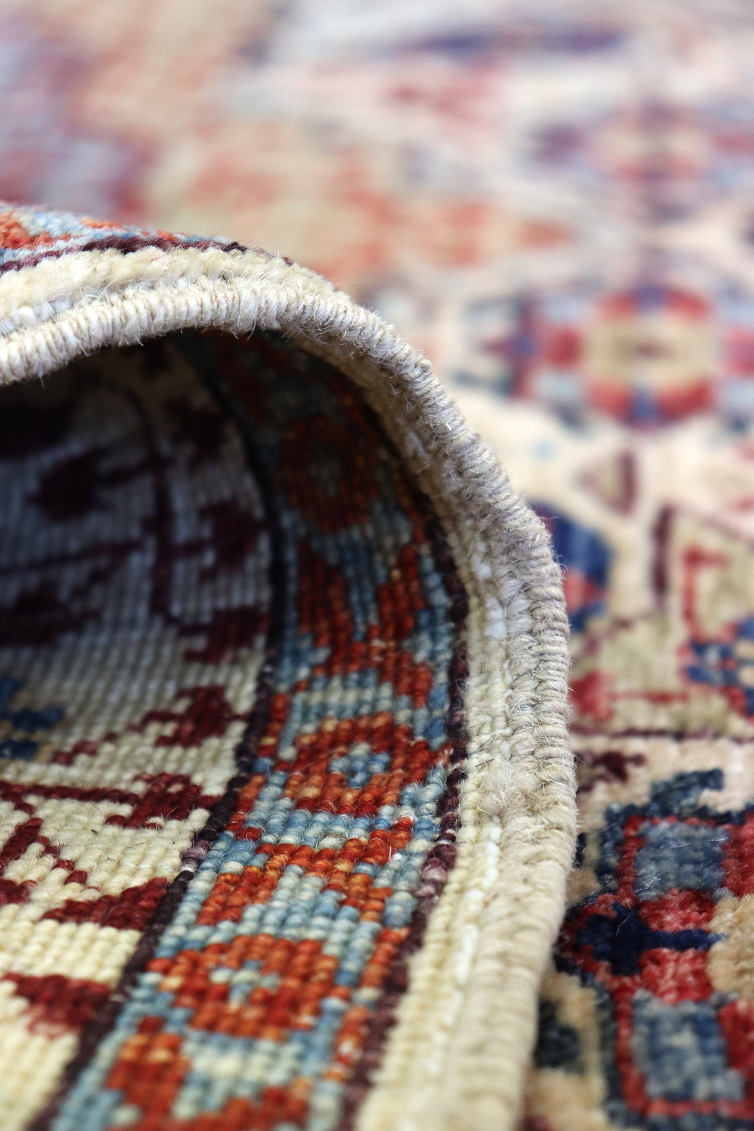 A testimony to its durability, this handwoven rug is double-wefted, with a heavily packed and depressed warp weaving technique. Moreover, the use of centuries-old all-natural dye stuffs adds an authentic touch to its vibrant colors.
