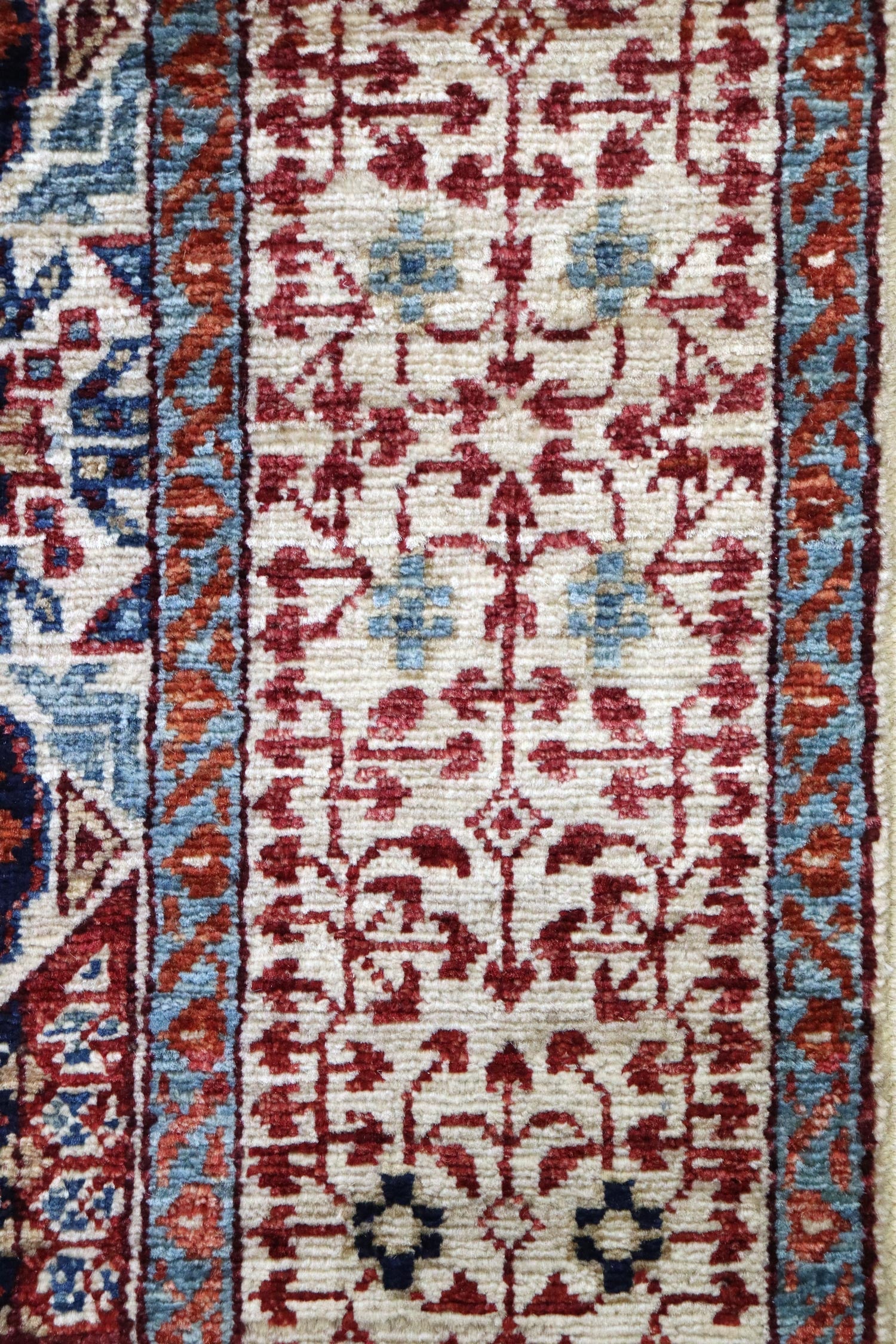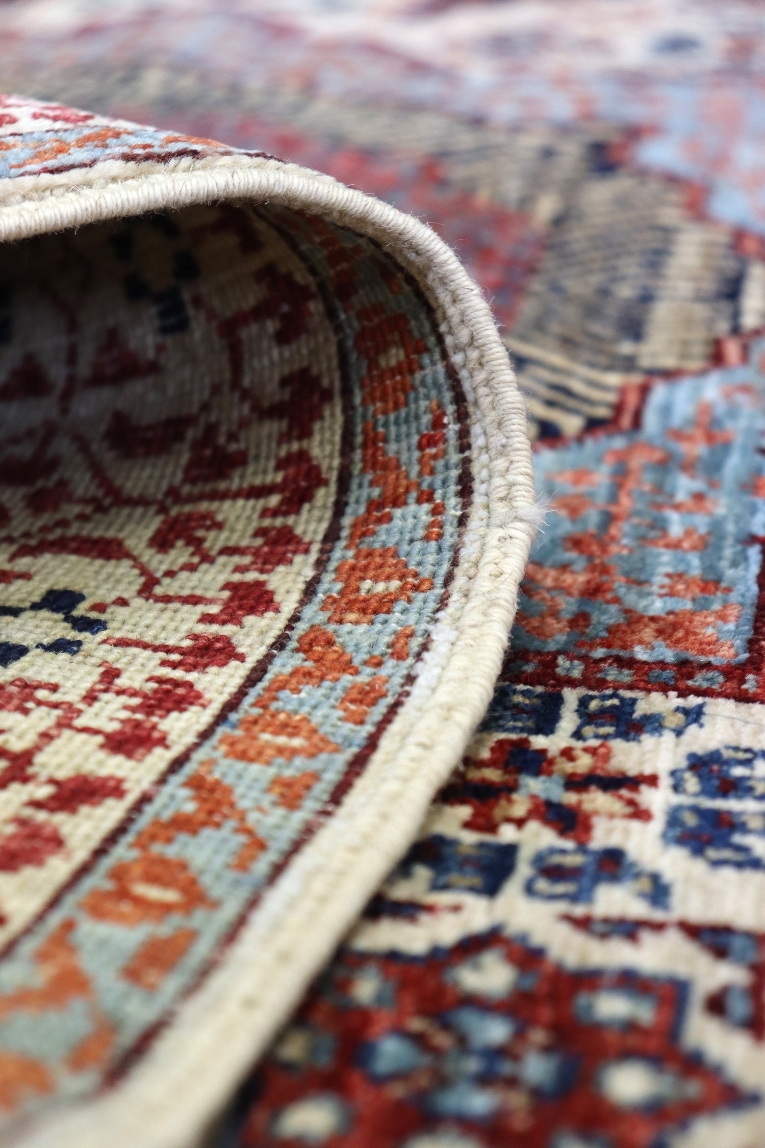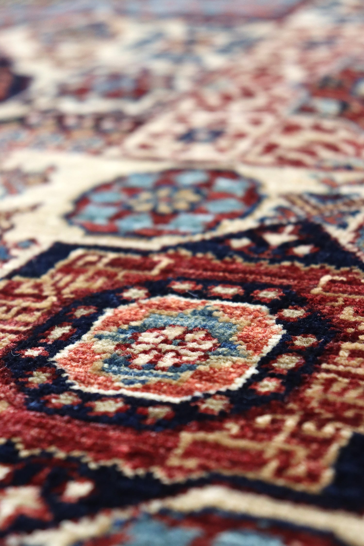To ensure the highest quality, the wool used in this rug comes from sheep grazing in the mountainous terrain of the Ghazni Province. This environment produces longer staple, oily wool that is ideal for carpet weaving. The raw Ghazni wool is then transported to the western side of Afghanistan, near Herat, where it is hand carted and spun into carpet yarn, ready for the weaving process.