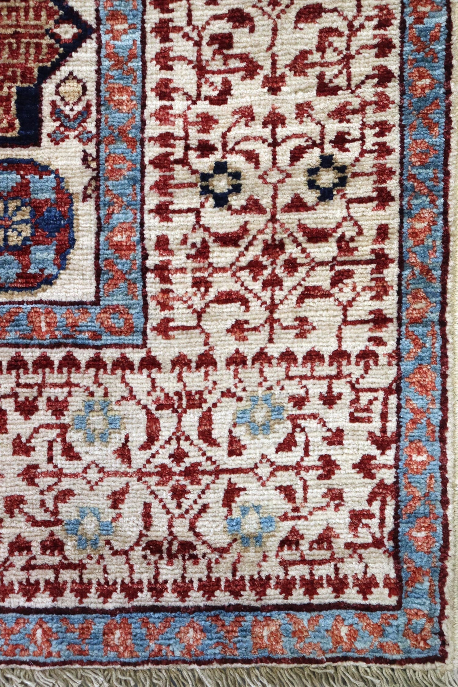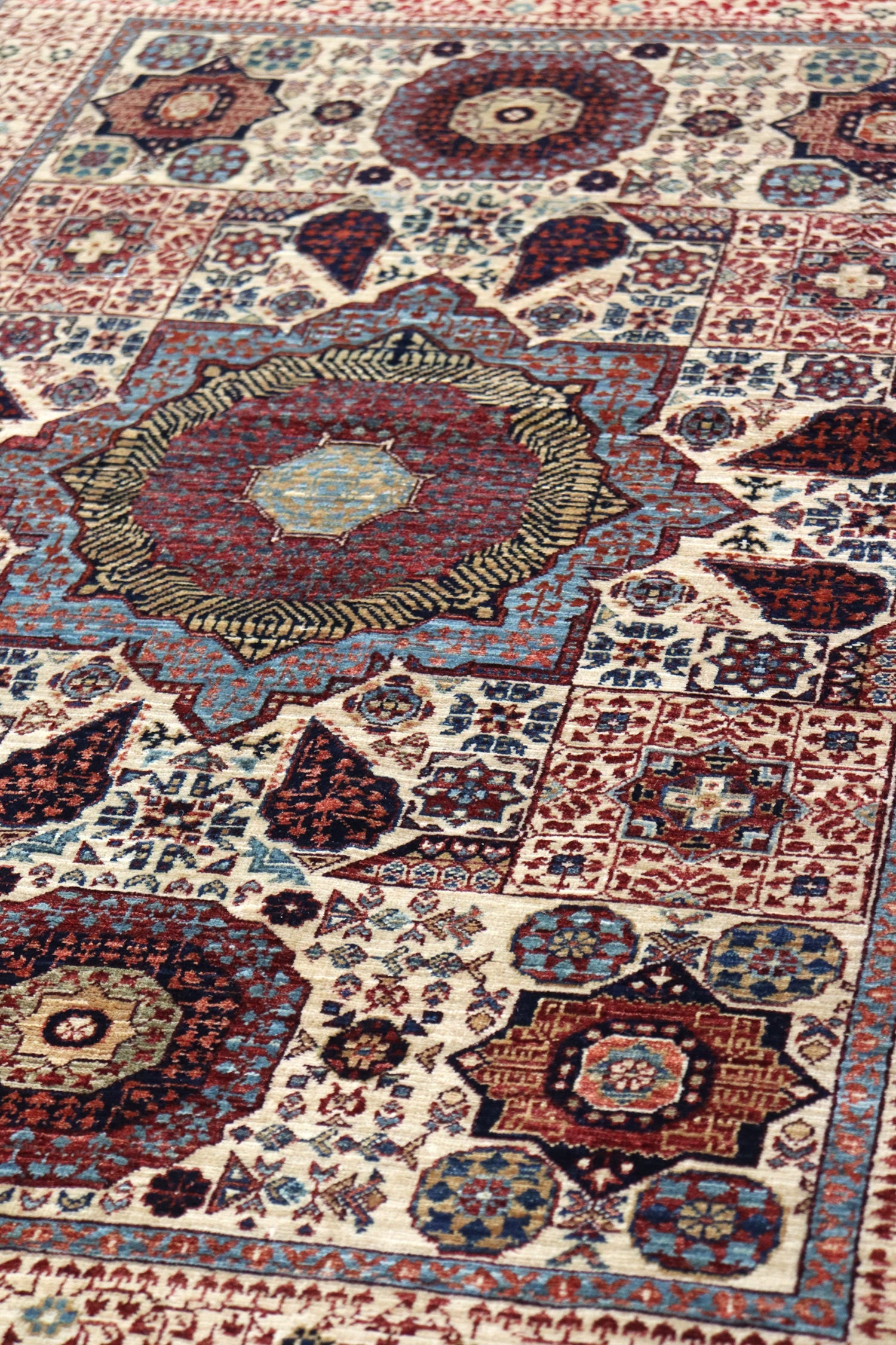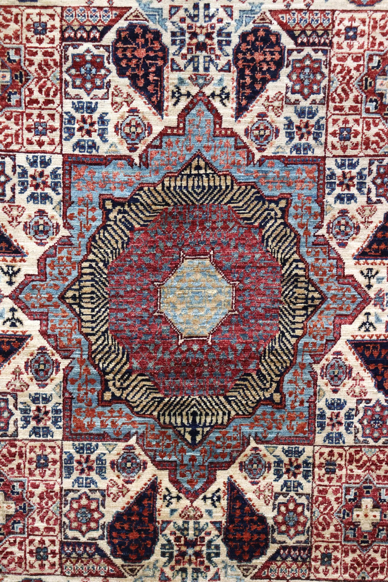 To ensure the highest quality, the wool used in this rug comes from sheep grazing in the mountainous terrain of the Ghazni Province. This environment produces longer staple, oily wool that is ideal for carpet weaving. The raw Ghazni wool is then transported to the western side of Afghanistan, near Herat, where it is hand carted and spun into carpet yarn, ready for the weaving process.