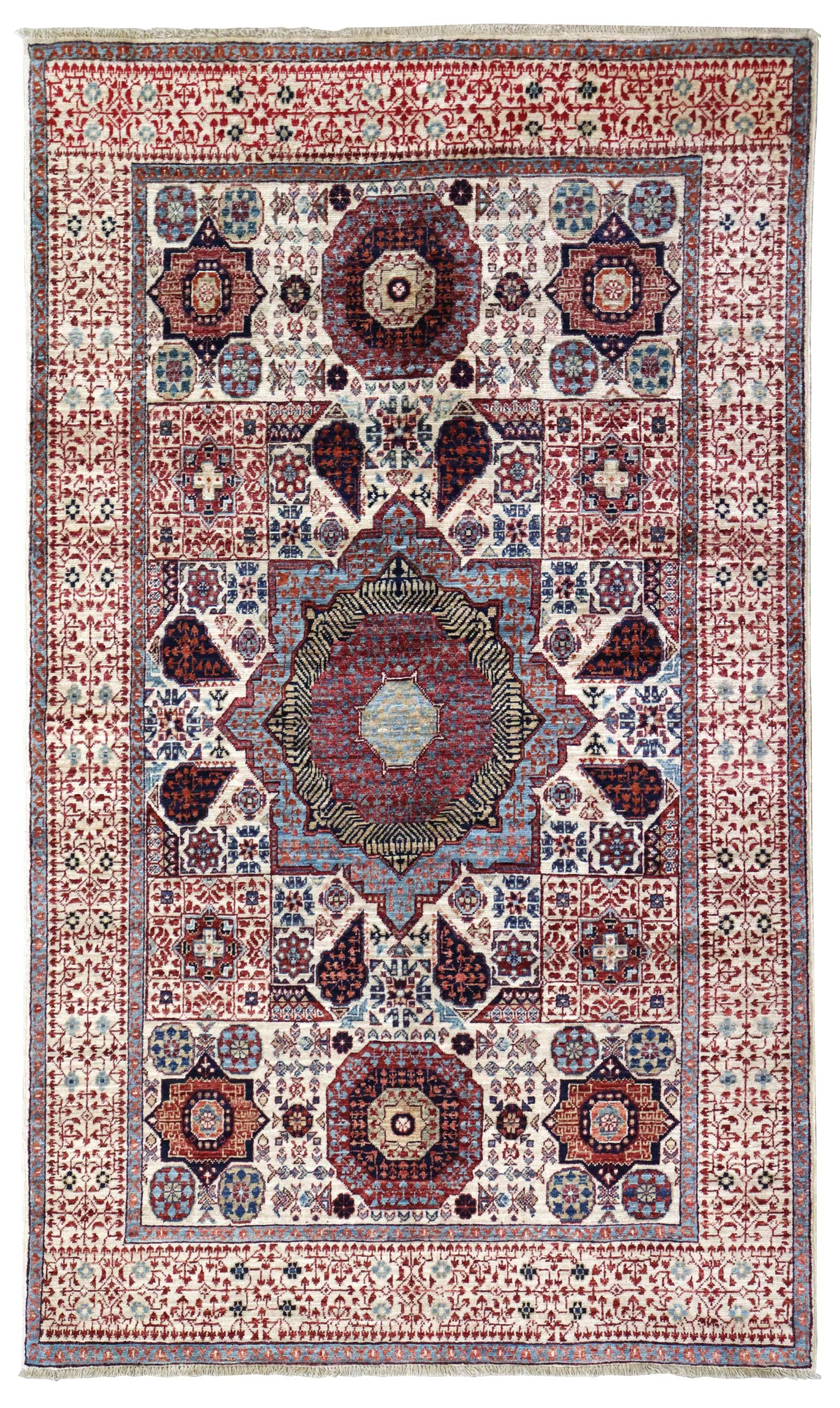 What truly sets this rug apart is the use of centuries-old natural dye stuffs. These dyes, derived from various plant and mineral sources, lend a rich and authentic color palette to the rug. The background features a soothing beige hue, beautifully complemented by a cherry border, adding depth and character to the overall design.