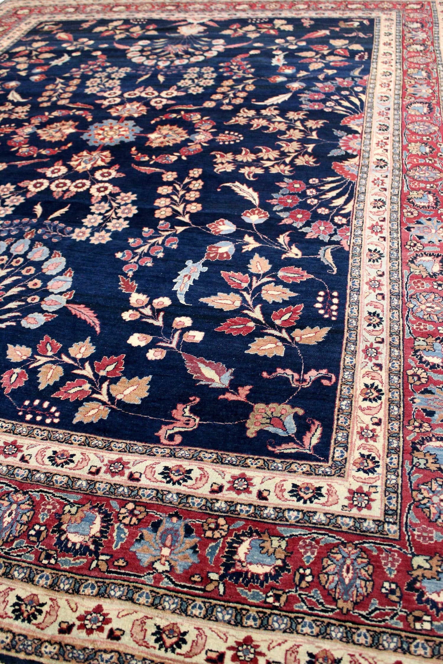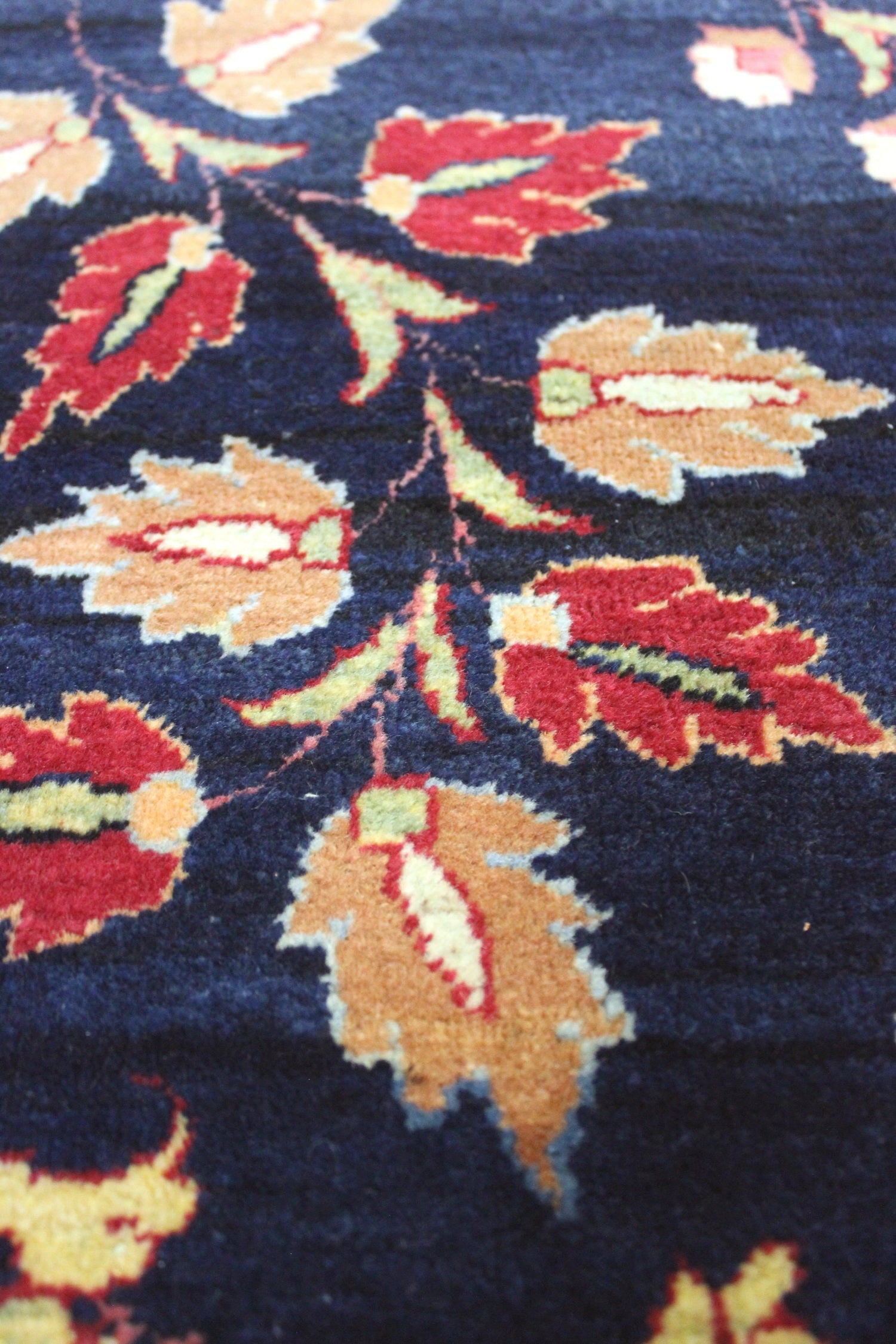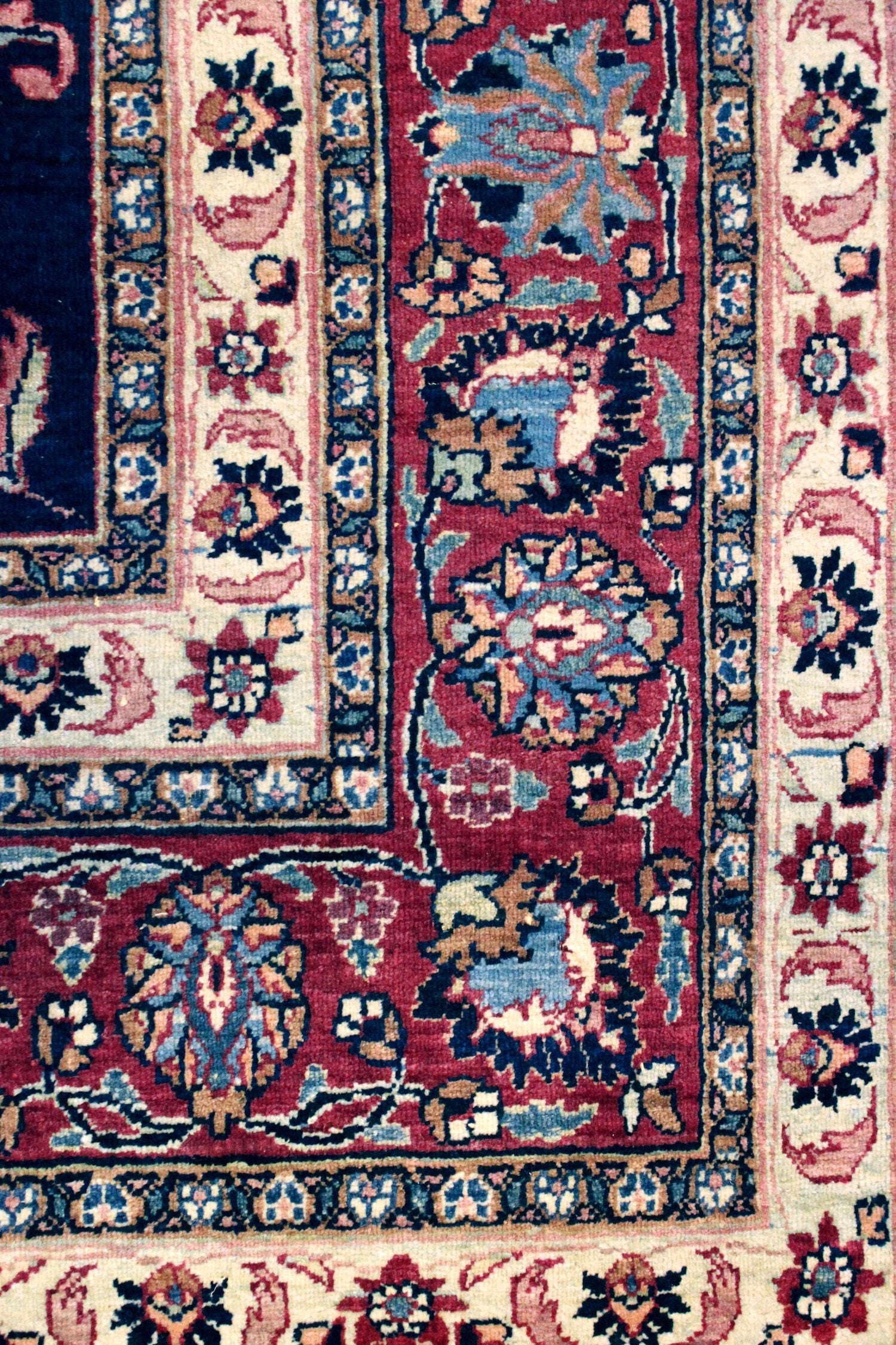 The rug originates from Mashad, a city in Northeastern Iran, and features a traditional design. It was produced circa 1920 and is constructed with a wool pile on a cotton foundation. The primary background color is navy blue, complemented by a wine-colored border. The main color of the rug is blue, consistent with the typical color palette of Mashad rugs.