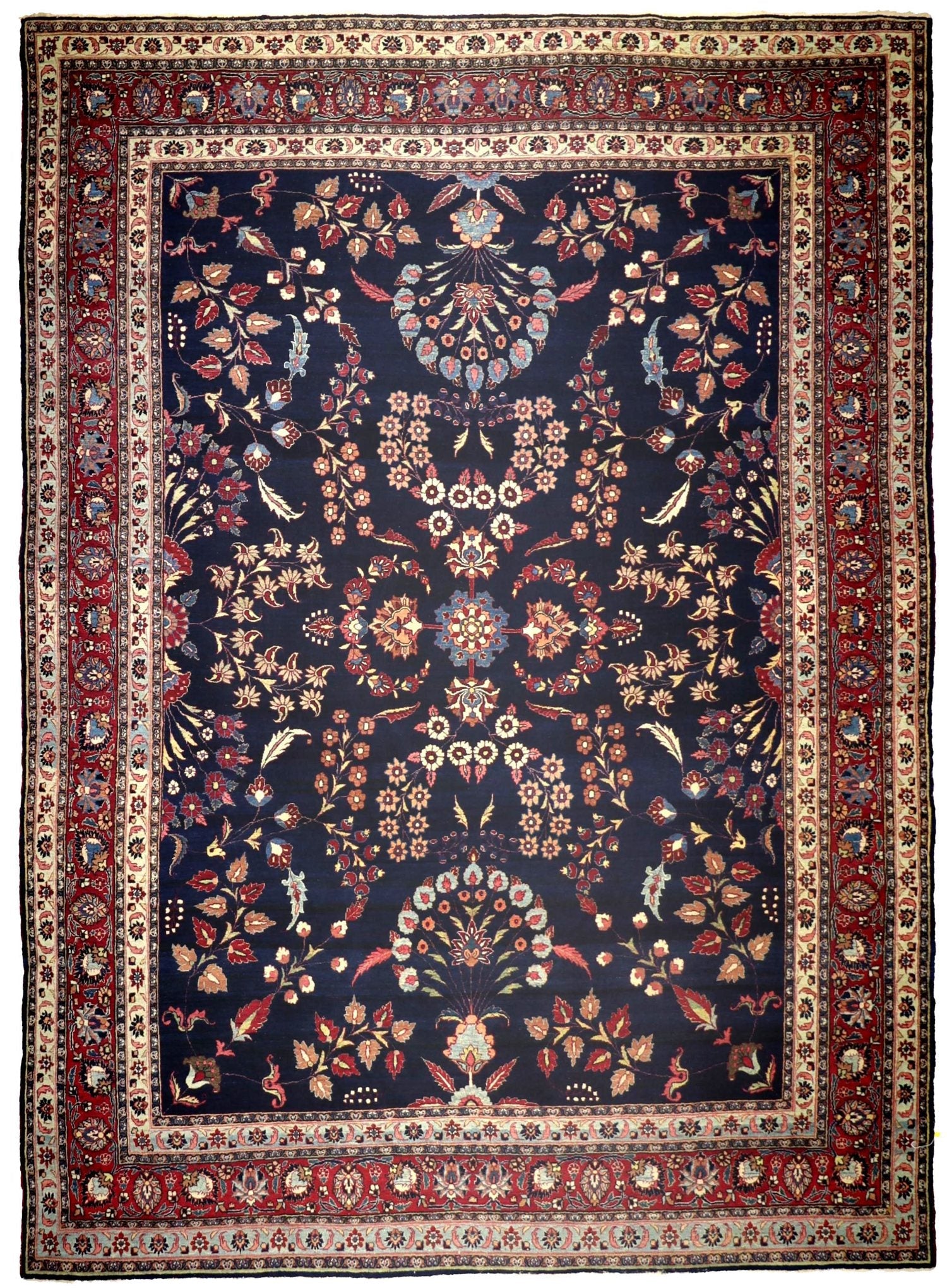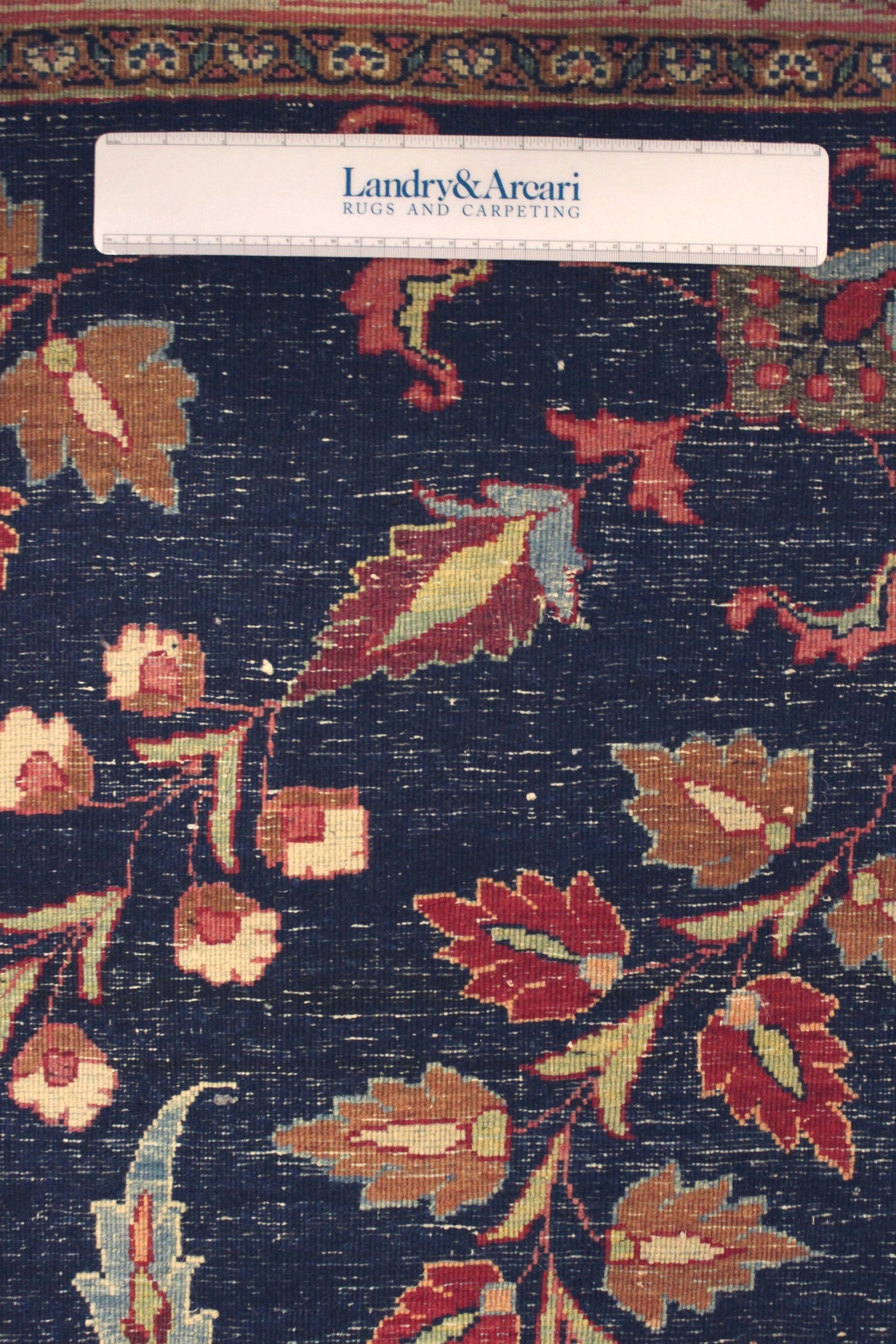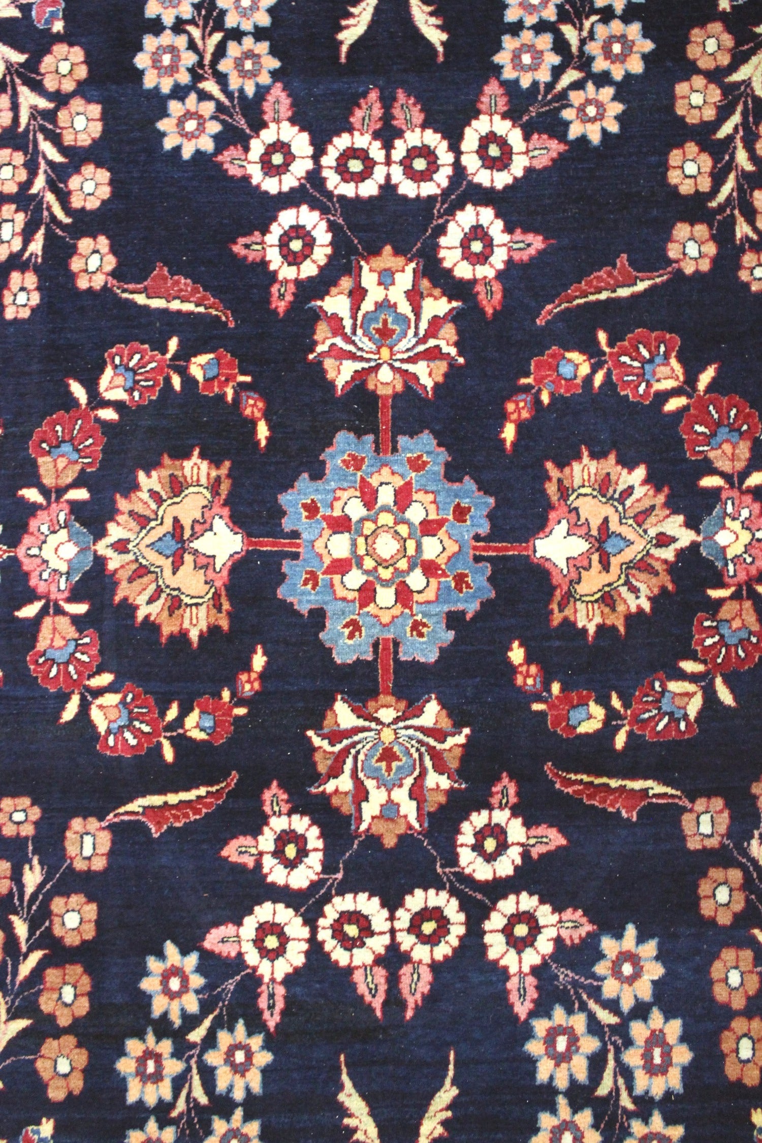 The rug originates from Mashad, a city in Northeastern Iran, and features a traditional design. It was produced circa 1920 and is constructed with a wool pile on a cotton foundation. The primary background color is navy blue, complemented by a wine-colored border. The main color of the rug is blue, consistent with the typical color palette of Mashad rugs.
