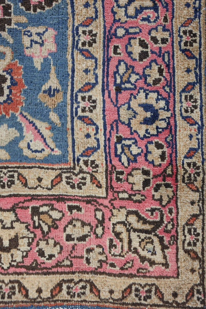 The rug originates from Mashad, a prominent city in Northeastern Iran known for its significant contributions to Persian rug craftsmanship. This particular rug, woven around 1920, exemplifies traditional Mashad design elements with a light blue background and a contrasting pink border. The main color is blue, with the rug crafted from wool on a cotton foundation.
