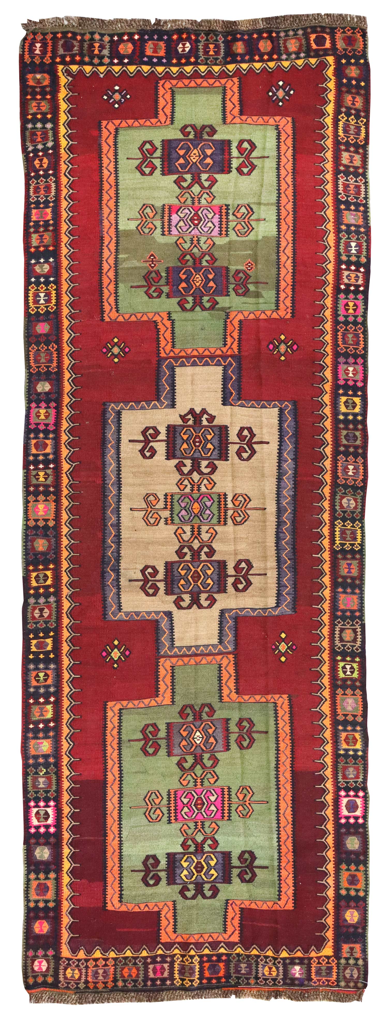 Make your house truly feel like home with our Vintage Meshkin Kilim Handwoven Tribal Rug (J67869). It's vintage (circa 1960) and tribal. It’s red on burgundy with green accent colors. It’s a Kilim style rug with a Meshkin Kilim motif. All things you gravitate towards when it comes to aesthetics and design in your space. Being a 4' 5" X 12' 2" rug of wool flatweave on a wool foundation, you can rest assured that this piece will do more than just make the visual impact and create the vibe you want. It comes from the fine Persian tradition of handwoven rugmaking, meaning this rug will serve you well and look terrific for years. Add that extra special personal touch today with your own Vintage Meshkin Kilim Handwoven Tribal Rug.