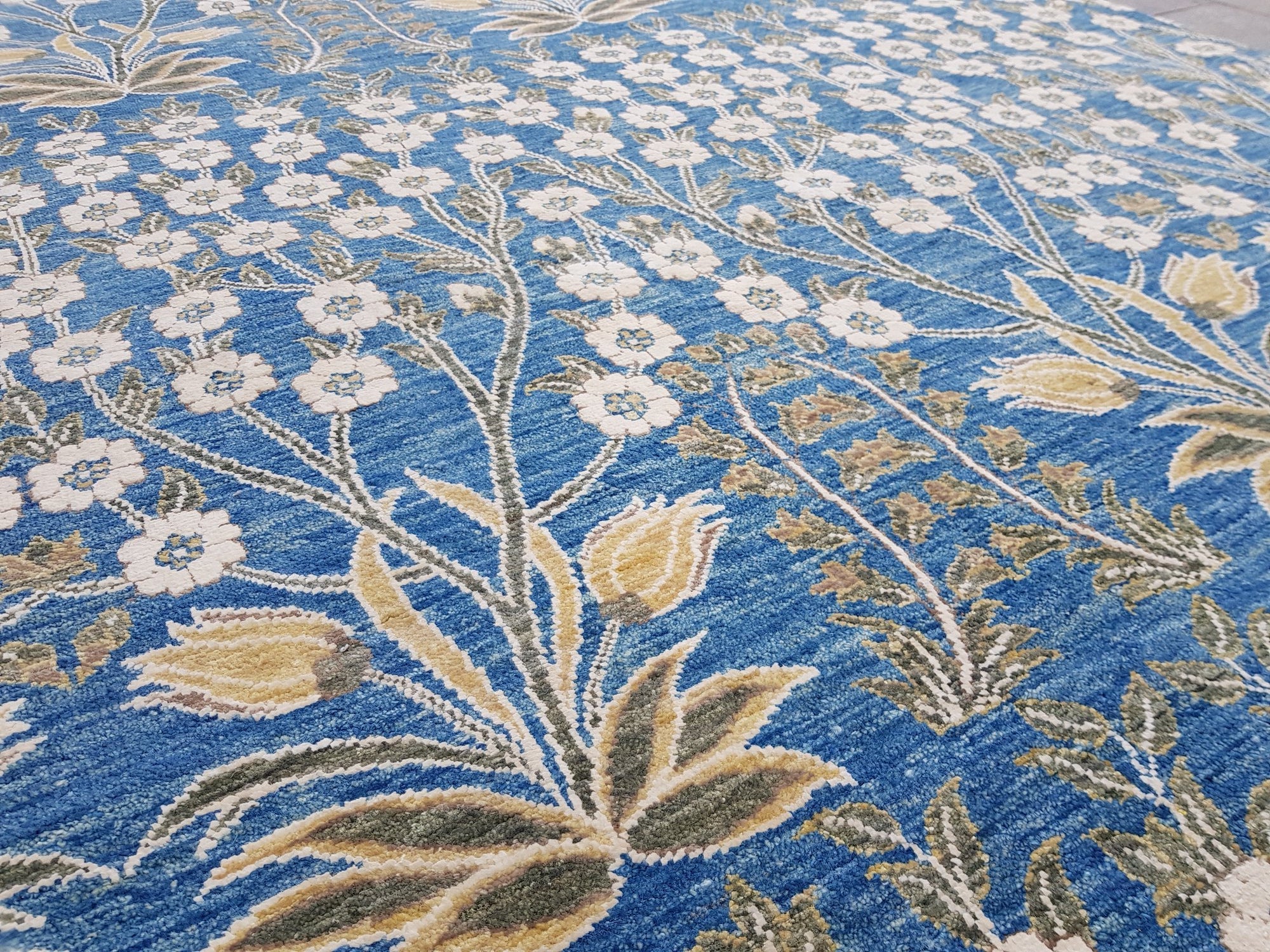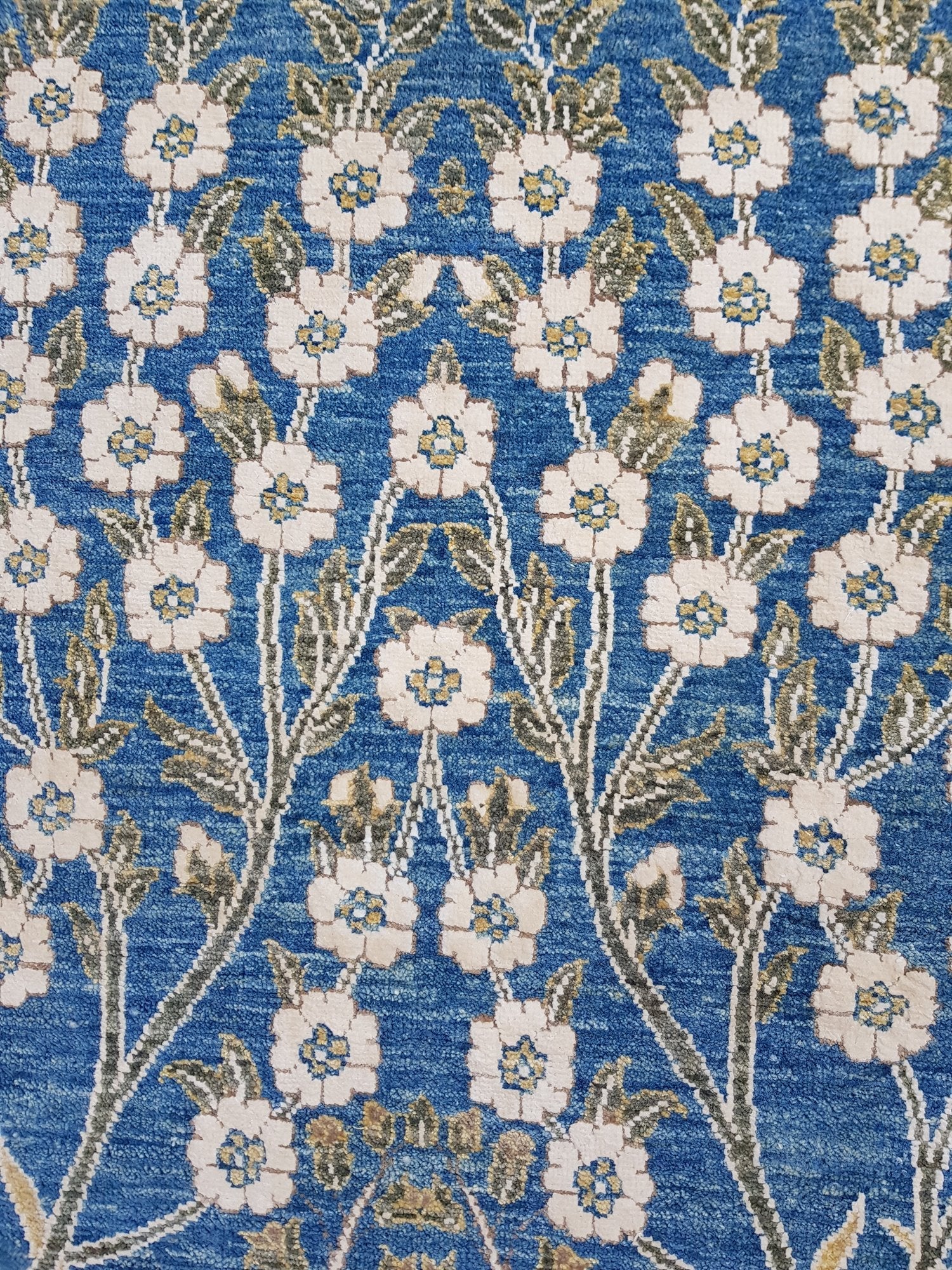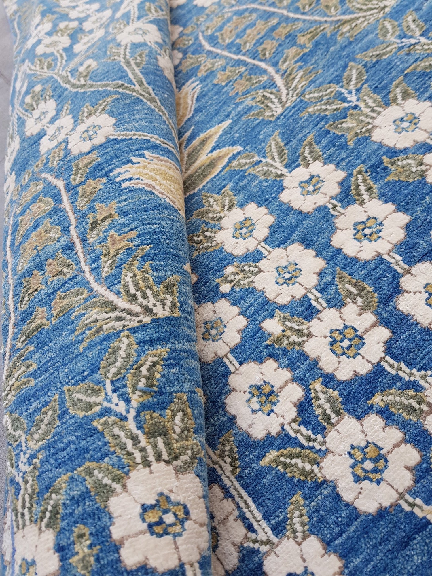 Show off your exquisite taste with our beautiful Moghul Flower Handwoven Contemporary Rug (J64111). It’s a prime example of a contemporary Botanical done right and will add a unique, polished look to your space. Crafted mainly in blue and complemented with medium blue and olive, the Moghul Flower design really pops. The wool & silk pile surface is resilient yet comfortable and the cotton foundation provides a sturdy base. This 5' 1" X 7' 2" handwoven rug is of new construction and Afghanistan origin. All in all, you’re going to love this piece and it’s going to be the perfect addition to your home. Make it happen today — with your own Moghul Flower Handwoven Contemporary Rug.