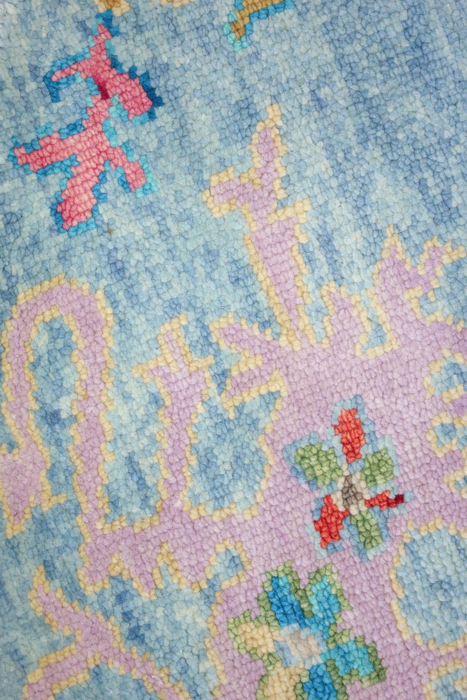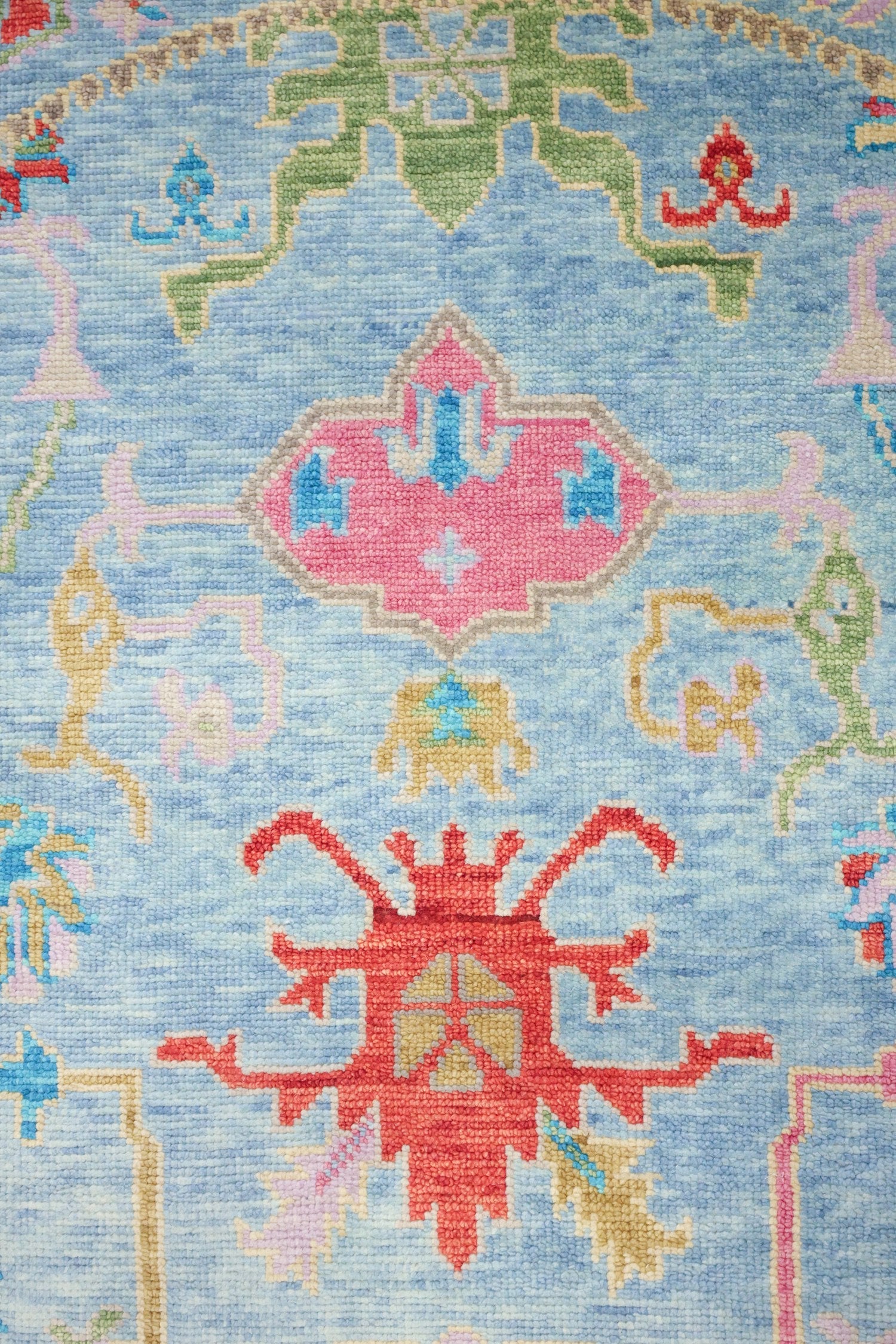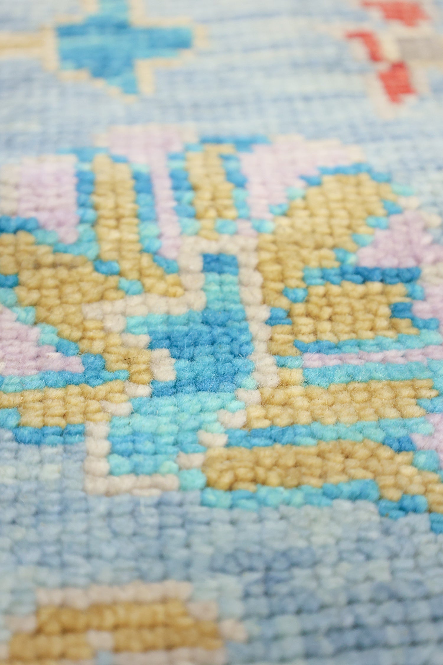 Soft Melody Oushak rugs resemble traditional 19th-century Turkish Oushaks, known for their thick knots. These rugs stand out due to their unique nubby texture at the base of each knot. While antique Oushaks often have a worn appearance, Soft Melody Oushaks embrace this aesthetic, adding depth and character to the design. The subdued pile of these rugs allows the texture to shine, avoiding a fluffy appearance that can detract from their visual appeal.