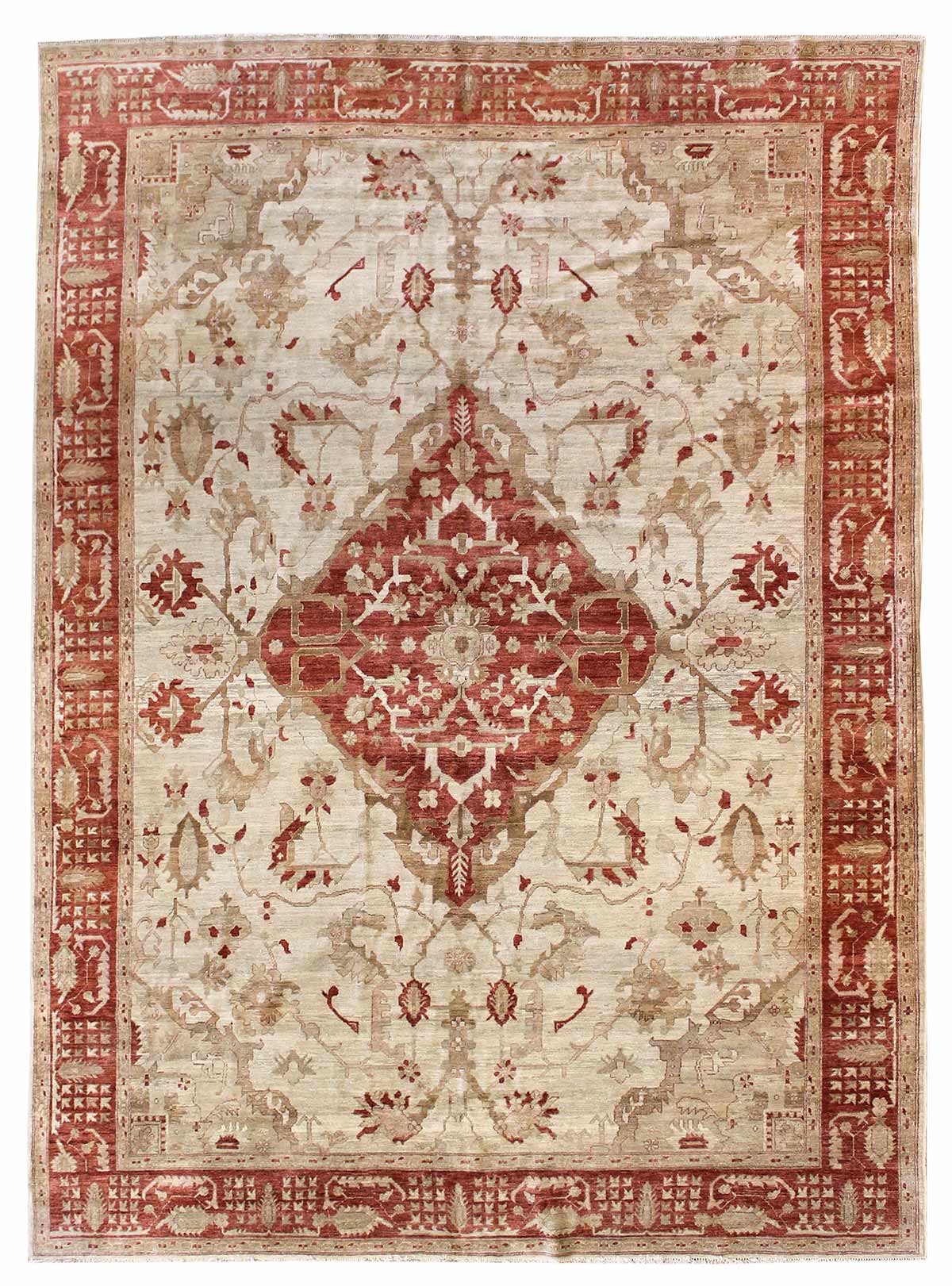 Introducing our exquisite new rug, originating from Afghanistan, specifically the Ghazni Province in the south-eastern region. This particular rug showcases the captivating design of Oushak, a style known for its tribal aesthetic. The background of the rug features a delightful ivory hue, complemented by a rust-colored border, creating a visually appealing contrast.