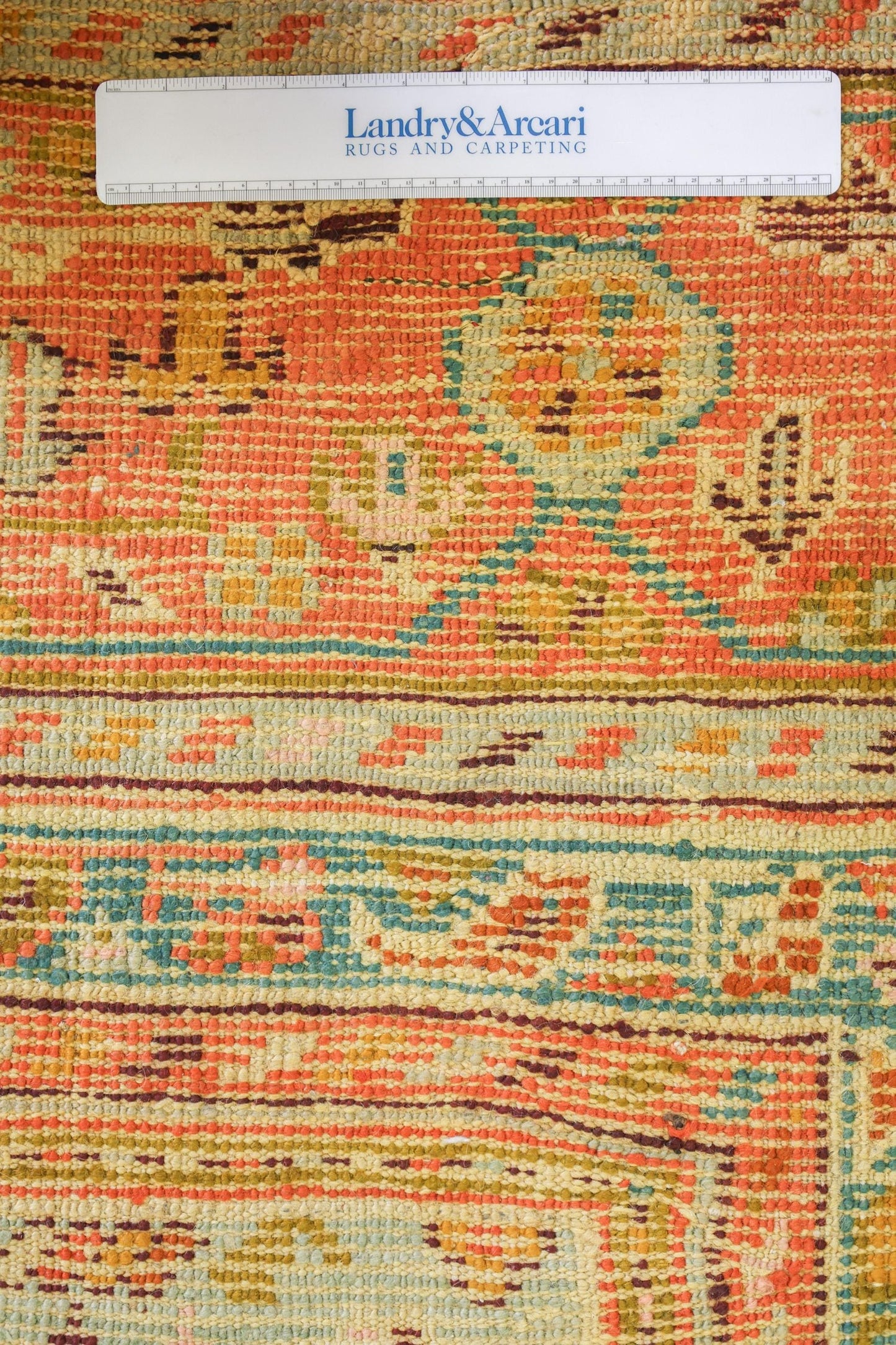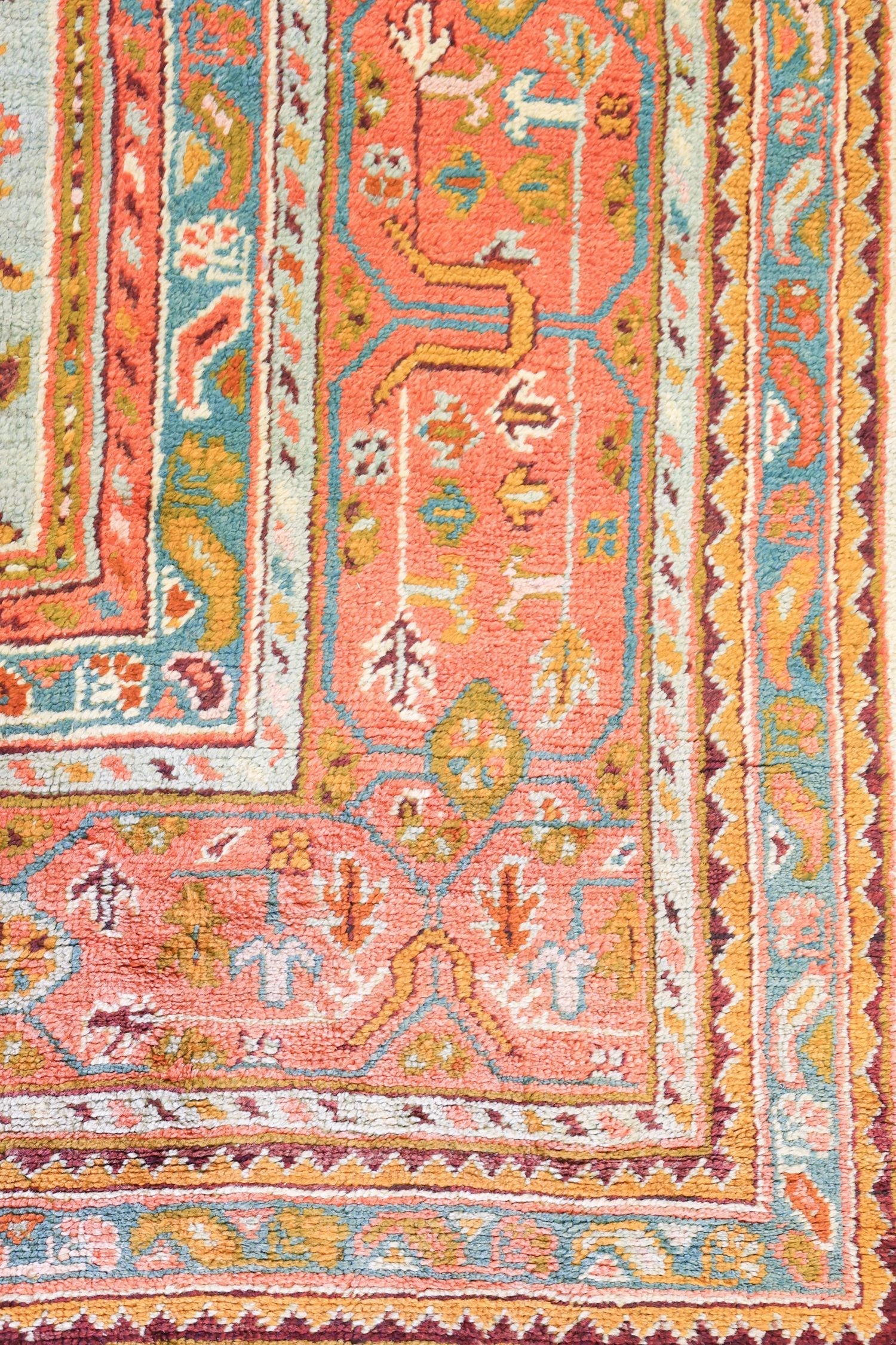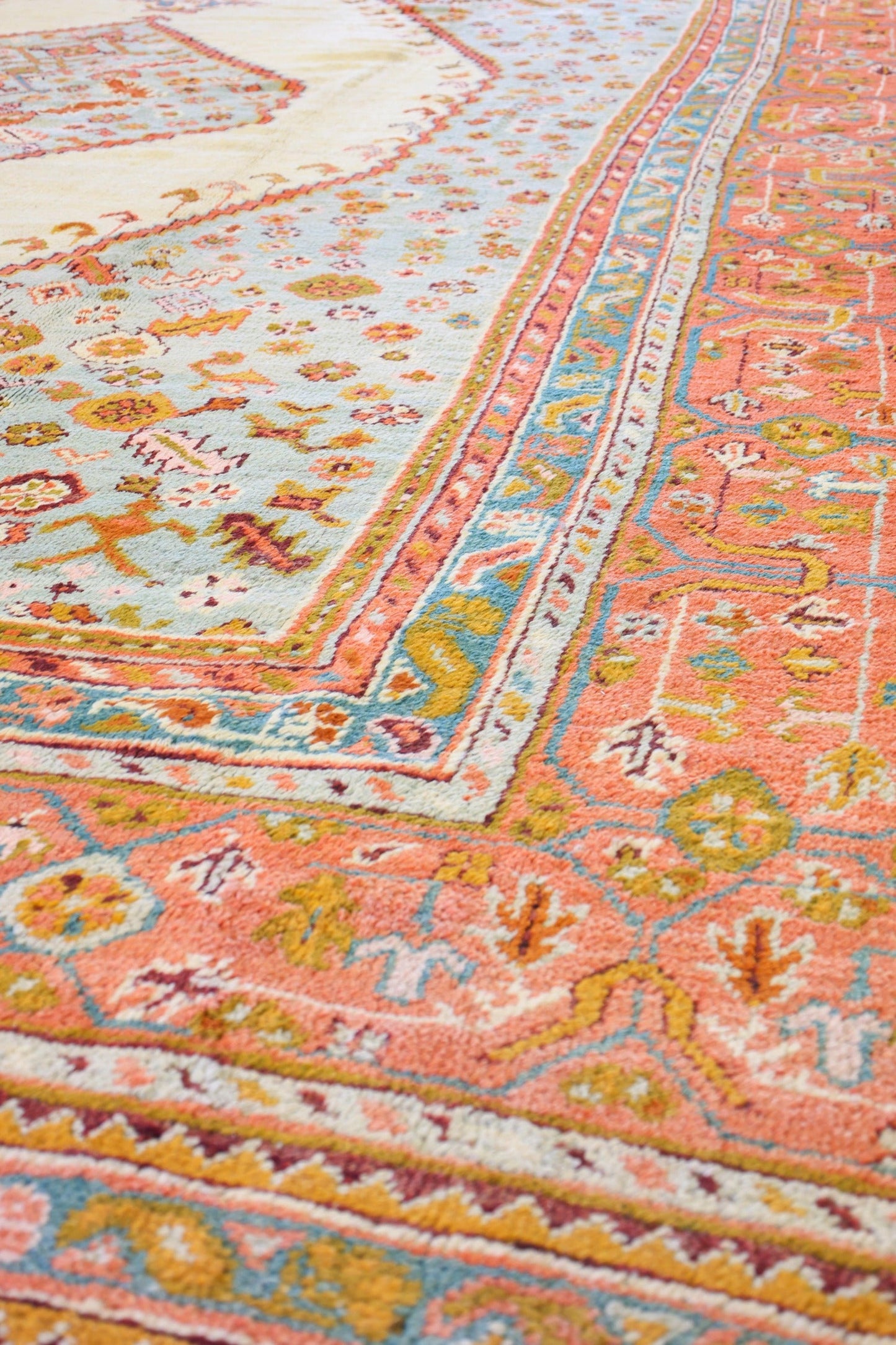 Overall, this Persian Oushak rug from circa 1880, with its ivory background and coral border, is a fine example of the enduring craftsmanship and intricate design that characterize antique Oushak rugs.