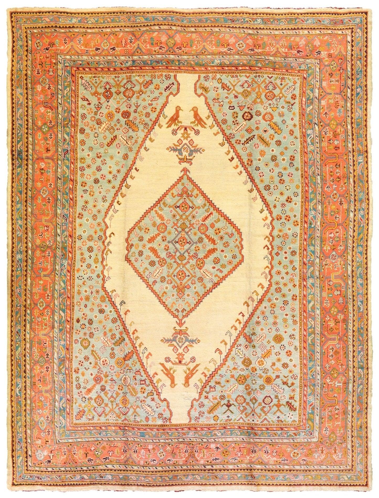 This Persian rug, crafted around 1880, showcases an Oushak design with tribal influences. The design background is primarily ivory, complemented by a coral-colored border. Handmade using wool on wool, this antique piece represents the rich textile heritage of the Oushak weaving tradition.