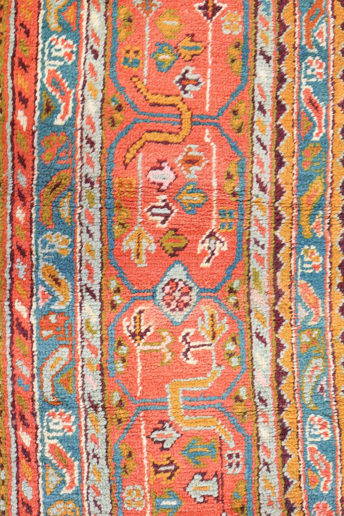The borders are a significant aspect of this rug's design, featuring multiple layers that frame the central medallion. The outermost border is coral-colored, adorned with repeating floral and geometric motifs in colors such as turquoise, white, green, and black. Inside this broad border are three thinner borders, consisting of a turquoise line flanked by narrower coral lanes, all intricately patterned.