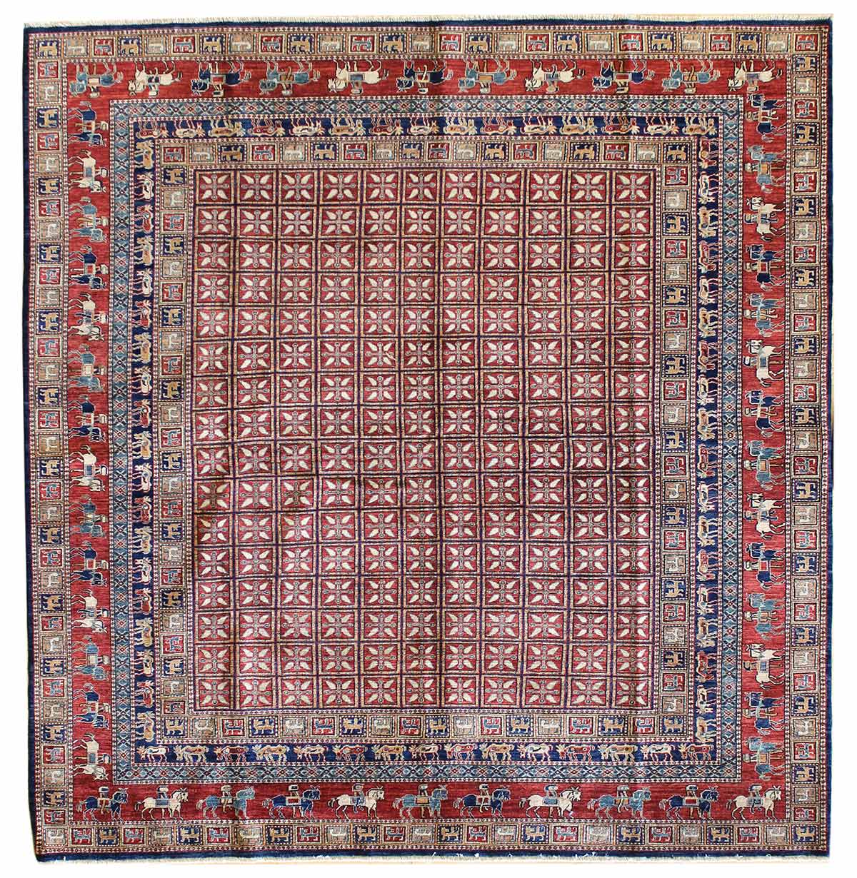 Make a grand statement in your home with our stunning Pazyryk Handwoven Tribal Rug (J45550). This tribal handwoven Afghani rug has an alluring Nomadic Persian & Turkish style with its Pazyryk design in rich hues of red and navy. Wool pile on a cotton foundation make this new rug both sturdy and comfortable to the touch. At 8' 2" X 9' 7" in size, this rug will add just the right amount of pizzazz to any room. All in, you’ll be loving this rug today, tomorrow, and beyond. So, go ahead — get your Pazyryk Handwoven Tribal Rug today!